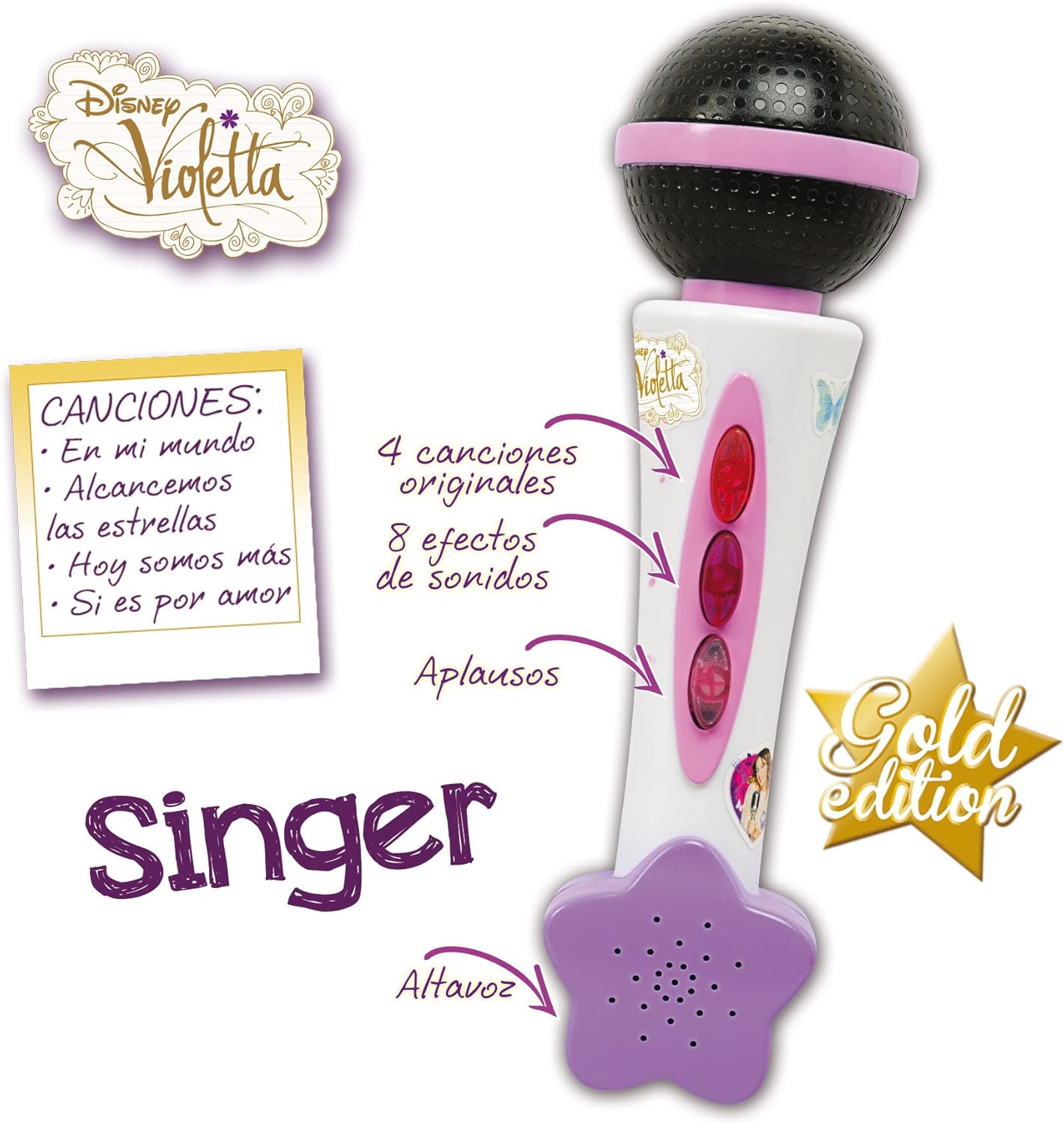 Microfono musicale concesso in licenza da Violetta Include 4 estratti dalle canzoni originali (Nel mio mondo, raggiungiamo le stelle, oggi siamo di più, se è per amore) 8 effetti sonori ed effetto applausi