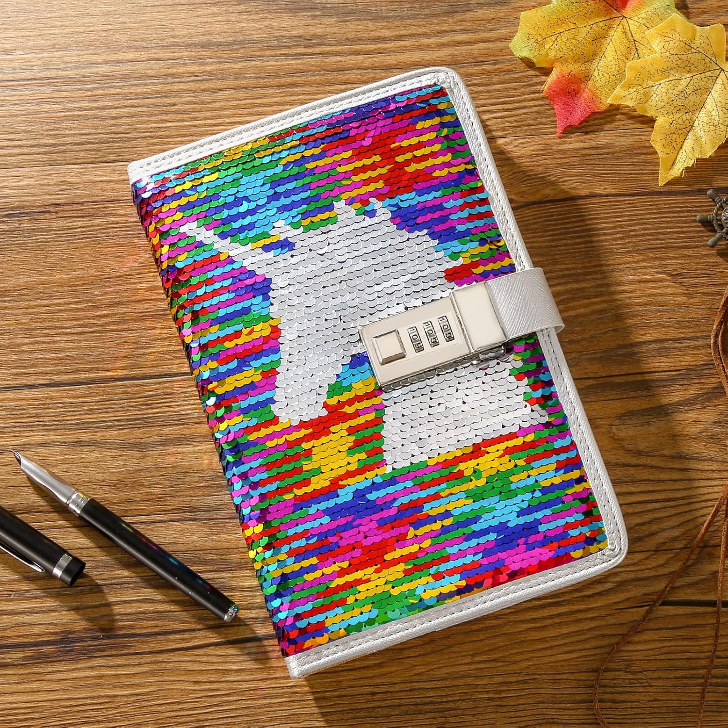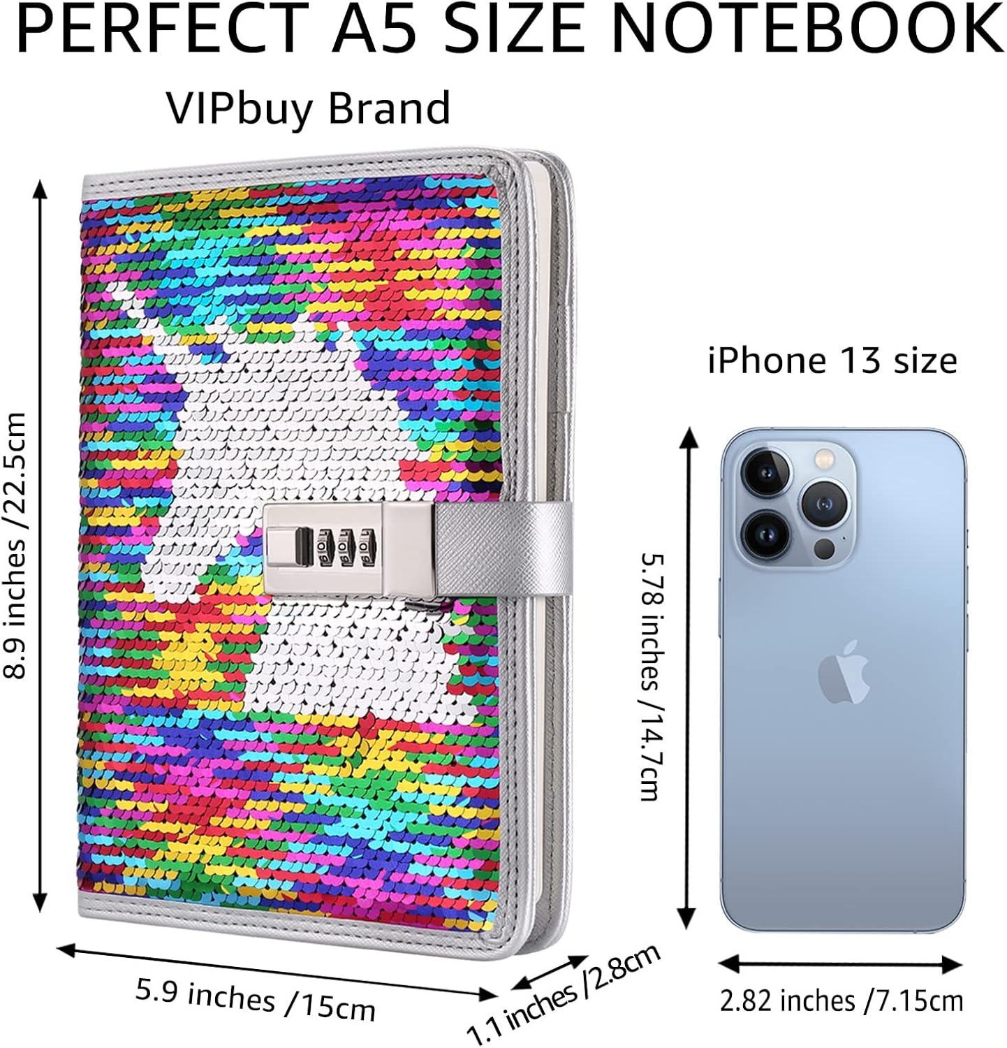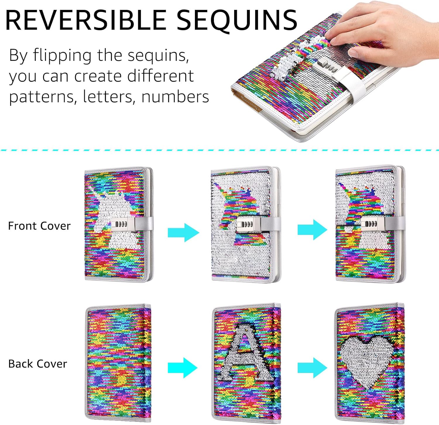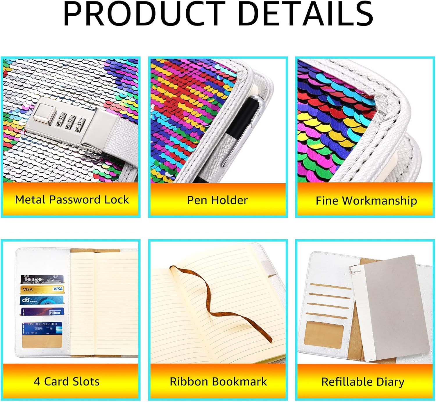 Lucchetto con combinazione a tre cifre: diario segreto con lucchetto a combinazione in metallo di alta qualità per proteggere la tua privacy. Diario scintillante: la copertina del diario glitterata fronte-retro è disponibile in due colori, la copertina è comoda e puoi girare le paillettes con le dita per creare diversi modelli fai-da-te per aiutarti a liberarti dallo stress della vita e del lavoro. Notebook staccabile: il guscio del notebook è ecologico e può essere riciclato più volte. Il taccuino glitterato è il regalo perfetto per le donne, è un'ottima scelta per tenere un diario e farti amare la creazione attraverso la cancelleria. Con carte portapenne: taccuino con portapenne e 4 slot per biglietti da visita, carte d'identità, carte bancarie, carte di credito, ecc. Facile da portare con te e registrare la tua creatività in qualsiasi momento. Nota: se non riesci ad aprire o dimentichi la password, contattaci e possiamo aiutarti ad aprirla e modificarla.