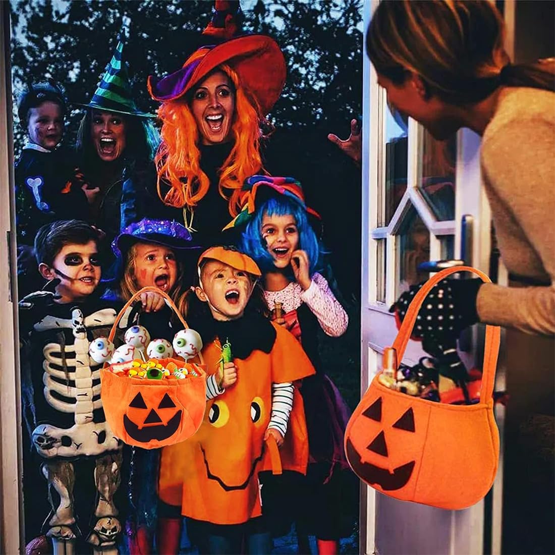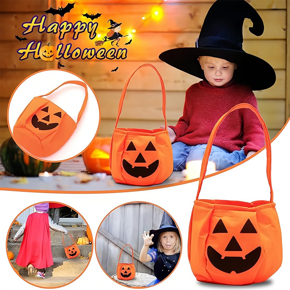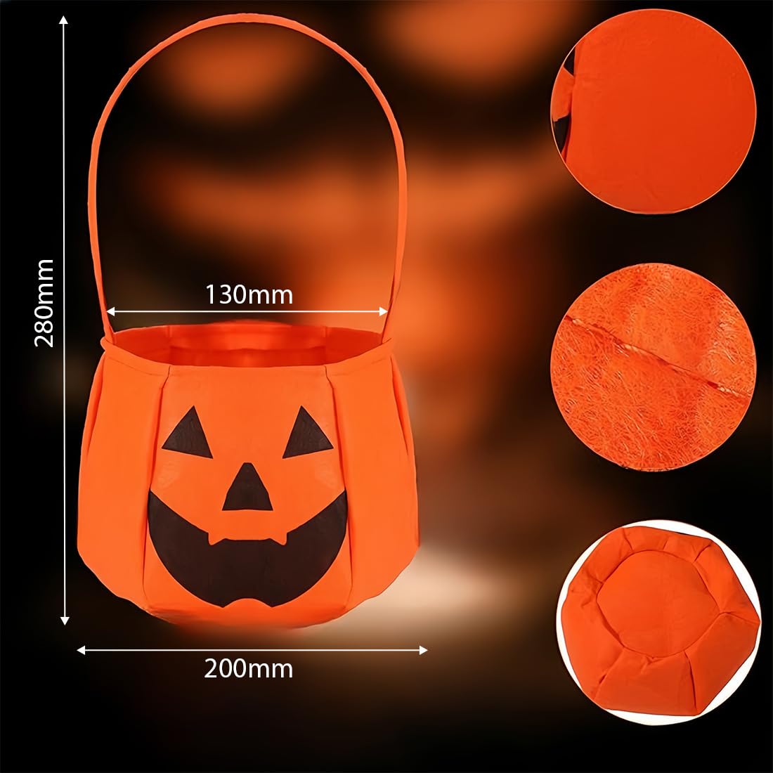Classico stile di Halloween: 2 sacchetti di zucca a forma dell'iconica zucca di Halloween nei colori arancione e nero, con facce divertenti sul viso, pieni di atmosfera festosa, che li rendono perfetti per i costumi di Halloween. Materiale tessile di alta qualità: realizzato con tessuti resistenti e durevoli, è morbido, non facile da danneggiare, ecologico e inodore. Può essere utilizzato per conservare piccoli oggetti come caramelle e può essere utilizzato a lungo. Pratico e di grande capacità: dimensioni adeguate e interni spaziosi possono facilmente ospitare un gran numero di caramelle, piccoli regali, ecc. È molto pratico sia per i bambini che fanno dolcetto o scherzetto o come decorazione per le feste. Design pratico della maniglia: dotato di una maniglia robusta, è facile da trasportare e non stanca le mani. È facile per i bambini uscire e chiedere caramelle o per gli adulti indossarlo per partecipare alle attività. Vari scenari di utilizzo: oltre alle caramelle di Halloween, possono anche essere utilizzate come decorazioni per feste, contenitori per regali o confezioni regalo per le vacanze, aggiungendo più gioia e sorprese al festival.