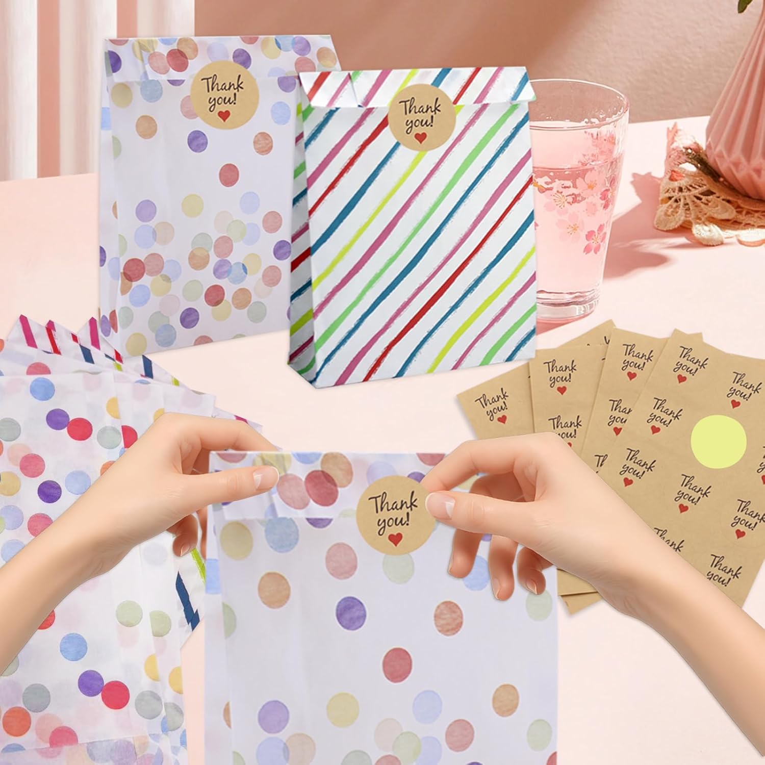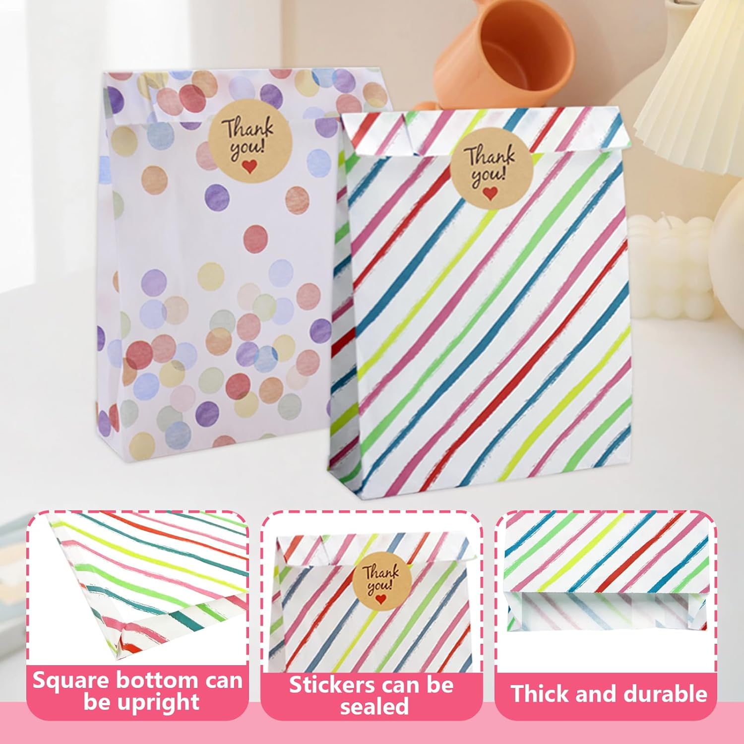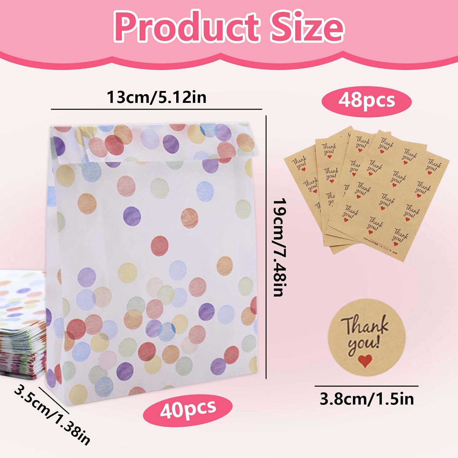 【Può contenere tutti i tipi di oggetti】Questi sacchetti regalo colorati per feste sono perfetti per conservare tutti i tipi di piccoli oggetti come caramelle, cioccolatini, biscotti, giocattoli, ecc. Regali intimi per amici e amanti in occasione di feste di compleanno, baby shower, matrimoni e altre celebrazioni. Quando non in uso, può essere piegato e compresso per riporlo facilmente. 【Design unico】 I sacchetti regalo sono progettati con tagli colorati e motivi a punti per aggiungere un tocco unico ai tuoi regali, assicurando che si distinguano e lascino un'impressione duratura. Il design intelligente del fondo pieghevole consente a queste borse di essere in posizione verticale e facili da trasportare.,Confezione da 40: il set comprende 40 sacchetti per bomboniere con sacchetti per bomboniere e 48 adesivi sigillanti per sigillare e fissare facilmente gli oggetti. Ideale per contenere un'ampia gamma di formati più piccoli