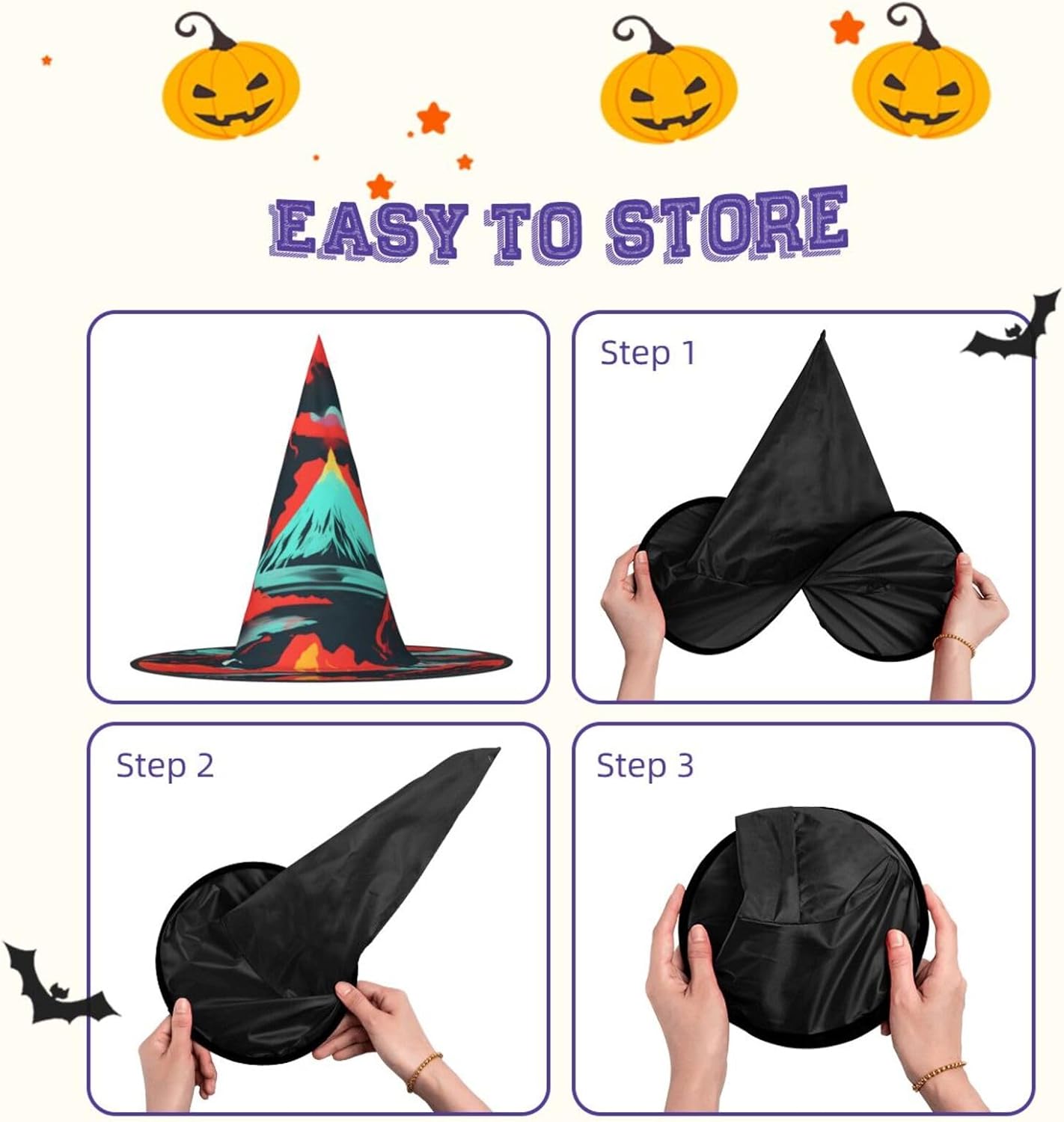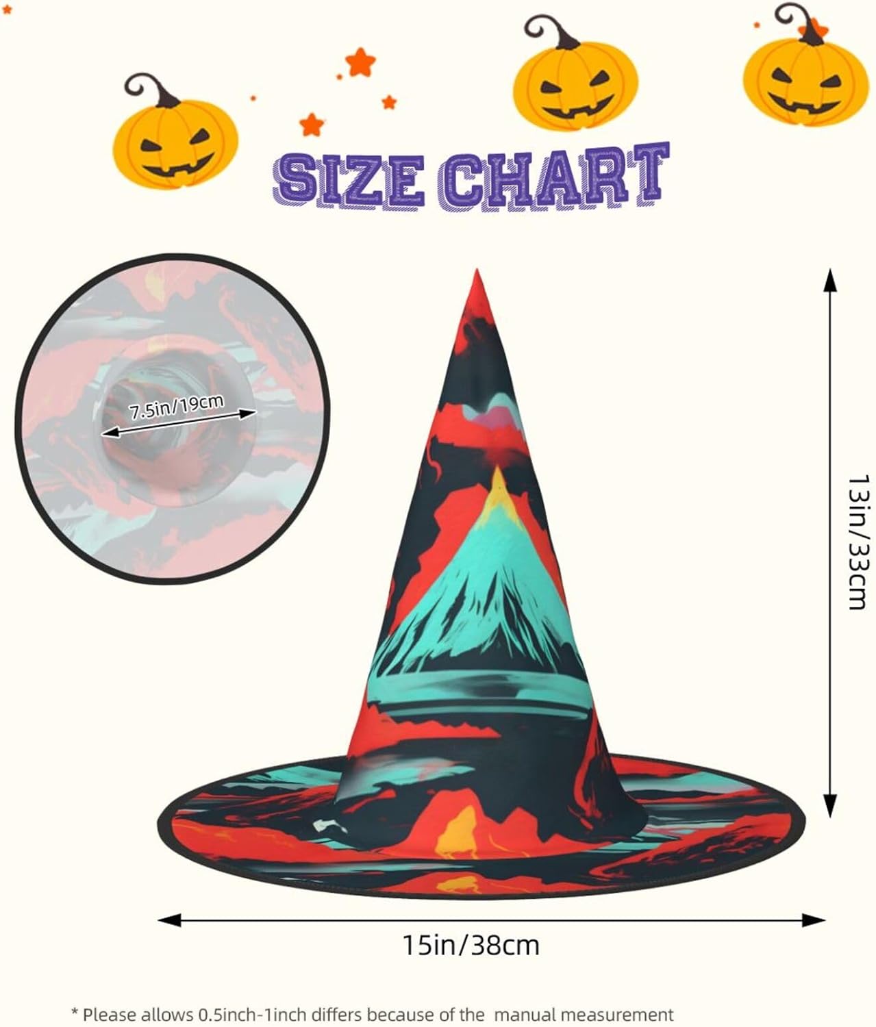 Realizzato con comodo panno Oxford, questo cappello da strega con stampa vulcano non è solo un accessorio; è un investimento per molte stagioni di Halloween a venire. Il design unico del cappello consente di restringere la parte superiore e la tesa di essere attorcigliata e piegata, rendendolo compatto e facile da riporre. Nonostante la sua struttura, è incredibilmente leggero e può essere trasportato ovunque senza problemi. Il nostro cappello da strega di Halloween con stampa vulcano Bloom è progettato per adattarsi comodamente alla maggior parte delle persone, rendendolo una scelta ideale per qualsiasi festa di Halloween, carnevale, mascherata o evento cosplay. Il suo design accattivante ti renderà il punto focale della festa.