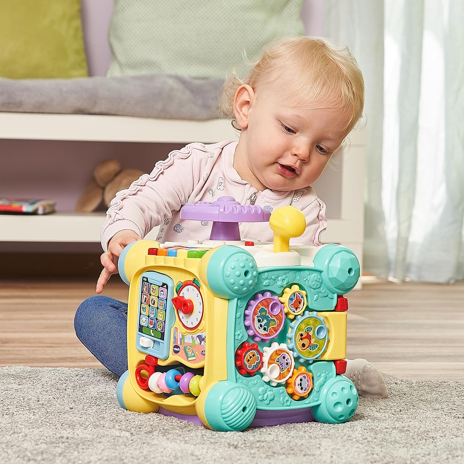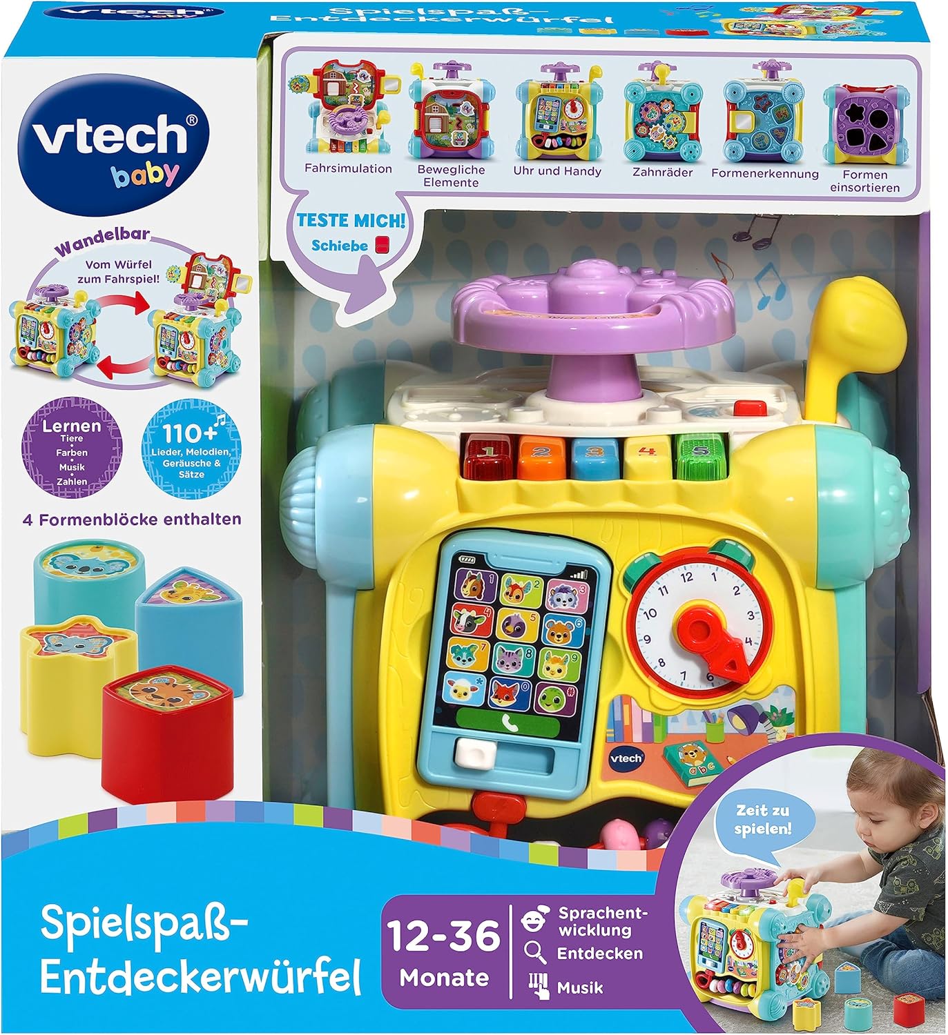 Divertimento giocando e imparando su 6 lati: con il cubo delle scoperte e numerosi elementi per premere, girare e spingere non vi annoierete sicuramente. Su ogni lato si trova un gioco interattivo con elementi di gioco in movimento sui temi della città, dell'oceano, del bosco, della scrivania, della guida dell'auto e delle forme da scoprire. I diversi lati del cubo con contenuti didattici su numeri, colori, tempi, animali e molto altro ancora garantiscono un divertimento vario. Il robusto giocattolo con 5 canzoni cantate e 15 melodie allena le capacità motorie, lo sviluppo del linguaggio e i sistemi sensoriali e invita a scoprire ed esplorare. Fornitura: 1 x VTech Baby Fun Discovery Cube / Vano batteria sicuro per bambini, controllo del volume e spegnimento automatico / Versione tedesca / Età: 12-36 mesi / 2 batterie demo AA/LR6 / Articolo n.: 80-557204