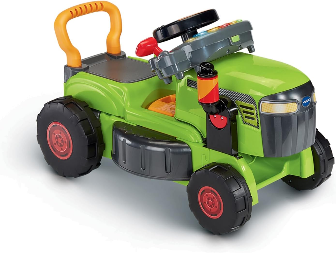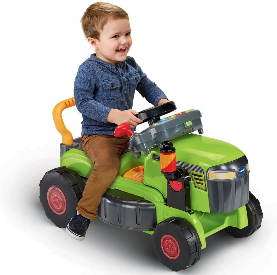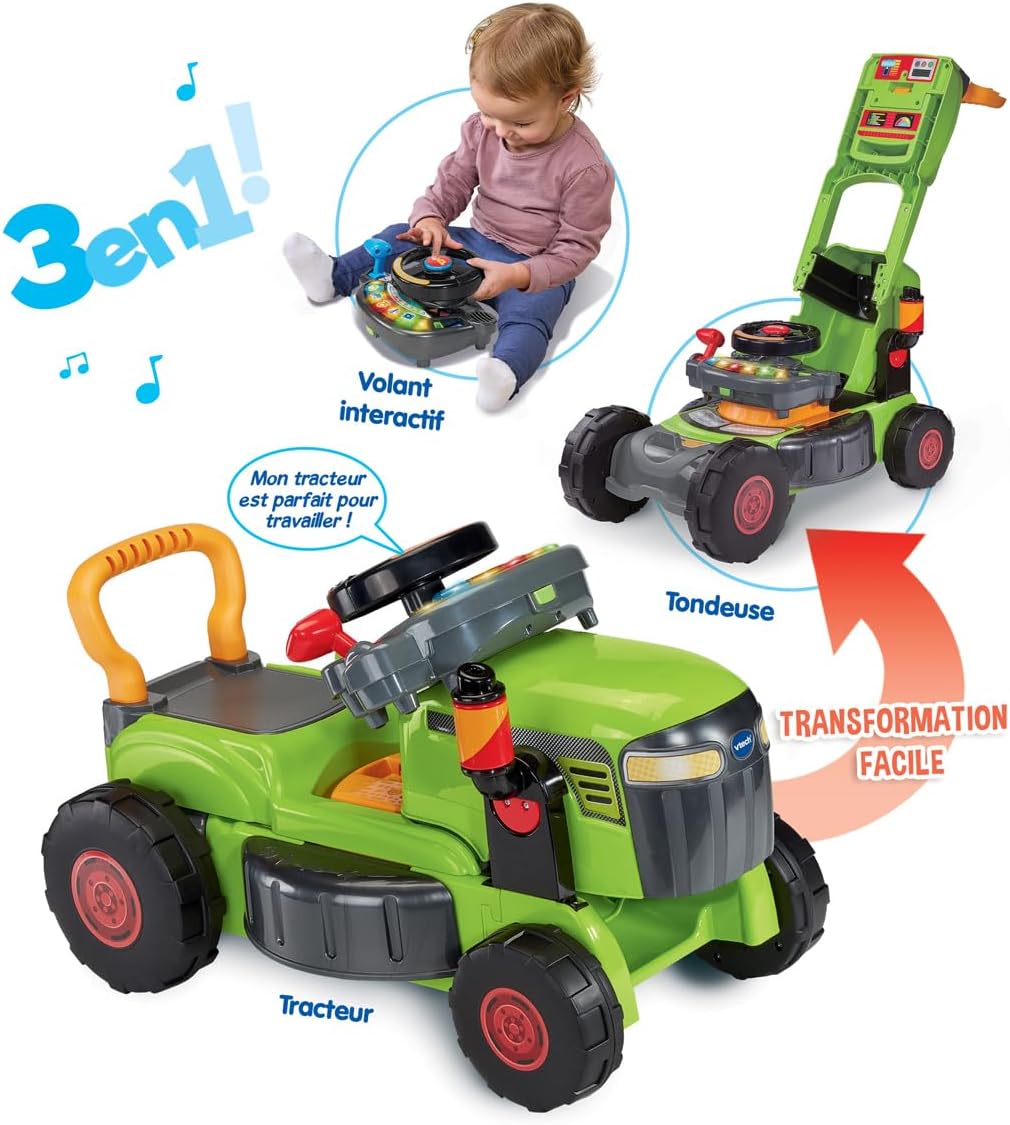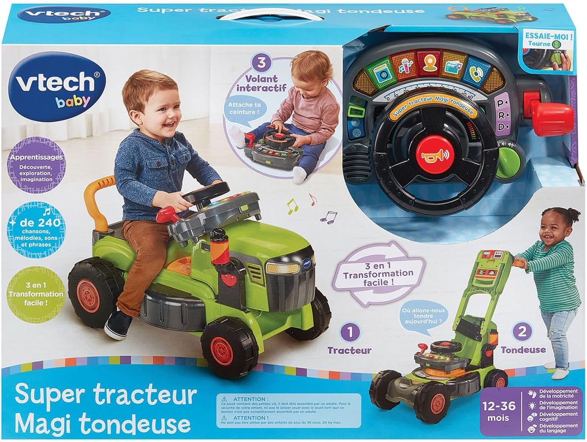 La versione francese di questo trattore 3 in 1 trasforma ogni fase dello sviluppo del Bambino in un'avventura magica! Da 1 anno il bambino può guidare, spingere o manipolare il volante interattivo per esplorare, divertirsi e rafforzare le capacità motorie imitando i grandi! Evolutivo, questo trattore giocattolo si adatta al bambino e segue il suo sviluppo grazie a 3 modalità di gioco facili da trasformare: 1/ in un portatore stabile per muoversi, 2/ In tosaerba da spingere per imparare a camminare, o 3/ Volando interattivo staccabile per giocare a guidare come un grande. Ogni trasformazione viene riconosciuta automaticamente e attiva contenuti adatti per l'apprendimento progressivo. TUTTE LE OPZIONI, la stazione di guida di questo spintore è dotata di un cruscotto interattivo per scoprire il codice della strada, ascoltare musica, imitare l'uso di GPS, radio e kit vivavoce. Il bambino troverà anche una rotellina per avviare la marcia, una leva del cambio, un clacson e un selettore meteo per scegliere il tempo che fa. Questo volante interattivo completamente attrezzato si stacca per portarlo ovunque. CONTENUTO: questo portatore trattore evolutivo canta 12 canzoni e suona 36 melodie. Regolazione del volume sonoro e spegnimento automatico del giocattolo. Funziona con 2 batterie LR6-AA incluse. VTECH BABY, è la gamma di giocattoli VTech prima età che accompagna in modo sicuro i bambini dalla nascita ai 3 anni nel loro sviluppo e primo apprendimento.