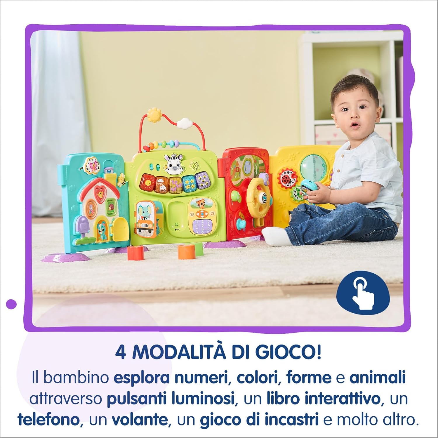 CENTRO ATTIVITÀ 3 IN 1: un centro attività modulare che cresce con il tuo bambino, offrendo un'esperienza di gioco completa e coinvolgente 4 LATI DI DIVERTIMENTO: questo maxi centro attività offre quattro lati di gioco interattivi per sviluppare la motricità fine e stimolare la curiosità del tuo piccolo PANNELLO ELETTRONICO INTERATTIVO: esplora colori, numeri e animali con 3 modalità di gioco, suona il pianoforte con 5 tasti luminosi e divertiti con il telefono per il gioco di imitazione SCOPERTE SENSORIALI: un pannello con ingranaggi, rulli e forme da ordinare, insieme a elementi come un'ape e una farfalla da toccare, per sviluppare le capacità motorie e la coordinazione occhio-mano MUSICA E APPRENDIMENTO: include 2 canzoni coinvolgenti e 10 melodie orecchiabili, spegnimento automatico e regolazione del volume per un'esperienza di gioco sicura e confortevole