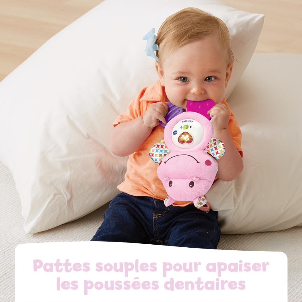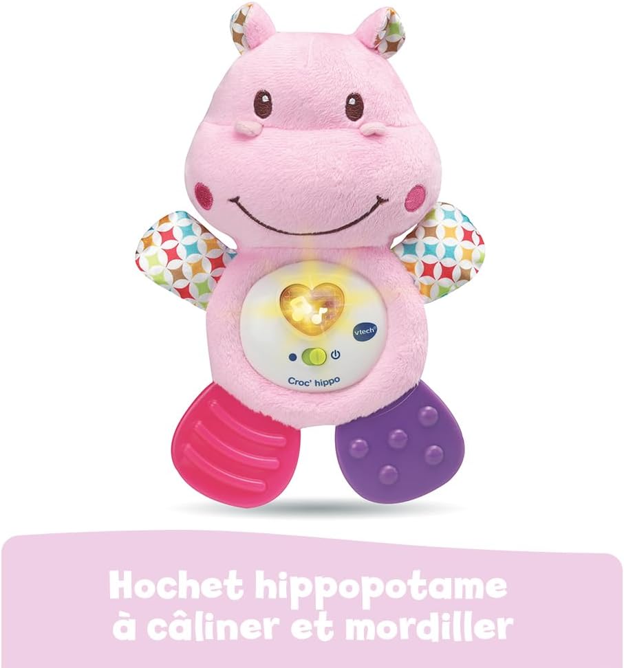 Un sonaglio musicale che calma i dentini del bambino! Versione francese Con diverse texture per stimolare i tuoi sensi: corpo morbido e gambe posteriori in morbida plastica Un pulsante luminoso a forma di cuore per attivare frasi, canzoni e dolci melodie Due morbide gambe da masticare per lenire le gengive e calmare i dentini da latte Modulo elettronico rimovibile per un facile lavaggio della parte tessile (solo lavaggio in superficie)