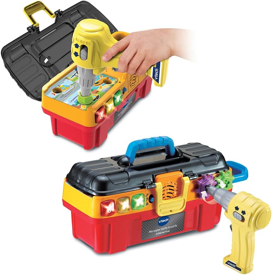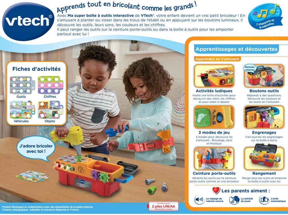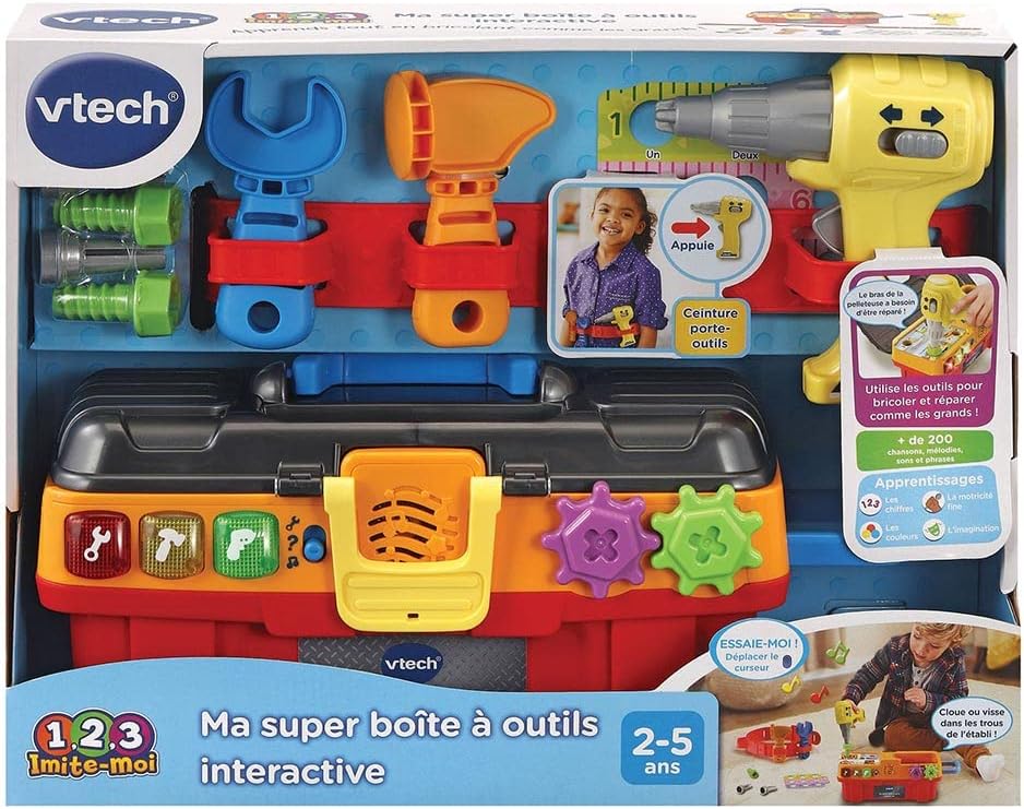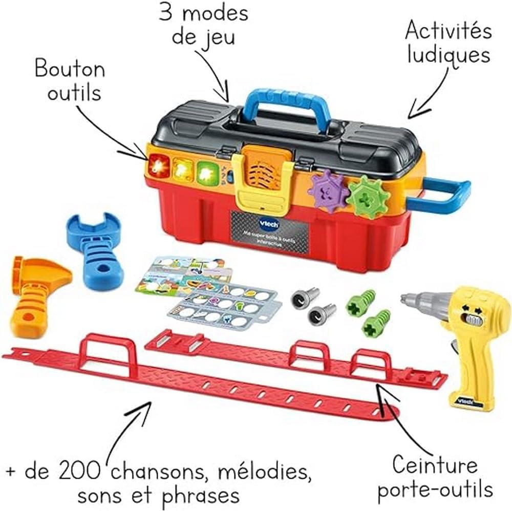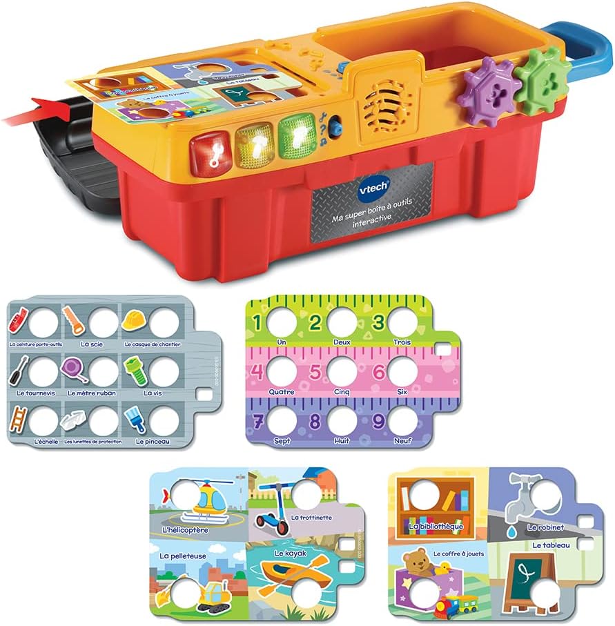 VERSIONE: francese. ETÀ: dai 2 ai 5 anni, una cassetta degli attrezzi ricca di accessori per divertirsi e sviluppare le capacità motorie. INTERATTIVO: Grazie alla sua cassetta degli attrezzi super interattiva, il bambino impara a dare un nome agli strumenti e al loro utilizzo. ABILITÀ MOTORIE: Le “schede progetto fai da te” presenti nella cassetta degli attrezzi (2 schede fronte-retro) permettono al bambino di esercitarsi in attività di avvitamento e inchiodatura, e quindi di sviluppare le sue capacità motorie. APPRENDIMENTO: la mia cassetta degli attrezzi super interattiva ti consente anche di imparare numeri e colori.