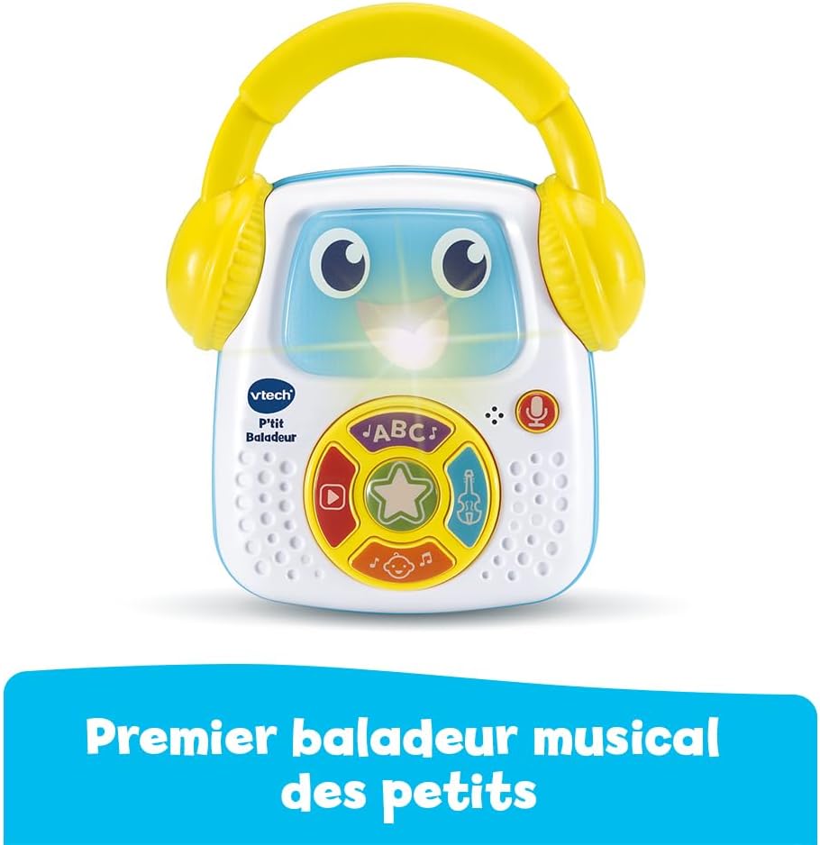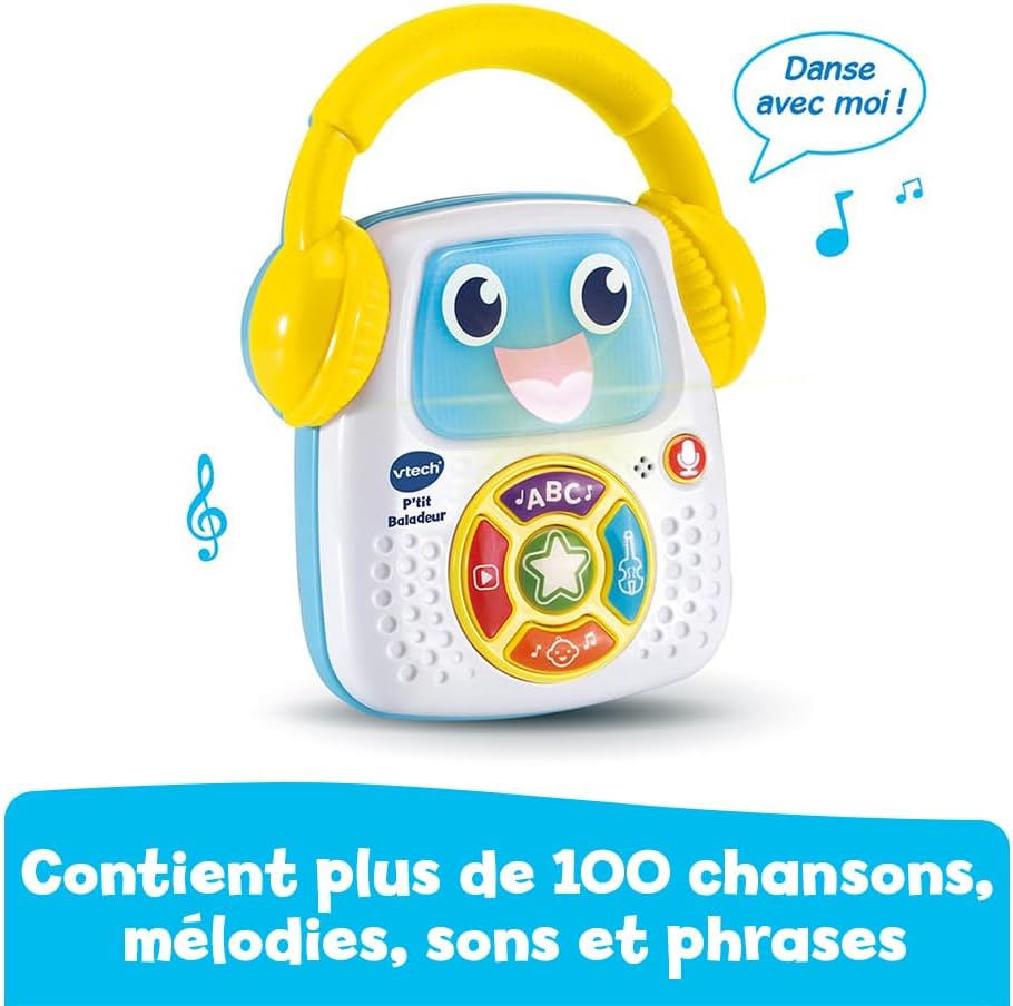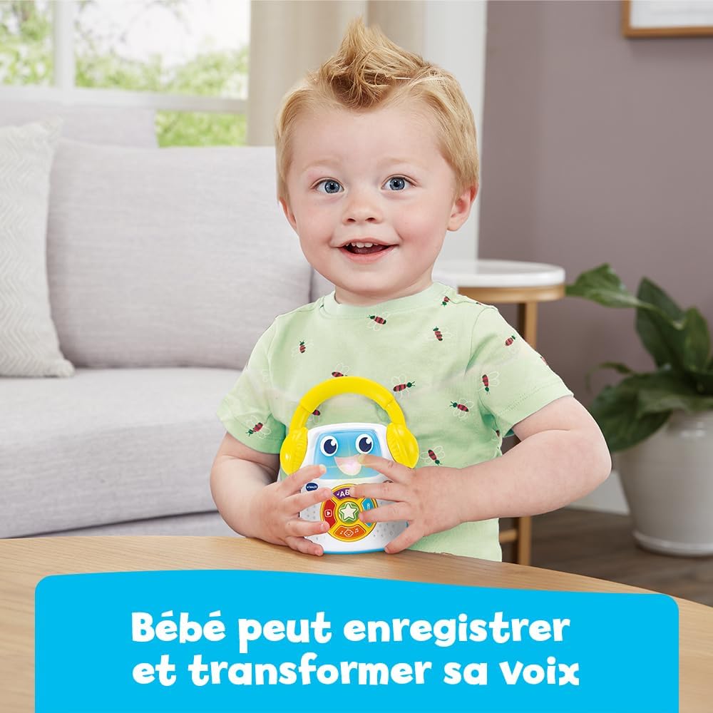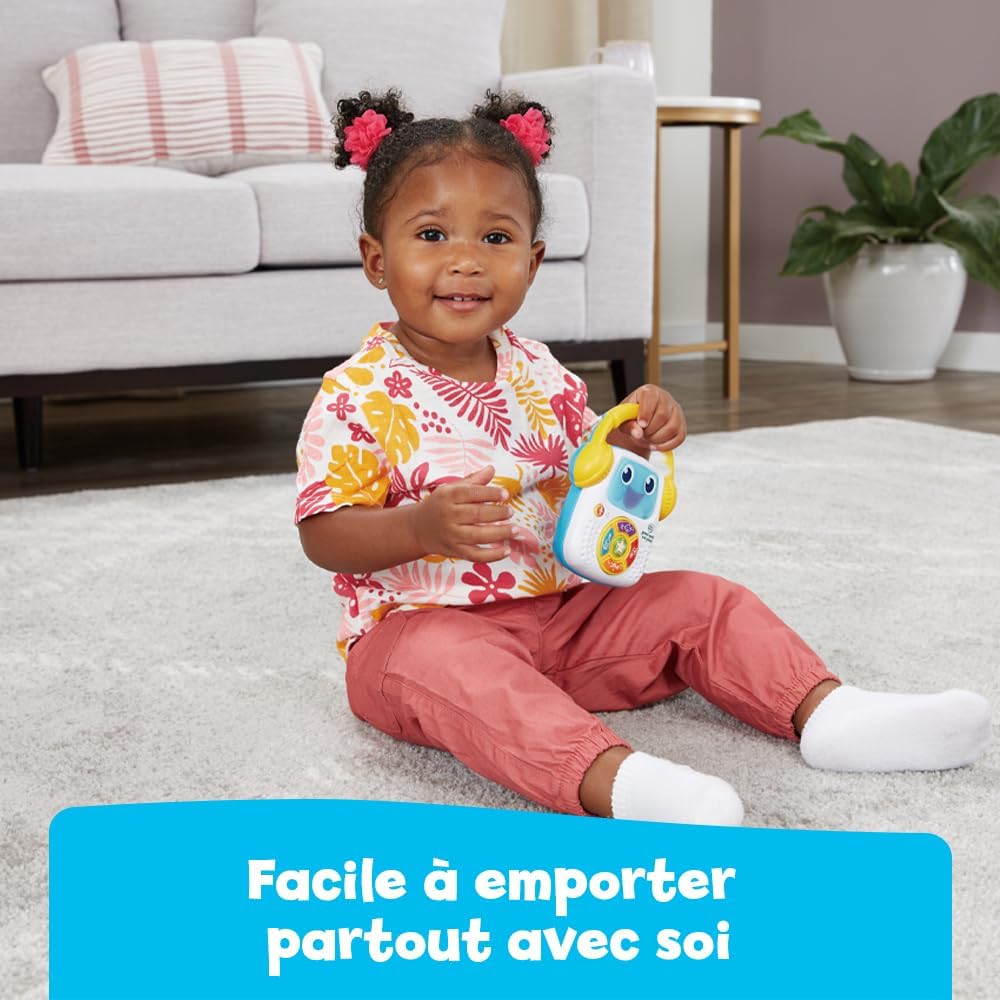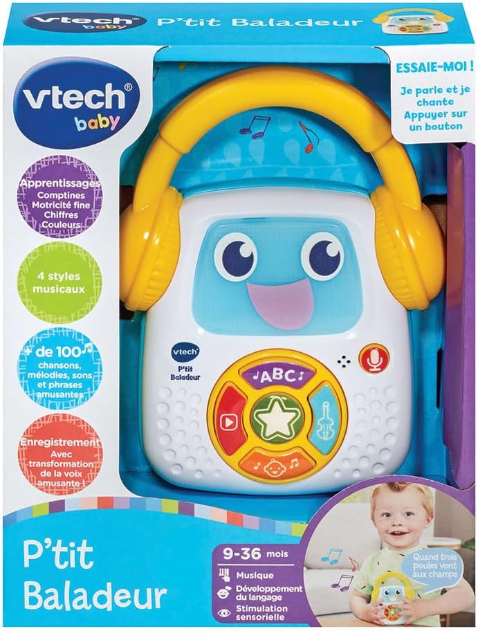 LA VERSIONE FRANCESE di questo primo lettore musicale VTech Baby contribuisce al risveglio musicale e allo sviluppo del linguaggio dei bambini a partire dai 9 mesi, ovunque si trovino! REGISTRA la tua voce per lasciare un simpatico messaggio per Baby! Questa funzione semplice ed intuitiva permette anche al bambino di divertirsi a registrarsi! DA PORTARE OVUNQUE! Le sue dimensioni compatte e il manico adatto alle mani piccole ti permettono di averlo sempre con te! CONTENUTO: Questo giocattolo musicale contiene 5 modalità di gioco, canta 8 canzoni e riproduce 22 melodie. Regolazione del volume del suono e spegnimento automatico del giocattolo. Funziona con 3 batterie LR03-AAA in dotazione. VTECH BABY è la gamma VTech di giocattoli per la prima infanzia che supporta in sicurezza i bambini dalla nascita ai 3 anni nel loro sviluppo e nel primo apprendimento.