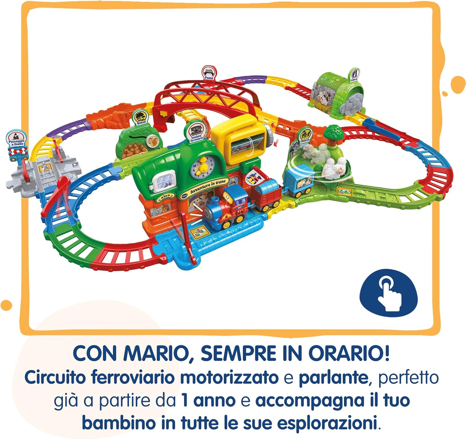 AVVENTURE EMOZIONANTI: un grande playset ferroviario ricco di ostacoli ed elementi interattivi, perfetto per far vivere ai tuoi bambini avventure in movimento sempre nuove ed entusiasmanti PERCORSO DINAMICO: aiuta Mario il treno a superare la stazione, il bosco, la galleria e gli ostacoli lungo il percorso; grazie agli scambi sui binari, potrà cambiare strada e attraversare rapidamente il ponte 6 ZONE MAGICHE: scopri le 6 Zone Magiche interattive che attivano frasi divertenti, canzoni coinvolgenti e suoni realistici, rendendo il gioco ancora più ricco e stimolante MARIO IL TRENO: include Mario, un veicolo elettronico e motorizzato sempre puntuale, pronto a sfrecciare lungo i binari per nuove avventure; il veicolo si spegne automaticamente per risparmiare energia COMPATIBILITÀ UNIVERSALE: compatibile con tutti i veicoli e i playset Vroom Vroom Go, questo trenino offre infinite possibilità di gioco e divertimento, stimolando la creatività e l'immaginazione dei tuoi bambini