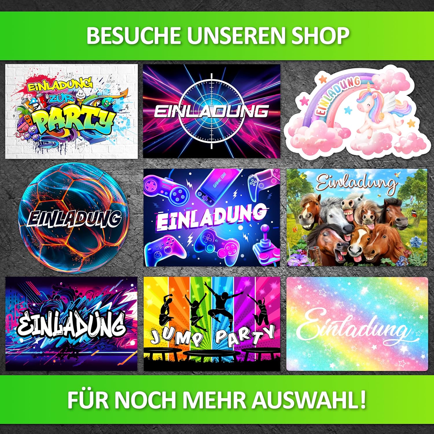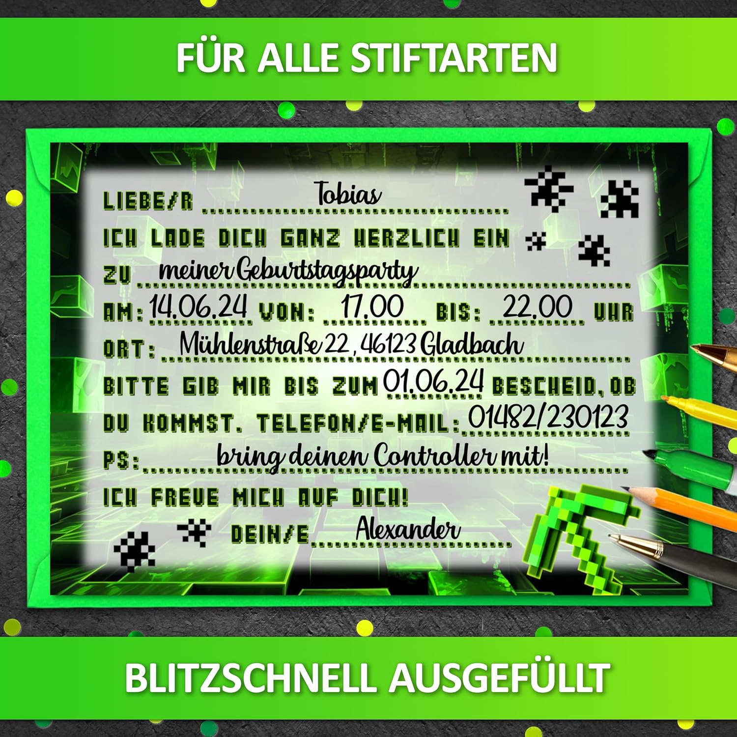Versatile: per feste di gioco per bambini, feste di compleanno per bambini, feste di compleanno per bambini, feste notturne o torneo di videogiochi, le carte da gioco sono l'invito alla festa per ragazzi, amici, giocatori Unico: il nostro fantastico set di carte da gioco è l'accessorio per ogni festa di compleanno per bambini – possono essere facilmente distribuiti come pensierino nella cerchia di amici, scuola materna o associazione Vera qualità: i nostri biglietti d'invito sono prodotti in Germania: gli inviti di compleanno in carta riciclabile da 350 g di alta qualità sono rifiniti con speciali processi di stampa Formato ottimale: i biglietti d'invito per feste DIN A6 offrono spazio per tutte le informazioni importanti e sono scrivibili con tutte le penne comuni: sono il ricordo dell'infanzia per ogni amico Il biglietto d'invito perfetto: con i 12 divertenti inviti per feste in stile gioco + 12 buste verde neon garantiscono che tutti gli ospiti siano amici e adolescenti alla festa di compleanno!