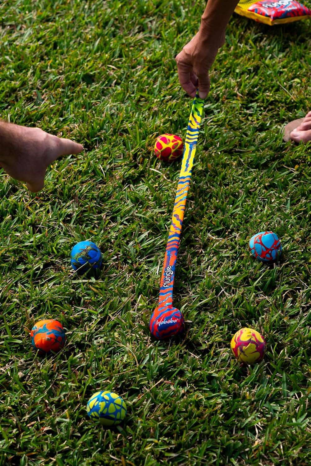 NUOVO GIOCO DI BALL TOSS CON UNA CODA: Alla ricerca di divertenti giochi all'aperto? Presentazione del nuovo gioco di lancio della palla di Waboba con una torsione! A differenza di altri set di bocce ball, FLUNGLE presenta un bersaglio che si lancia per la coda, e 6 palline di sabbia che si lancia per vedere chi atterra più vicino al bersaglio. Si utilizza anche la coda per misurare e calcolare punti una volta che tutte le palle sono state lanciate. Ogni colore sulla coda rappresenta un punto diverso. Aggiungi ogni round e gioca a 21 punti. GIOCA SULL'ERBA, LA SABBIA O ALL'INTERNO: FLUNGLE è fatto per giocare su una varietà di superfici. FLUNGLE nella giungla o ovunque tu voglia giocare! È divertente per i giochi in spiaggia, i giochi in giardino e anche un ottimo giocattolo da viaggio per le soste aeroportuali. Le palline di sabbia morbida non ammaccano o graffiano i pavimenti se giochi in casa o in ufficio. Inoltre, le palline di sabbia possono rotolare e saltare, rendendolo più unico dei giochi di bocce standard. 2-6 GIOCATORI: Dopo aver lanciato il bersaglio Tailball per impostare la sfida, dividere le 6 palline di sabbia per colore o modello per giocatore. Invece di semplici palline di colore solido, i giocatori ottengono palline colorate in stili fantastici che sono facili da vedere nell'erba. Gioca con due o sei persone. È un ottimo gioco da cortile per familiari e amici. FLUNGLE è divertente per tutte le età: bambini e adulti! Compatto e portatile: più compatto e più piccolo delle bocce, FLUNGLE è facile da trasportare per vacanze, gite nel fine settimana, giochi in spiaggia e anche per giochi in campeggio. Piccola borsa per il trasporto inclusa in modo da poter mantenere il set organizzato e facile da afferrare. Le palline di sabbia hanno un diametro di 5,1 cm. Il set completo pesa 1,8 kg e la borsa è alta 20,3 cm, il che lo rende un ottimo gioco per adattarsi a valigie, zaini e borse da spiaggia. Morbidi e durevoli: tutte le palline sono imballate con sabbia naturale, che le rende più morbide e soddisfacenti da tenere in mano rispetto alle grandi palle da bocce pesanti. Le palline di sabbia sono dotate di una copertura in lycra resistente per resistere all'impatto del gioco.