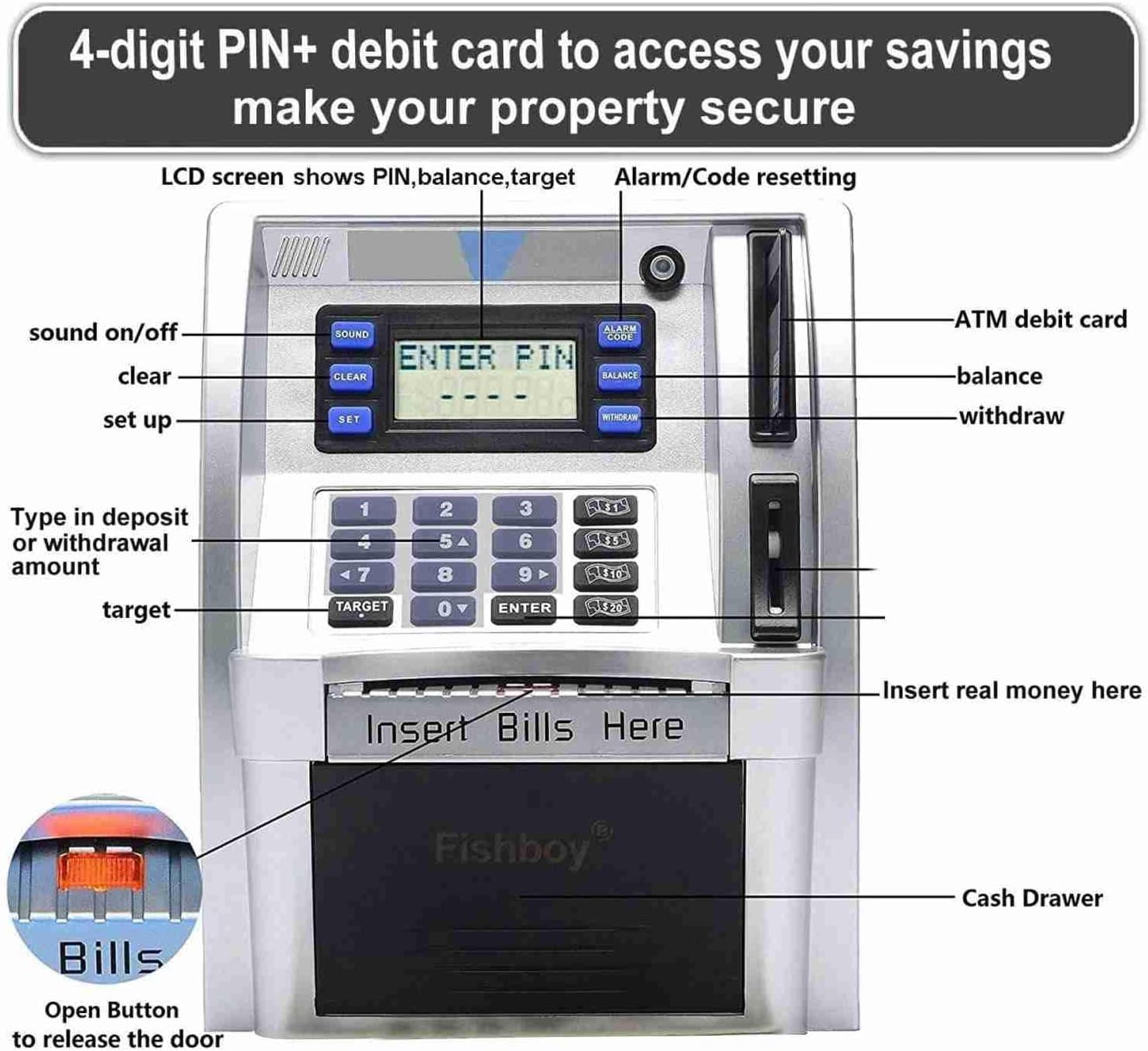 [Fun Money Management] offre ai bambini un modo interattivo per risparmiare e apprendere le finanze [Calcolo della valuta preciso] La fessura di valuta ha una precisione per ogni valuta che è stata inserita semplice persecuzione [Easy Accounting Management] Rotola automatica della valuta cartacea con opzione di input manuale disponibile [Sparmonitor] Impostare e adattare l'obiettivo di risparmio sullo schermo LCD per l'educazione finanziaria [Sicurezza con un livello di livello superiore] Pin Codice consente un facile ripristino per la massima protezione del risparmio