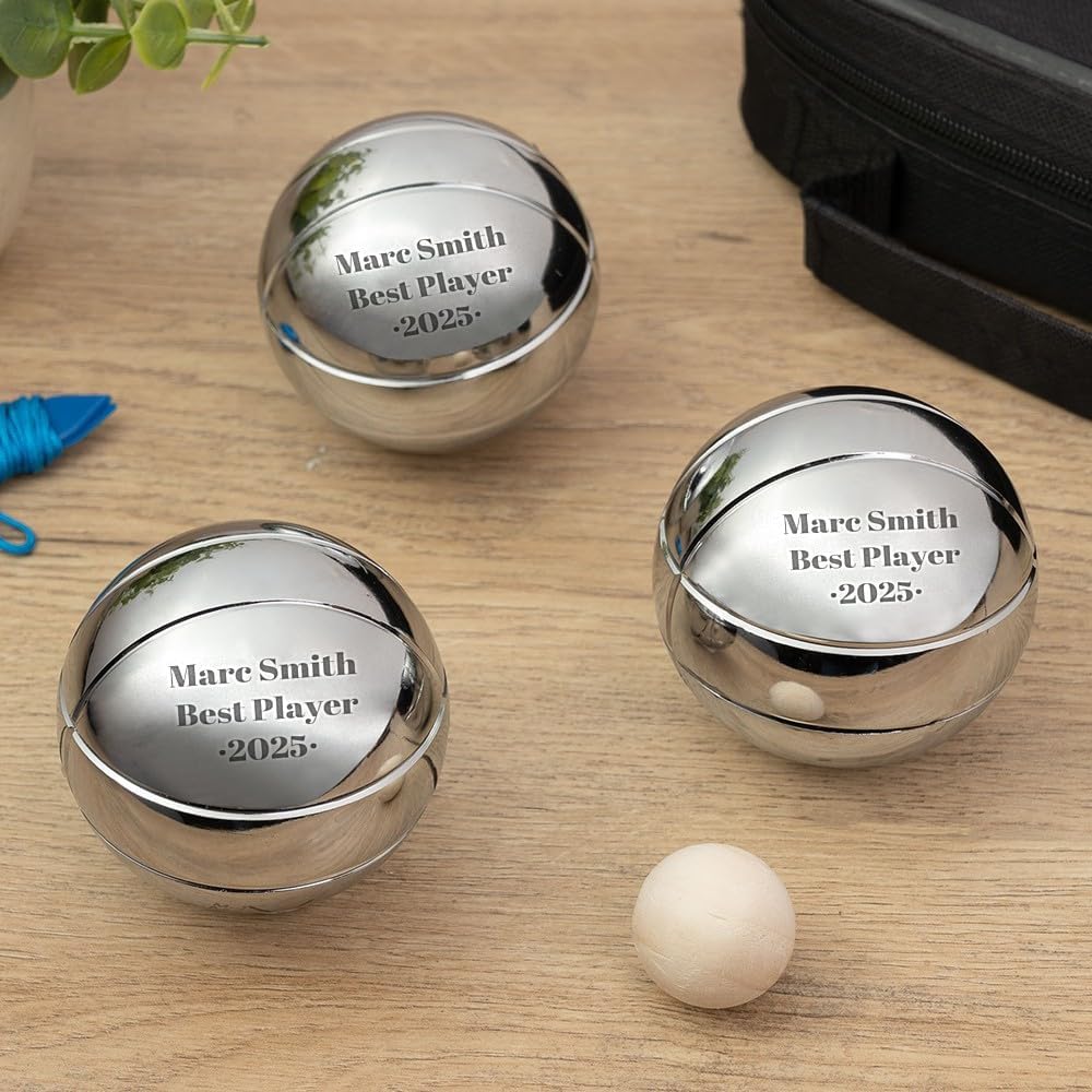 📏【DIMENSIONI】22,5 cm (larghezza) x 7 cm (altezza) x 7,5 cm (profondità). ⚪【INCLUSO】Set composto da 3 bocce metalliche, 1 metro a nastro e 1 pallina in legno. Il metro incluso è un dettaglio pratico che permette di risolvere facilmente qualsiasi dubbio su chi si sia avvicinato di più al boccino, mentre la pallina in legno aggiunge quel fascino rustico tipico di questo sport di origine francese. ✏️【TESTO PERSONALIZZABILE】Le tre bocce saranno personalizzate con lo stesso nome. 👜【TRASPORTO】Include una borsa da trasporto con manico, per riporre e trasportare facilmente tutto fino al campo di gioco. 🦾【MATERIALE】Le bocce metalliche sono realizzate in un materiale durevole che garantisce un utilizzo prolungato, anche su superfici diverse come ghiaia, erba o sabbia. Il loro peso e le dimensioni sono accuratamente bilanciati per rispettare gli standard di gioco, assicurando un lancio comodo e preciso. ✨【PERSONALIZZA SENZA LIMITI】Trova questo design e molti altri sul nostro sito web. Grazie al nostro editor, puoi modificare ogni elemento dei modelli oppure crearne uno completamente nuovo. Vieni a trovarci per personalizzare secondo i tuoi desideri!