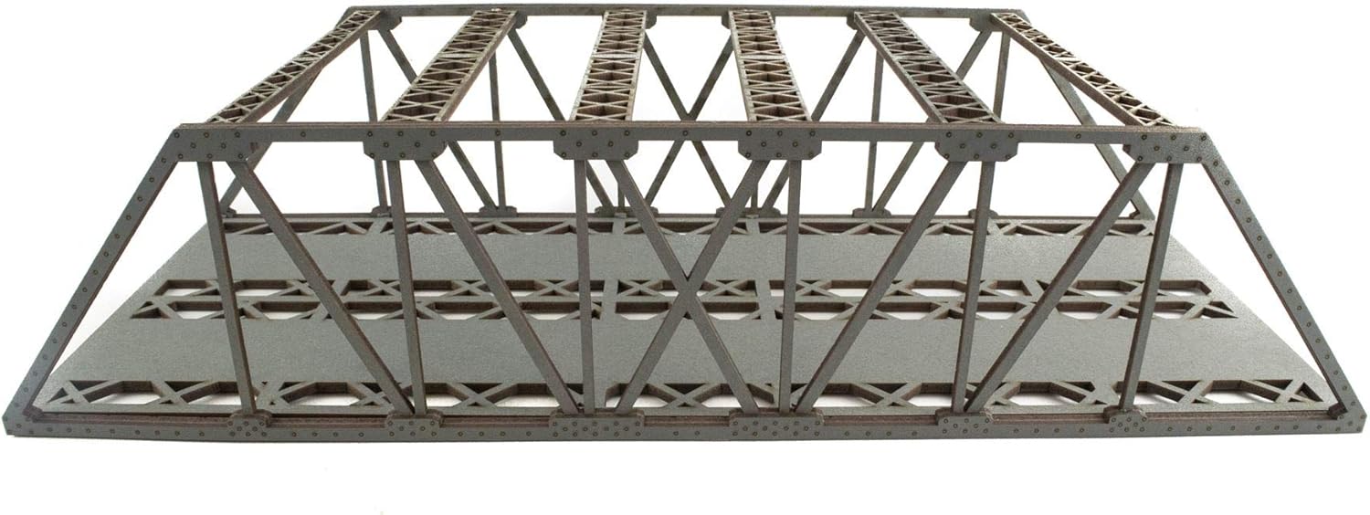 Ponte a Travatura Reticolare Binario Doppio Grigio da 450mm (high detail) della War World Scenics Realizzato in MDF (Truciolato di Media Densità) da 3mm tagliato a laser Facile da costruire e con rifiniture realistiche e robuste adatte ad ogni modello ferroviario in scala HO/OO Parte della nostra vasta gamma di scenari per modellismo ferroviario Dimensioni (L x L x A): 450x162x92 mm