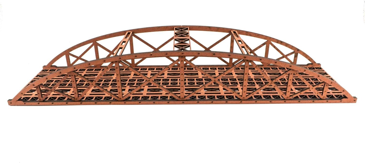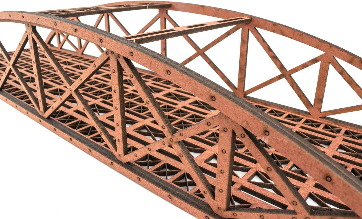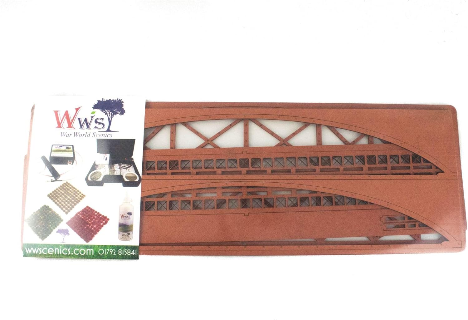 Ponte ad Arco con Binario Doppio Rosso da 560mm (high detail) della War World Scenics Realizzato in MDF (Truciolato di Media Densità) da 3mm tagliato a laser Facile da costruire e con rifiniture realistiche e robuste adatte ad ogni modello ferroviario in scala HO/OO Parte della nostra vasta gamma di scenari per modellismo ferroviario Dimensioni (L x L x A): 560 x145 x 85 mm