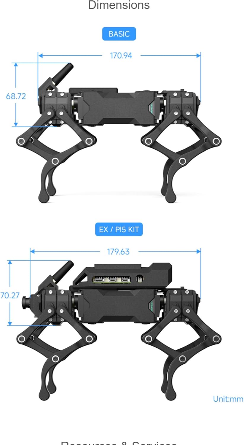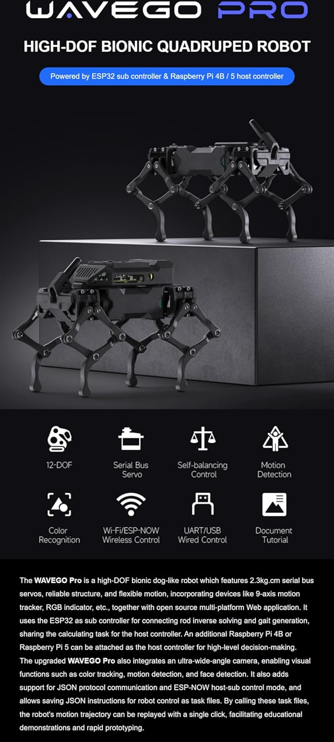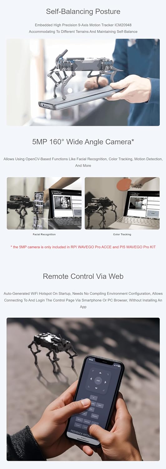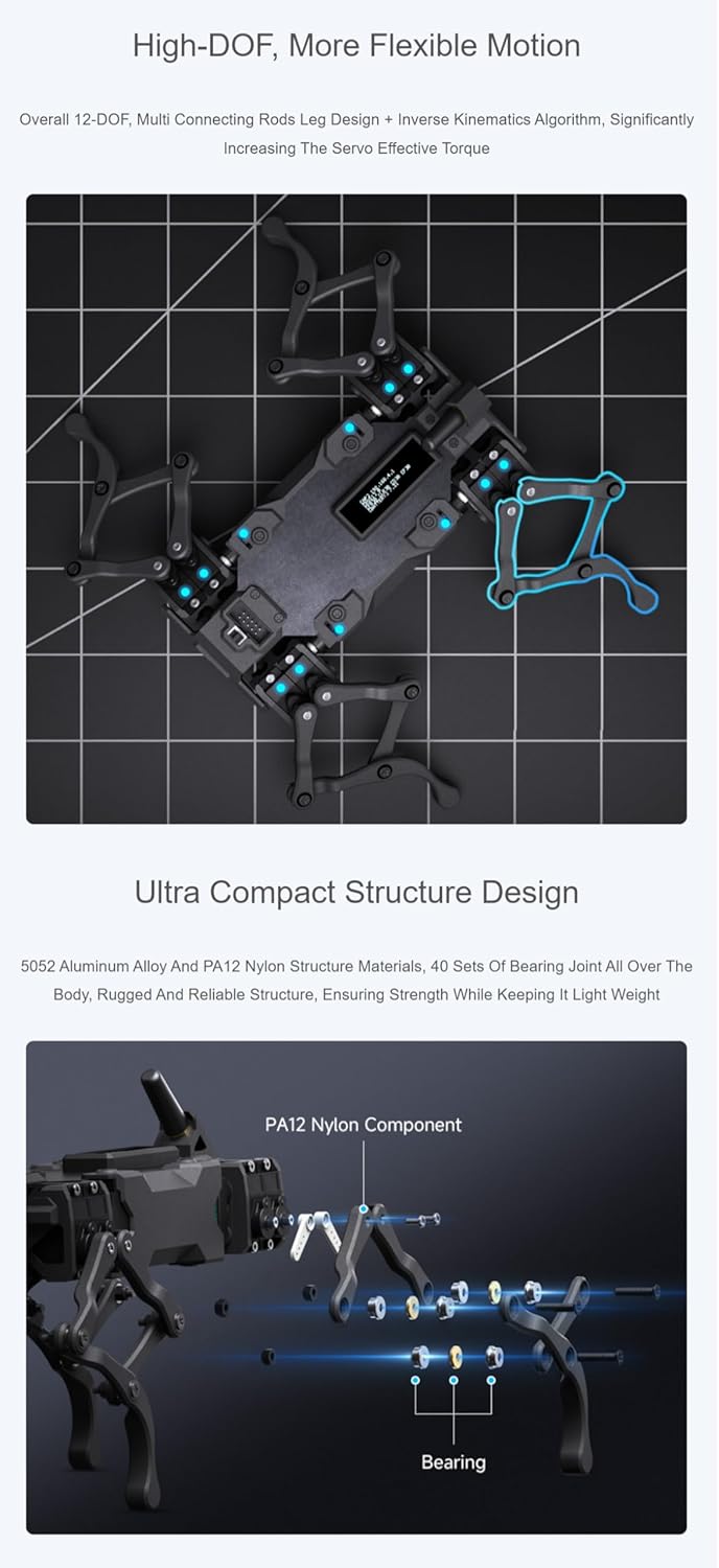 12 gradi di libertà (DOF), con movimenti più flessibili e diversificati. Struttura delle gambe multi-link + algoritmo di cinematica inversa, aumentando la coppia effettiva del servo. ICM20948 9-axis motion tracker con modalità di auto-bilanciamento disponibile. Servo ad alta coppia da 2,3 kg.cm, con una coppia del rotore bloccata fino a 5,2 kg.cm, offrendo una migliore espandibilità. È composto da parti in lega di alluminio 5052 e nylon PA12. Ci sono 40 serie di cuscinetti utilizzati per tutte le articolazioni di tutto il corpo e la struttura è solida e affidabile.