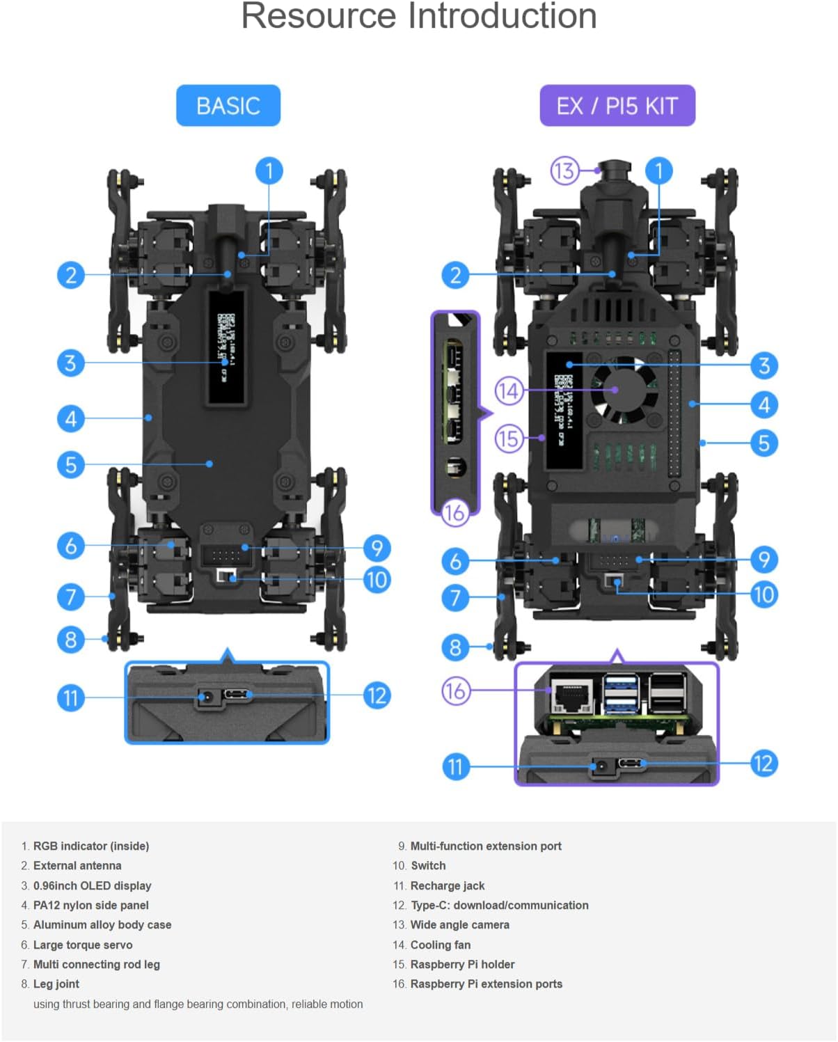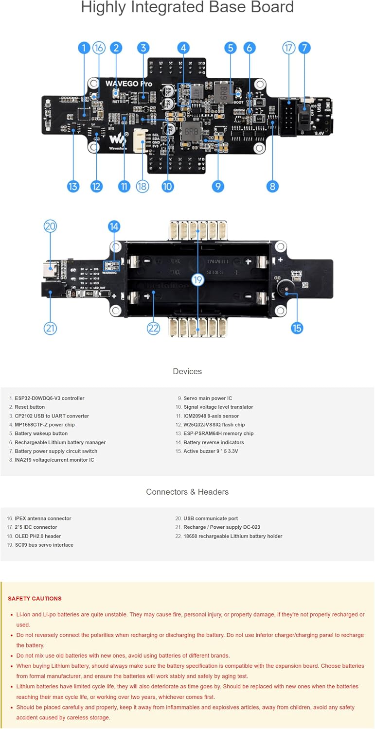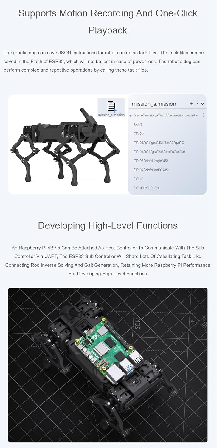 12 gradi di libertà (DOF), con movimenti più flessibili e diversificati. Struttura delle gambe multi-link + algoritmo di cinematica inversa, aumentando la coppia effettiva del servo. ICM20948 9-axis motion tracker con modalità di auto-bilanciamento disponibile. Servo ad alta coppia da 2,3 kg.cm, con una coppia del rotore bloccata fino a 5,2 kg.cm, offrendo una migliore espandibilità. È composto da parti in lega di alluminio 5052 e nylon PA12. Ci sono 40 serie di cuscinetti utilizzati per tutte le articolazioni di tutto il corpo e la struttura è solida e affidabile.