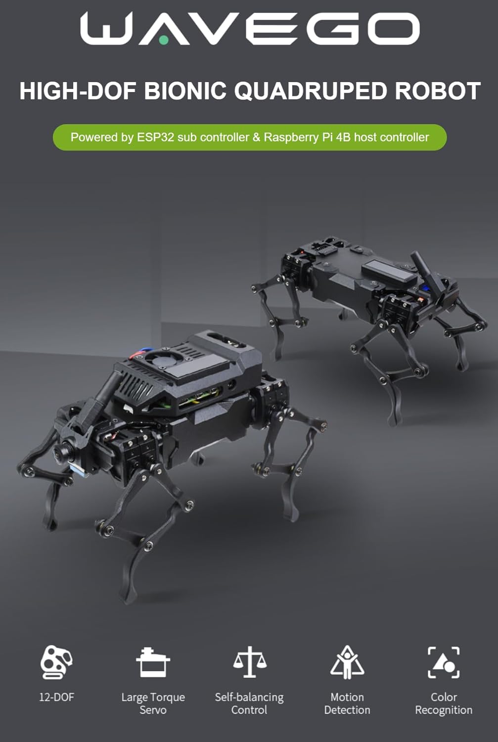 ✨ WAVEGO è un robot bionico di tipo cane con DOF elevato dotato di servi di coppia di grandi dimensioni da 12 x 2,3 kg, struttura affidabile e movimento flessibile, dispositivi integrati come fotocamera frontale, rilevamento del movimento a 9 assi, indicatore RGB, ecc., nonché un'applicazione web multipiattaforma open source. ✨ Utilizza l'ESP32 come sub-controller per la risoluzione dell'asta inversa e la generazione dell'andatura, condividendo le attività di calcolo per il controller host, è possibile collegare un RPi aggiuntivo come controller host per decisioni di alto livello. ✨ È realizzato in lega di alluminio 5052 e parti in nylon PA12. Ci sono 40 set di cuscinetti utilizzati in ciascuna articolazione dell'intero corpo e la struttura è solida e affidabile. ✨ Il codice di esempio è sviluppato utilizzando IDE, non è necessario configurare manualmente l'ambiente di compilazione, ESP32 stabilirà automaticamente un hotspot WiFi all'accensione, puoi utilizzare un telefono cellulare o un computer per accedere e accedere alla pagina di controllo, basta installare un browser basato su Chromium, non è necessaria alcuna applicazione. ✨ L'interfaccia di espansione 2 x 5P è riservata alle restanti porte I/O e seriali dell'ESP32. Le funzioni includono espansione RGB, RX0, TX0, G21, G15, G12, 3V3, 5V ed GND, che può essere utilizzata per comunicare con il computer host o connettersi ad altri dispositivi.