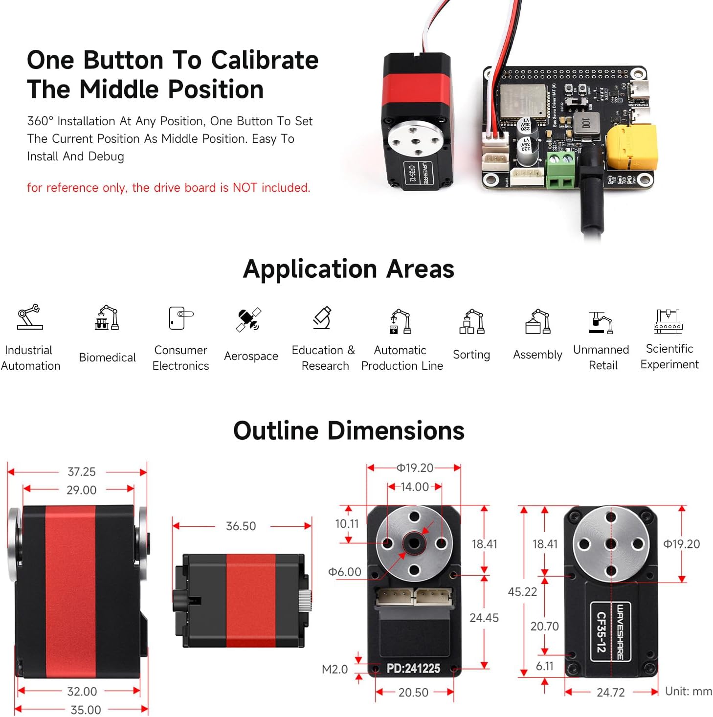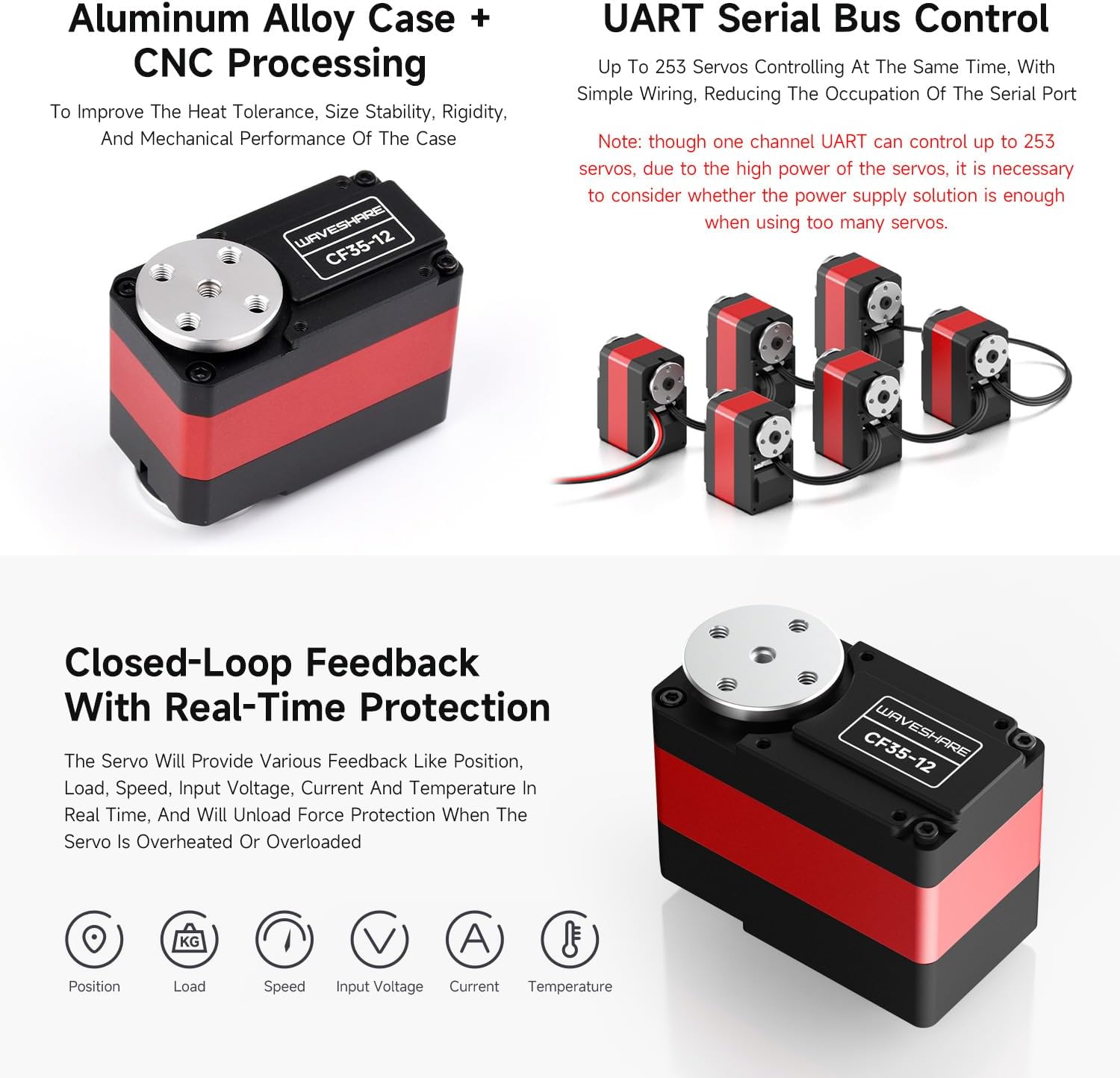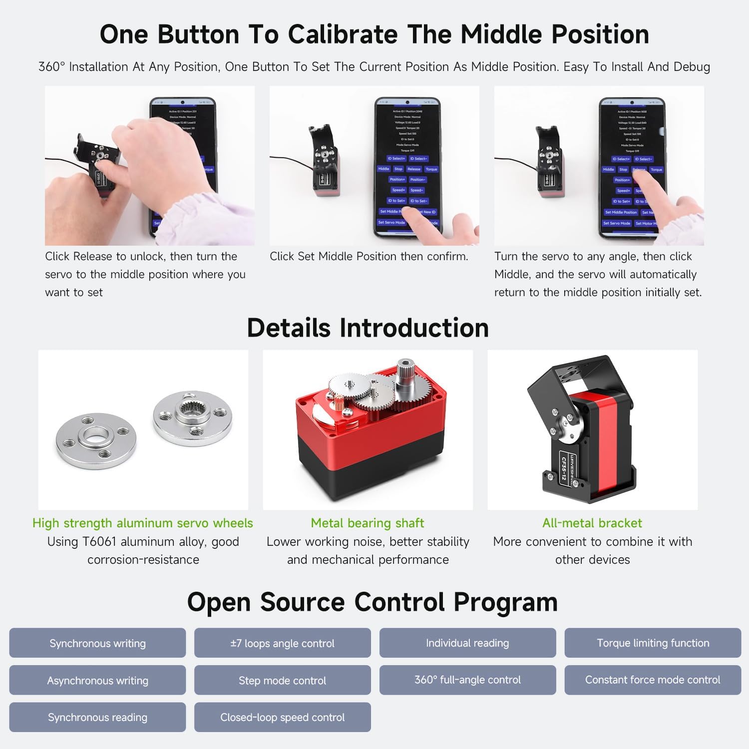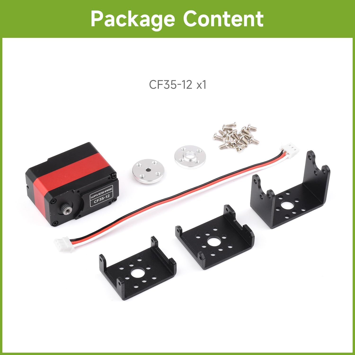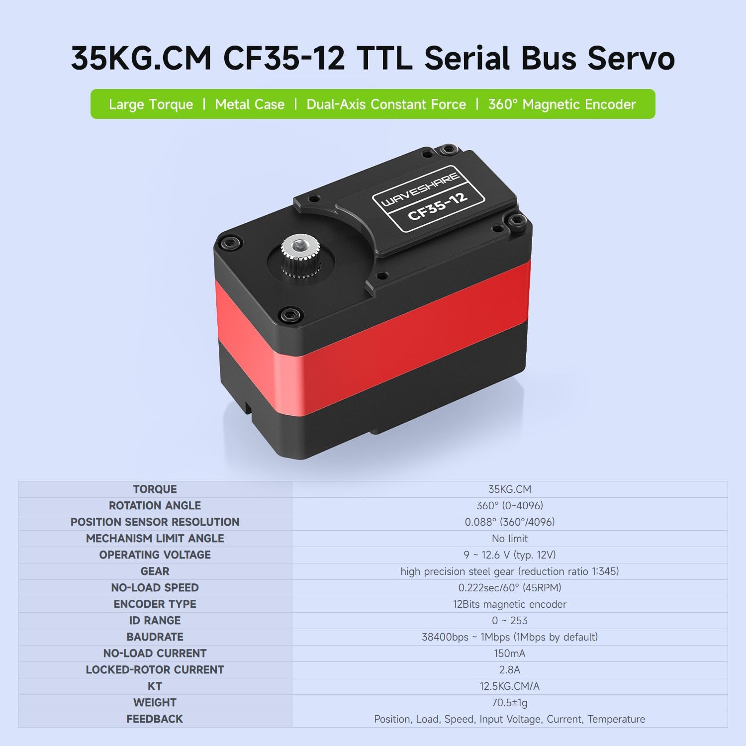 360° magnetic encoder, high precision, angle control accuracy up to 360°/4096. Any angle can be set to the servo center position for easy assembly Acceleration start-stop function, smoother motion effects. Compact structure design, more beautiful product appearance Wide voltage input of 9-12.6V, can be directly powered by 2S or 3S lithium batteries. Stall torque up to 35kg.cm@12V Multiple working modes can be set: Angle control mode, Motor constant speed control mode, Motor constant current control mode Can be used in series to control up to 253 bus servos at the same time (provided that the power supply is sufficient) and obtain feedback information for each bus servo