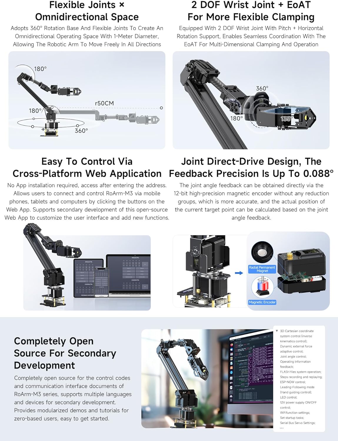 5+1 DOF High-Torque Robotic Arm: The RoArm-M3-S features a highly flexible 5 degrees of freedom (DOF) robotic arm combined with an additional 2-DOF wrist joint. This high-torque configuration allows the arm to perform intricate tasks requiring precise movements, while its 360° rotating base ensures maximum flexibility for a variety of robotic applications. AI Integration with Hugging Face LeRobot Framework: Designed with AI capabilities in mind, the RoArm-M3-S supports the Hugging Face LeRobot AI framework, enabling users to easily integrate advanced machine learning models. This allows for applications in reinforcement learning, imitation learning, and AI-driven decision-making, making it ideal for research, development, and educational purposes. ESP32-Based Wireless Control System: The kit is powered by an ESP32 microcontroller, providing robust wireless communication through 2.4G Wi-Fi and ESP-NOW protocols. This enables low-latency control and multi-device coordination, allowing users to operate the robotic arm from a distance with smooth and responsive performance. The wireless control functionality is perfect for applications requiring remote operation. Modular and Expandable Design for Customization: The RoArm-M3-S is built with a modular and expandable design, offering easy integration with additional hardware components, such as sensors and actuators. This makes the robotic arm adaptable to a wide range of applications, from academic and research projects to professional-level automation tasks. It also supports future upgrades, allowing the kit to evolve as your needs grow. Cross-Platform Compatibility and Open-Source Software: The kit supports multiple platforms, including ROS2, Raspberry Pi, Jetson Orin, and standard PCs, making it a versatile tool for developers, engineers, and students alike. Additionally, the open-source software enables full customization, giving users the freedom to modify and adapt control algorithms to suit their specific needs, ensuring the RoArm-M3-S remains relevant for various robotic applications. Rich WiKi Resources: We provide official Wiki resources, please contact us for more information.