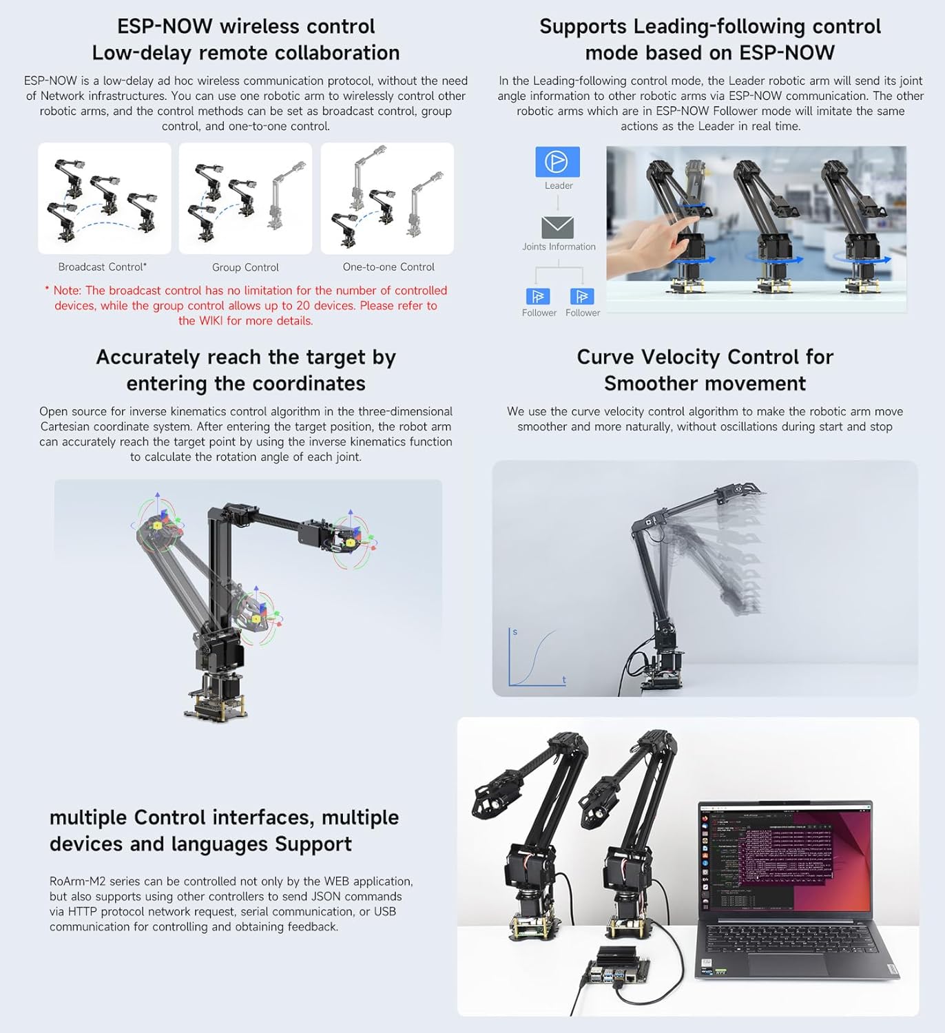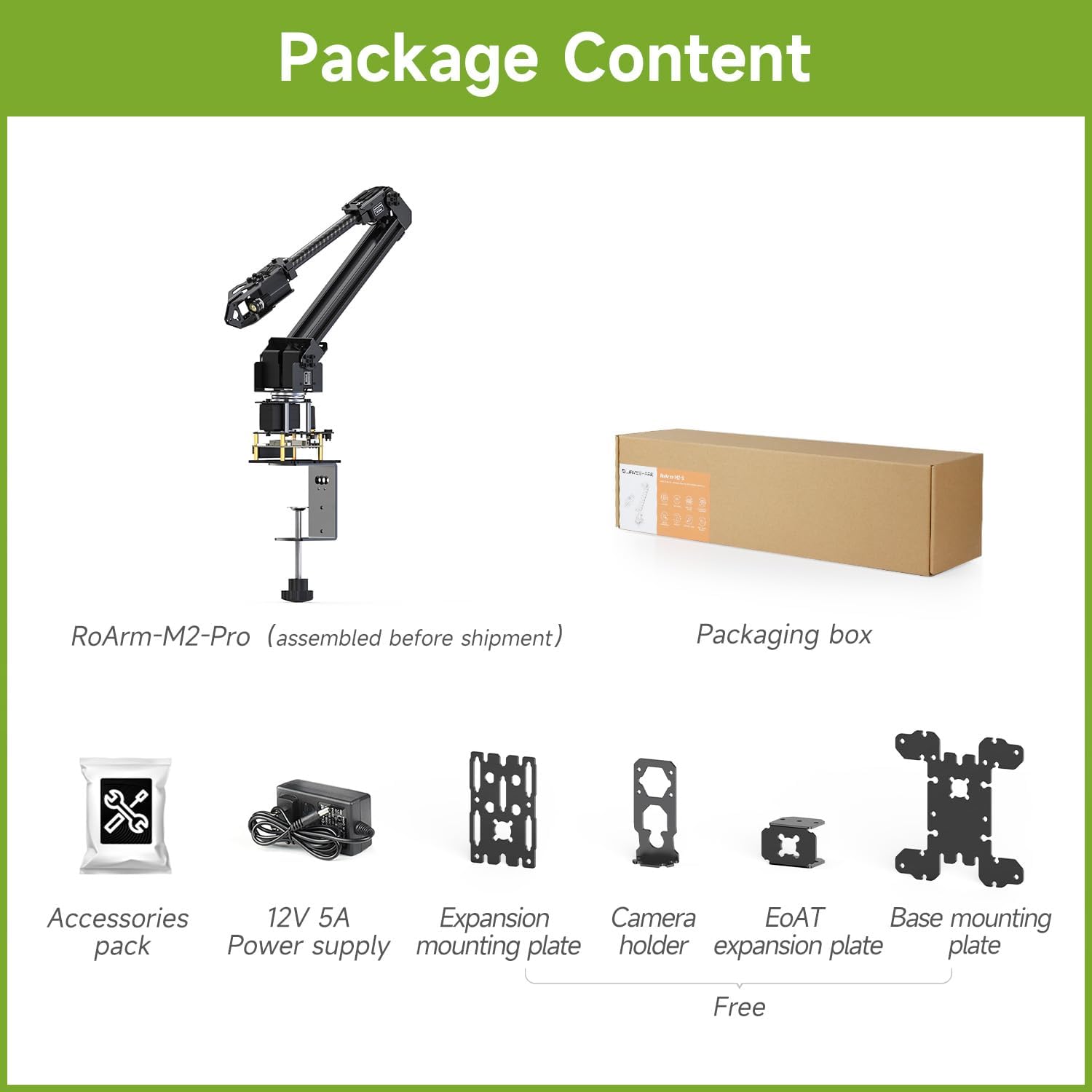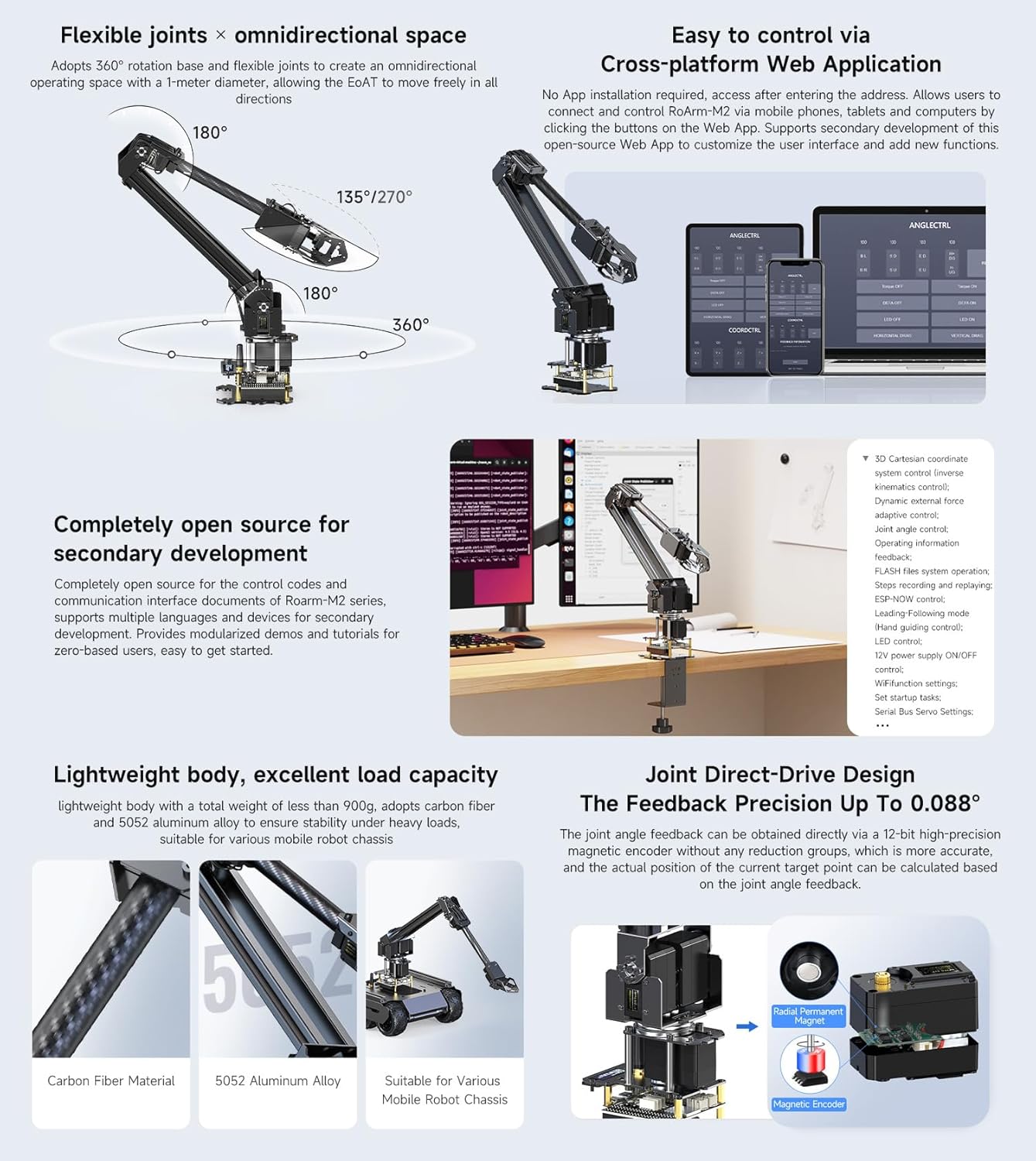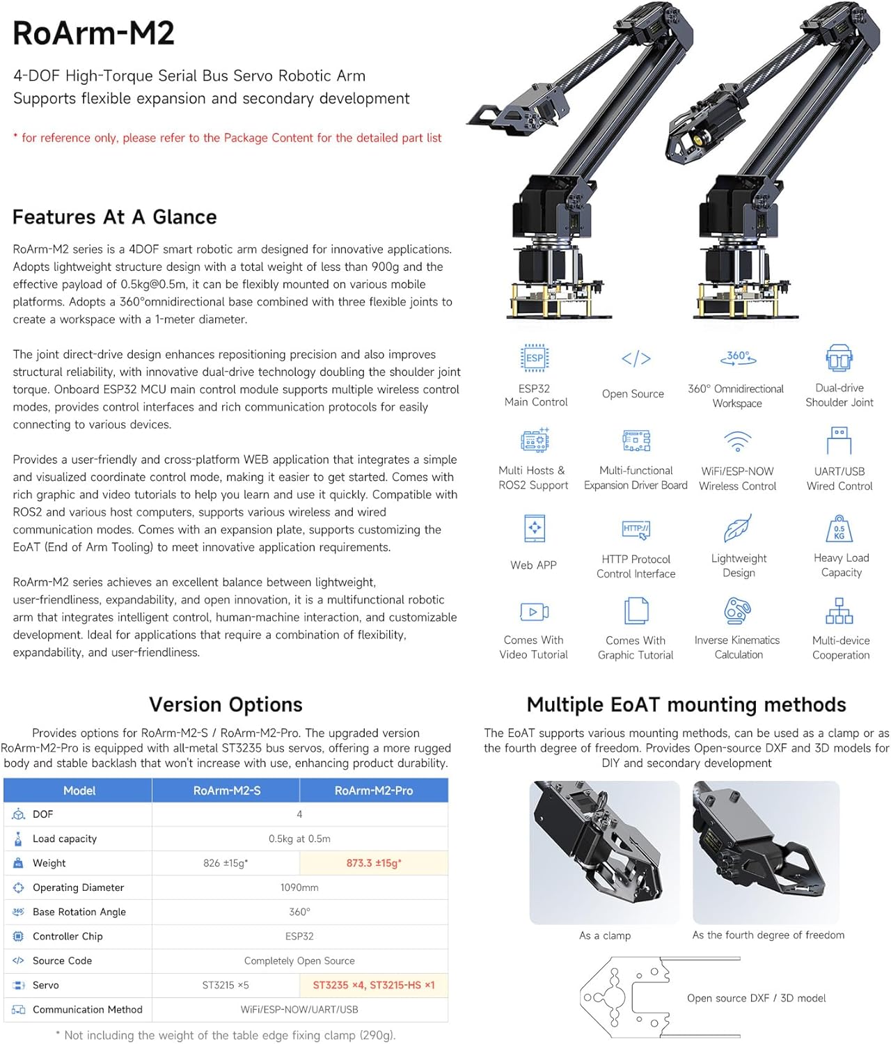 This upgraded version RoArm-M2-Pro is equipped with all-metal ST3235 bus servos, offering a more rugged body and stable backlash that won't increase with use, enhancing product durability RoArm-M2-Pro is a 4DOF smart robotic arm designed for innovative applications. Adopts lightweight structure design with a total weight of less than 900g and the effective payload of 0.5kg@0.5m, it can be flexibly mounted on various mobile platforms. Adopts a 360°omnidirectional base combined with three flexible joints to create a workspace with a 1-meter diameter The joint direct-drive design enhances repositioning precision and also improves structural reliability, with innovative dual-drive technology doubling the shoulder joint torque. Onboard ESP32 MCU main control module supports multiple wireless control modes, provides control interfaces and rich communication protocols for easily connecting to various devices Provides a user-friendly and cross-platform WEB application that integrates a simple and visualized coordinate control mode, making it easier to get started. Comes with rich graphic and video tutorials to help you learn and use it quickly. Compatible with ROS2 and various host computers, supports various wireless and wired communication modes. Comes with an expansion plate, supports customizing the EoAT (End of Arm Tooling) to meet innovative application requirements RoArm-M2-Pro achieves an excellent balance between lightweight, user-friendliness, expandability, and open innovation, it is a multifunctional robotic arm that integrates intelligent control, human-machine interaction, and customizable development. Ideal for applications that require a combination of flexibility, expandability, and user-friendliness