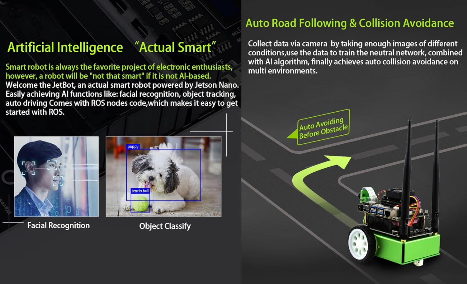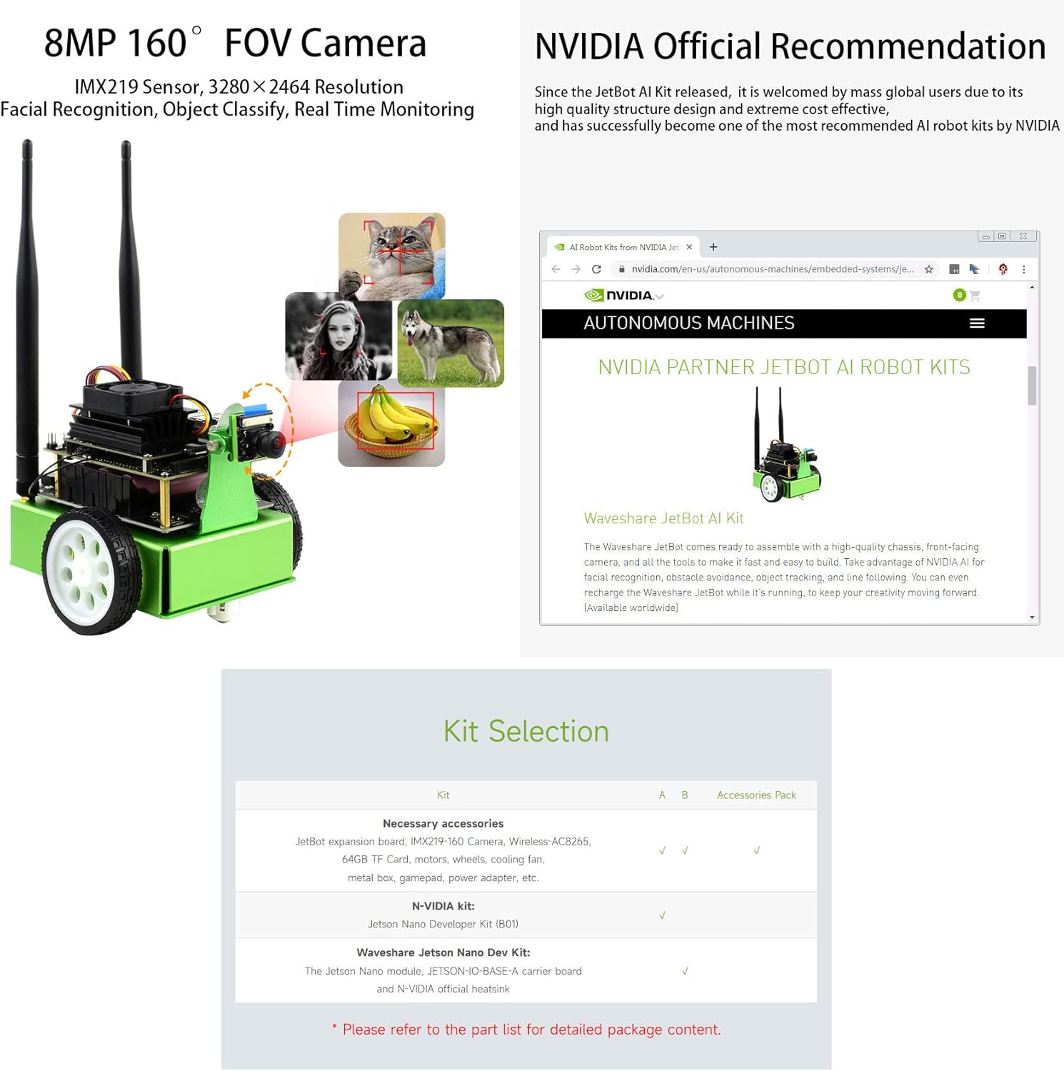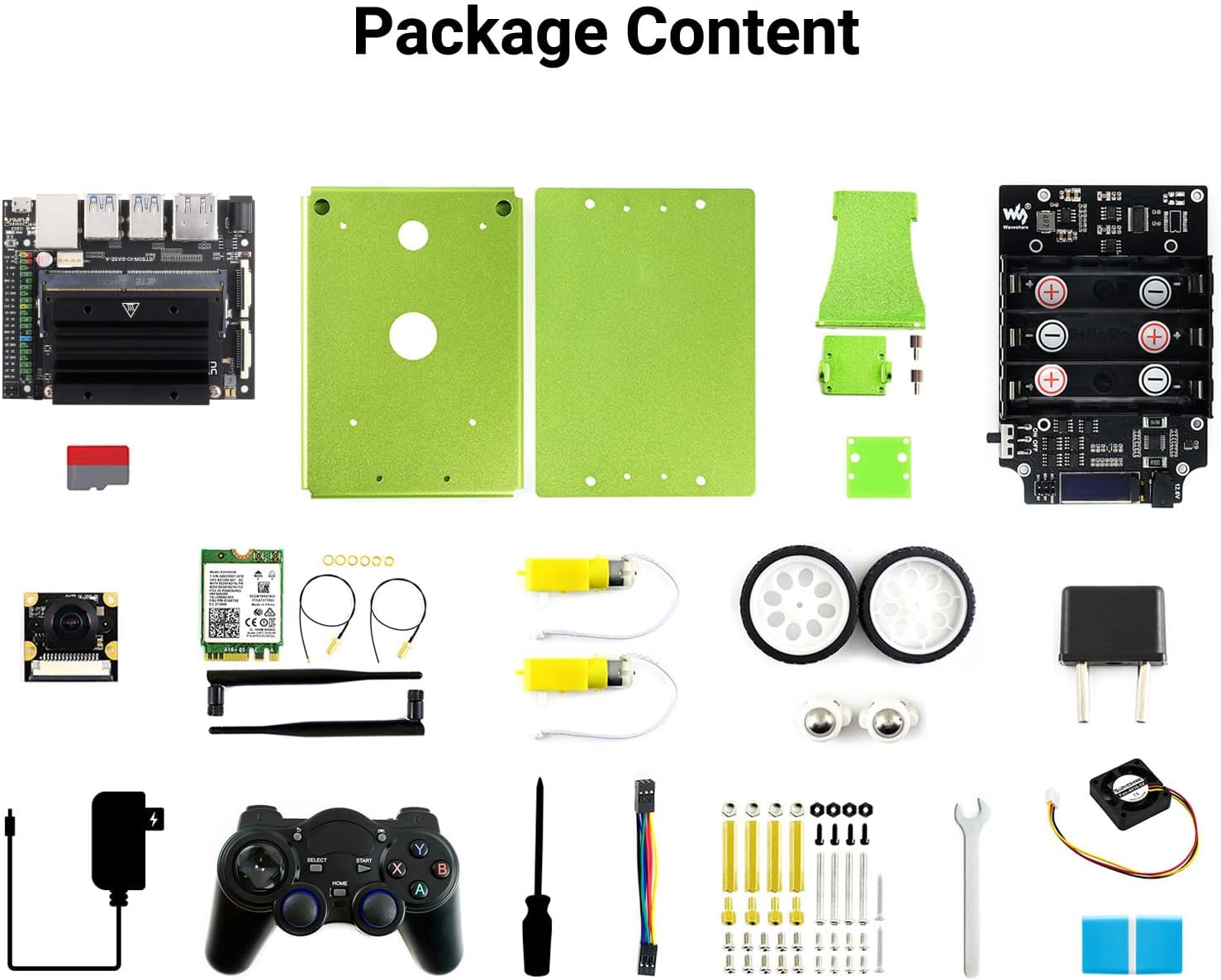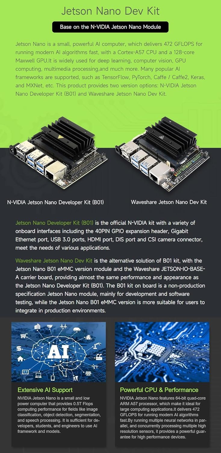 Questo kit fornisce kit Waveshare auto-prodotto Jetson Nano Dev. Fornire il manuale utente online, si prega di controllare attentamente il manuale prima dell'uso Questo prodotto richiede 3 battute 18650 (non incluse) (Spec: tensione 3,7 V, 2600 mAh, diametro: 18 mm, lunghezza: 65 mm) per funzionare. Elevata capacità di battuta, uscita di tensione fino a 12,6 V, forza motrice più potente. Integra S-8254AA + AO4407A circuito di protezione al litio batt, fornisce protezioni per sovraccarico, sovratensione, sovracorrente e cortocircuito. L'alimentatore in questo kit è solo per la ricarica in batt e non alimenterà direttamente il Jetson Nano Waveshare Jetson Nano Dev Kit è la soluzione alternativa del kit B01, con il modulo Jetson Nano B01 eMMC versione e la scheda di supporto Waveshare JETSON-IO-BASE-A, fornendo quasi le stesse prestazioni e l'aspetto del kit Jetson Nano Developer (B01). Il kit B01 a bordo è un modulo Jetson Nano con specifiche non di produzione, principalmente per test di sviluppo e software, mentre la versione eMMC Jetson Nano B01 è più adatta per l'integrazione degli utenti in ambienti di produzione Risoluzione ad alta definizione da 8 MP, fotocamera grandangolare FOV a 160°. AC8265 wireless NIC, 2.4G/5G dual-band WiFi, BT 4.2. OLED da 0,91 pollici, 128 × 32 pixel Si prega di conservare correttamente la scatola di imballaggio originale dei prodotti e gli accessori (se presenti) per il servizio di garanzia, per Waveshare Jetson Nano Dev Kit 4GB, include: il modulo Jetson Nano, la scheda di supporto JETSON-IO-BASE-A e il dissipatore di calore ufficiale. Si prega di fare riferimento alla lista dei pezzi per il contenuto dettagliato della