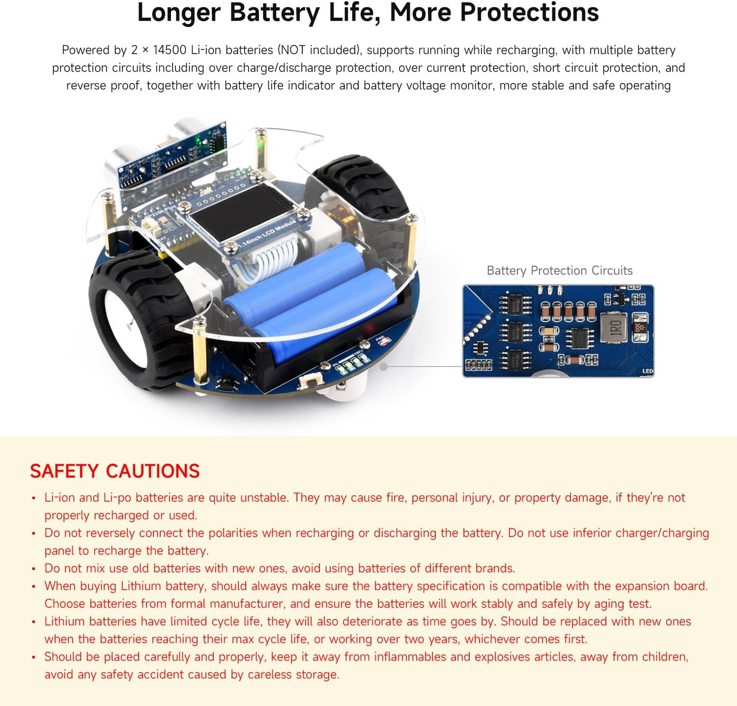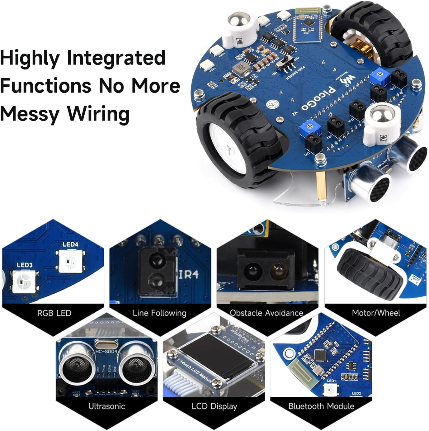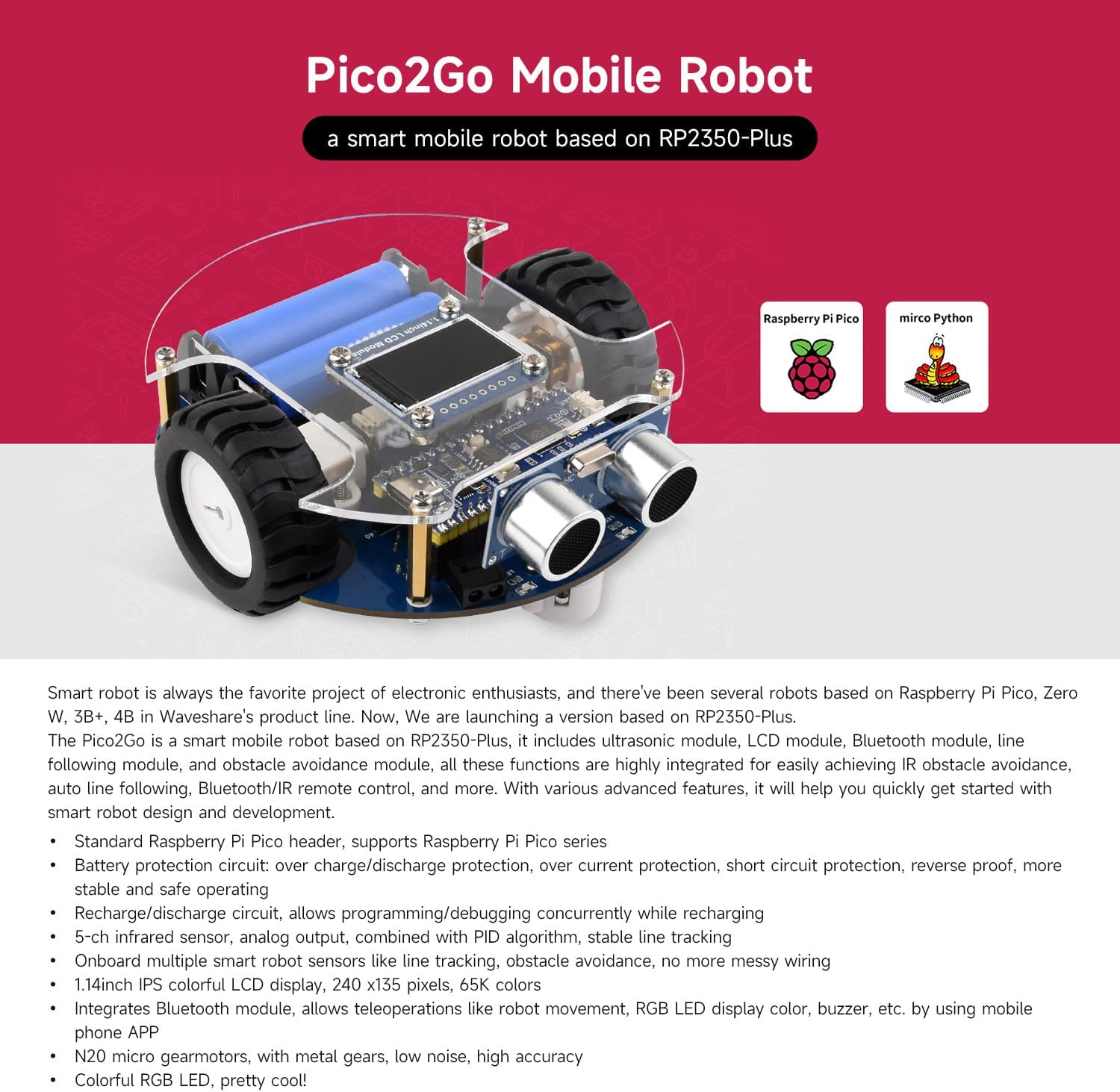 Highly Integrated Smart Robot: The Pico2Go is an RP2350-Plus-based mobile robot featuring ultrasonic, LCD, Bluetooth, line-following, and obstacle-avoidance modules for IR/Bluetooth control, IR obstacle avoidance, Auto line following, Ultrasonic sensor, Object tracking, and more. Advanced Safety & Power Management: Includes battery protection (overcharge/discharge, overcurrent, short-circuit, reverse-proof) and supports concurrent charging/debugging via a recharge circuit. Precision Tracking & Sensors: Equipped with a 5-channel IR sensor (PID algorithm for stable line-following) and onboard sensors to eliminate messy wiring. Wireless Control & Display: Integrates Bluetooth for smartphone teleoperation (movement, RGB LED, buzzer) and a 1.14inch IPS colorful LCD display (240 x135 pixels, 65K colors). Durable Hardware: Uses N20 micro metal-gear motors (low noise, high accuracy) and runs on dual 14500 Li-ion batteries (excluded) with real-time voltage monitoring. For more examples, refer to demo codes and manual on our wiki.