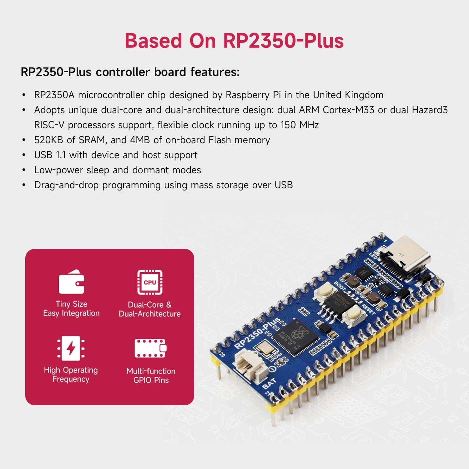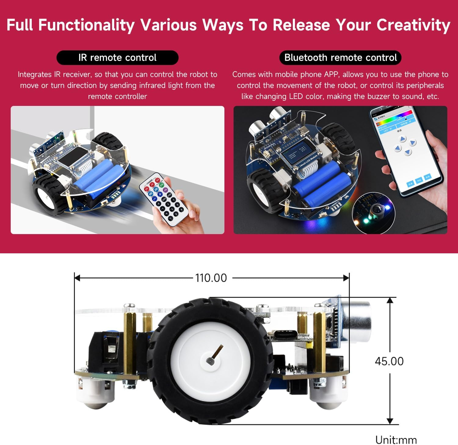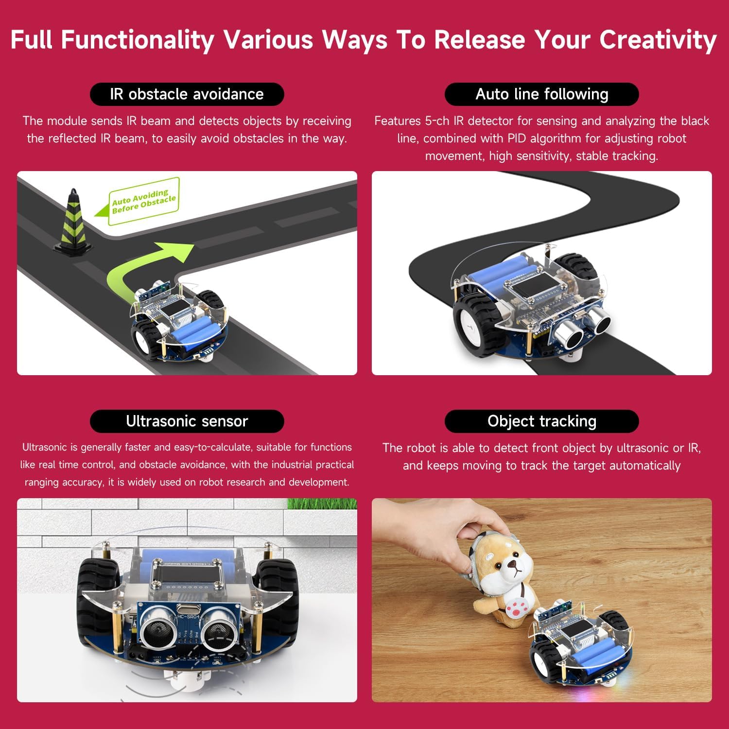 Highly Integrated Smart Robot: The Pico2Go is an RP2350-Plus-based mobile robot featuring ultrasonic, LCD, Bluetooth, line-following, and obstacle-avoidance modules for IR/Bluetooth control, IR obstacle avoidance, Auto line following, Ultrasonic sensor, Object tracking, and more. Advanced Safety & Power Management: Includes battery protection (overcharge/discharge, overcurrent, short-circuit, reverse-proof) and supports concurrent charging/debugging via a recharge circuit. Precision Tracking & Sensors: Equipped with a 5-channel IR sensor (PID algorithm for stable line-following) and onboard sensors to eliminate messy wiring. Wireless Control & Display: Integrates Bluetooth for smartphone teleoperation (movement, RGB LED, buzzer) and a 1.14inch IPS colorful LCD display (240 x135 pixels, 65K colors). Durable Hardware: Uses N20 micro metal-gear motors (low noise, high accuracy) and runs on dual 14500 Li-ion batteries (excluded) with real-time voltage monitoring. For more examples, refer to demo codes and manual on our wiki.