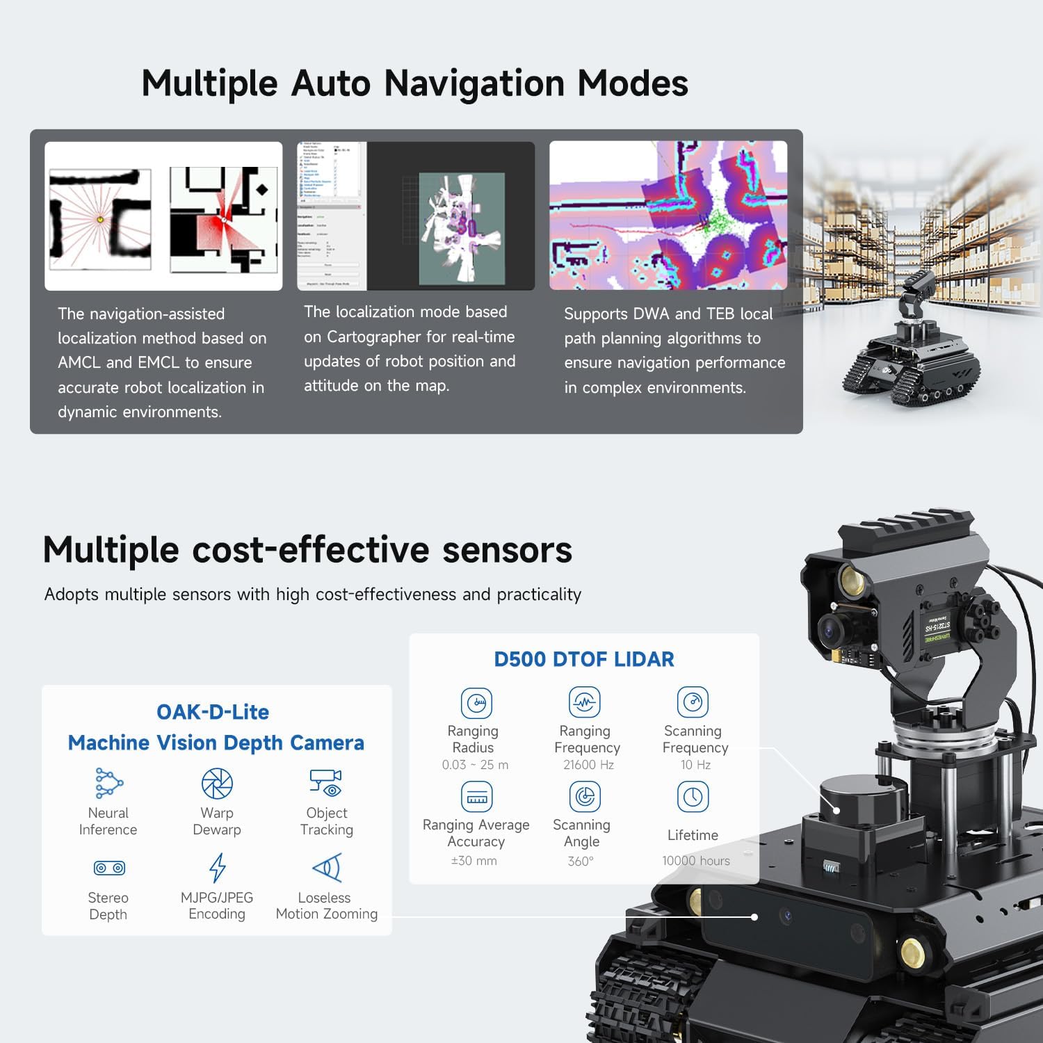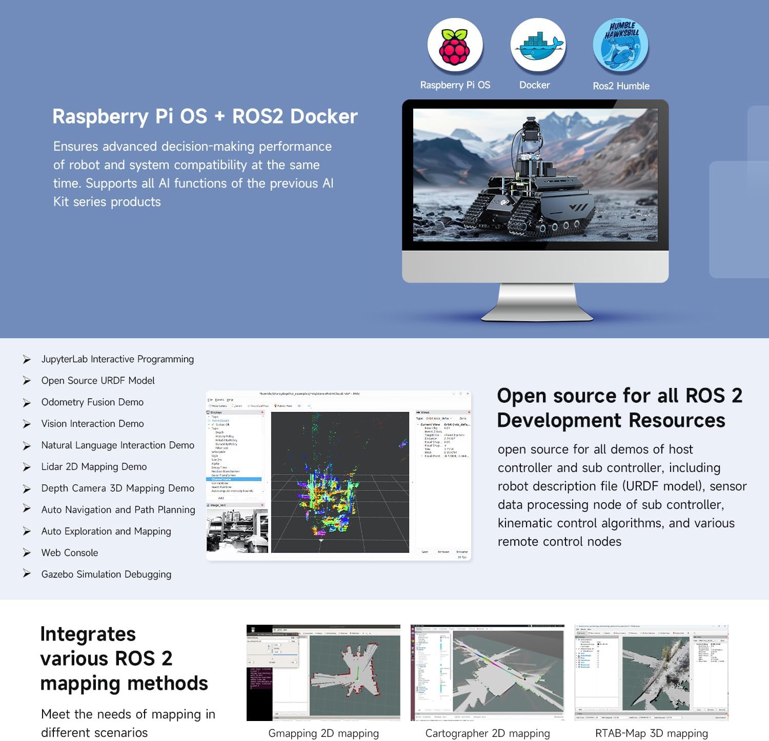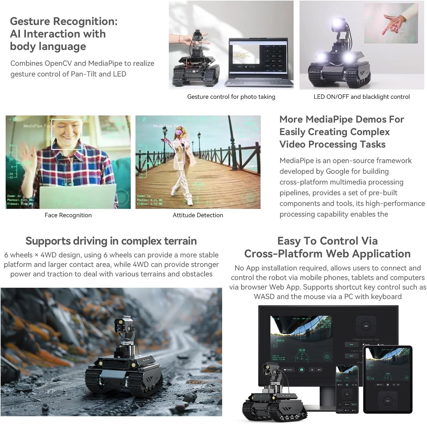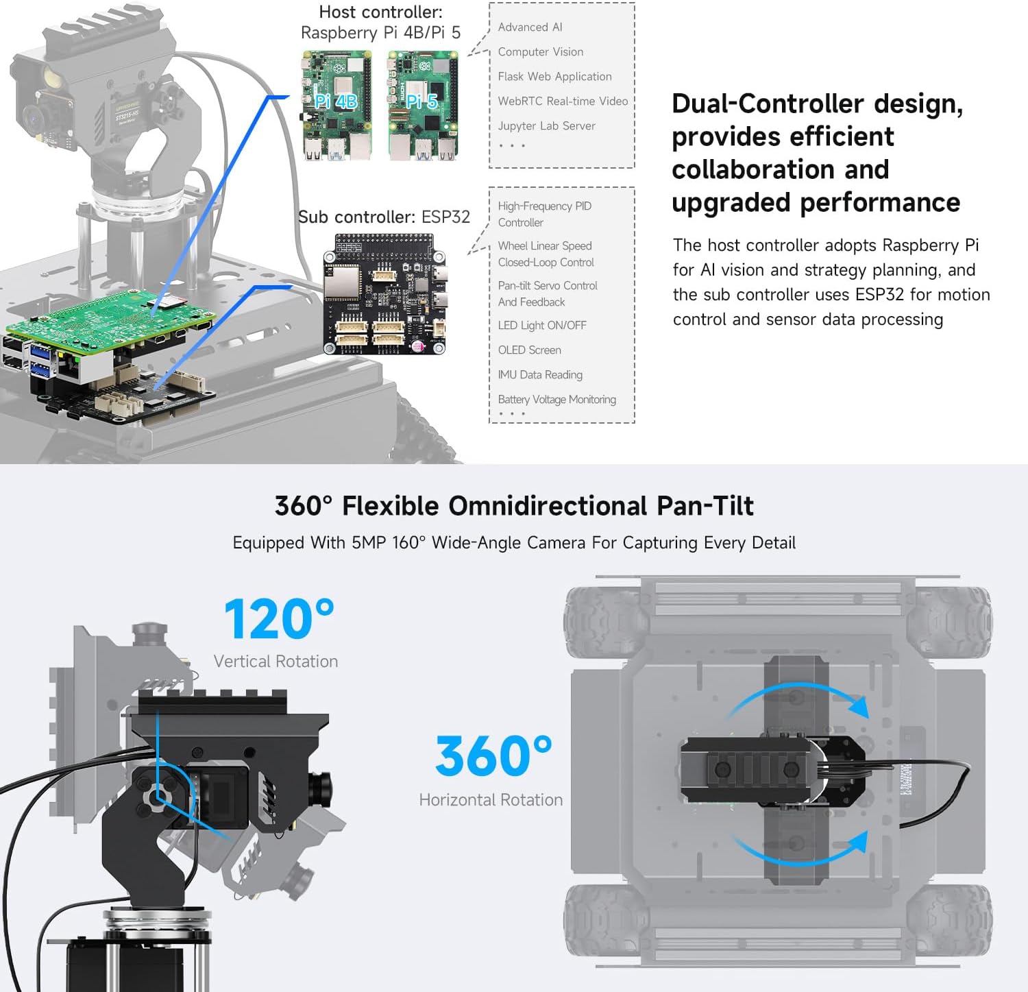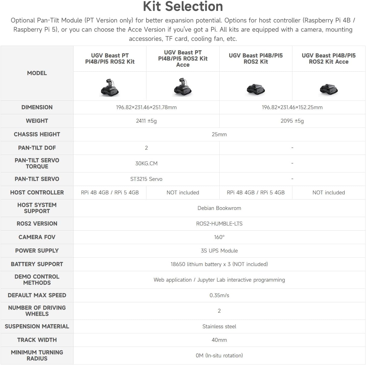 UGV Beast PT PI4B ROS2 Kit Accessory Packs, equipped with 360° Flexible Omnidirectional Pan-Tilt, features Strong potential for expansion, For Raspberry Pi4B Adopts dual-controller design, combines the high-level AI functions of the host controller with the high-frequency basic operations of the sub controller, making every operation accurate and smooth Easy to be controlled remotely via UGV Beast Web Application without downloading any software You can use the basic ROS 2 functions of the robot without installing a virtual machine on the PC. Supports high-frame rate real-time video transmission and multiple AI Computer Vision functions Suitable for face detection, object recognition, gesture recognition, visual inspection. Features handle control, cross platform web app control, with shock-absorbing tires, Open Source For All ROS 2 Development Resources