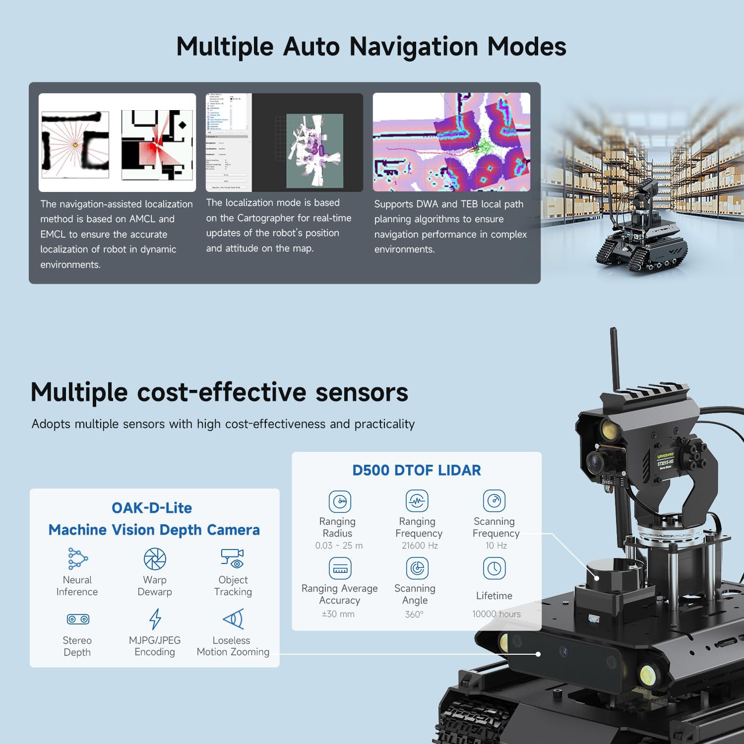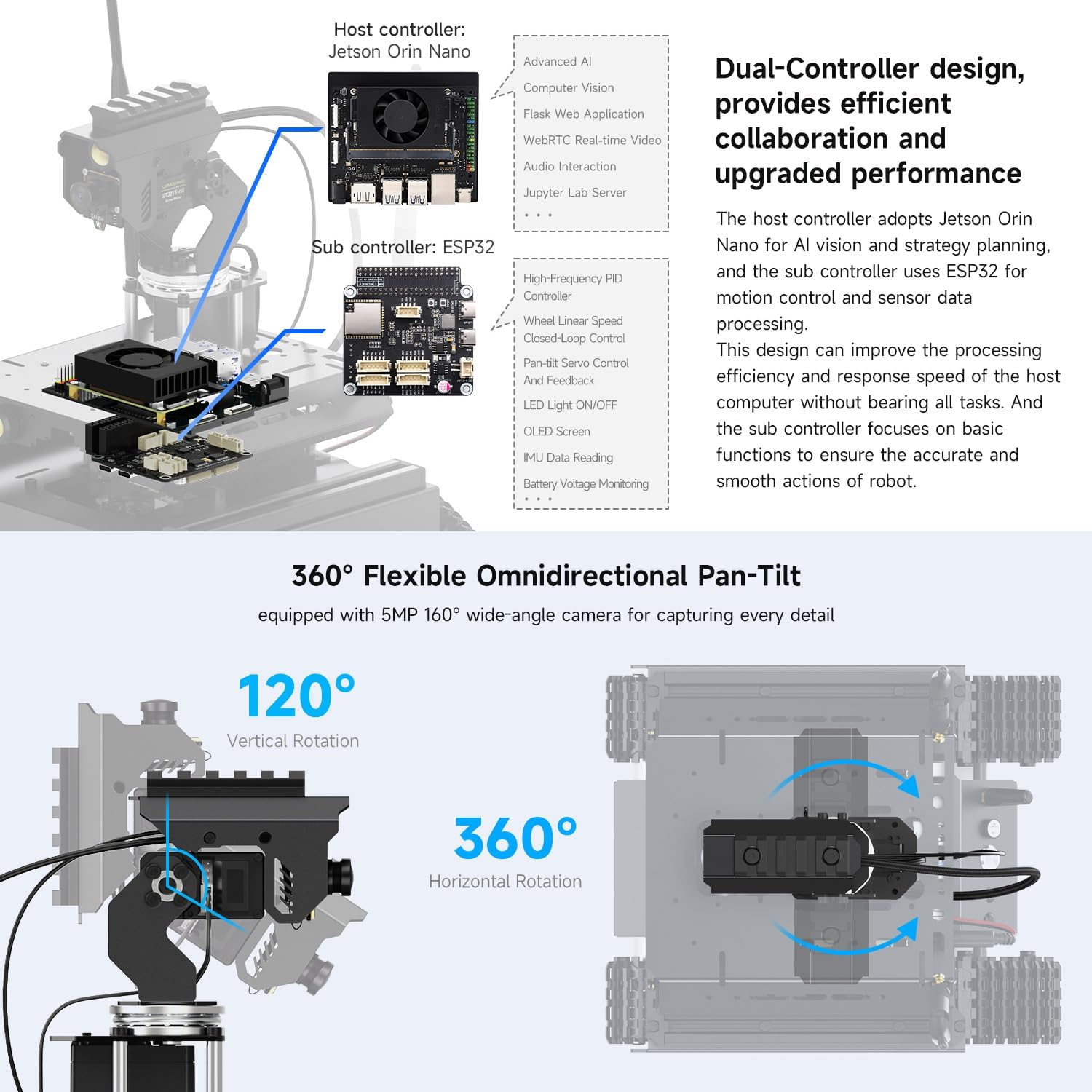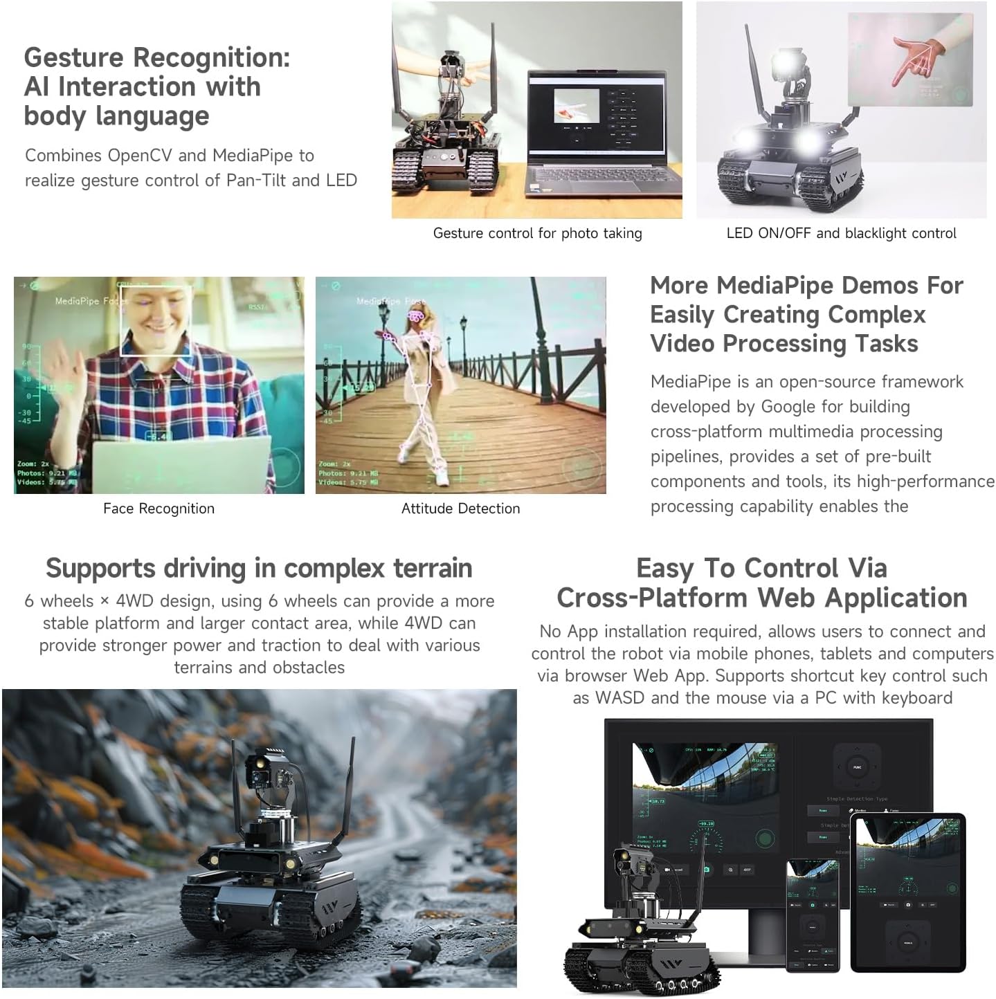 The lower host computer is ESP32, responsible for precise motor PID control and multiple sensor readings, while the upper host computer, Jetson Orin Nano(NOT Included), provides high-level arithmetic, and the two-tier architecture makes the robot run more efficiently. Provides rich JupyterLab interactive, graphic, video and ROS2 function tutorials, from introductory functions to advanced functions, users can learn how to control the robot while watching the tutorials The upper computer is developed based on Ubuntu 22.04, the ROS2 function is developed based on Humble version, the WEB application is based on Flask, Python language, the software platform is all open source, which is convenient for users to learn and secondary development. Equipped with a 2-degree-of-freedom, high-torque, flexible gimbal that provides a wide 360° viewing angle in all directions horizontally, and a 5MP camera with a 160° wide-angle view to capture a wider range of images Integrated machine vision functions such as color, object and gesture recognition, face and motion detection can be expanded for more applications. Real-time video streaming, digital zoom, photo, video and other functions, and WEB application real-time video function and robot information displayed on the screen to improve the user interaction experience. The 2mm-thick all-aluminum alloy housing provides superior structural strength and durability The structure is equipped with an expansion plane and herringbone rail, which is convenient for expanding other tactical accessories; on the hardware, the LED light interface has a surplus, which can be used for expanding other peripherals such as water bullet gun, and the product can also be expanded with 4G and 5G modules, which is convenient for users to realize more possibilities. 4-wheel drive system with soft non-slip rubber tires ensures good grip and stability on all terrains Support the realization of cross-platform remote control, no need to install APP, you can use Dandelion, Cpolar, LocalTunnel and other programs according to the tutorial for remote control beyond the scope of the LAN. Equipped with four geared motors with encoder to realize closed-loop speed control, the maximum speed can reach 1.3m/s, providing strong power. The 3S lithium battery UPS power supply system supports charging and use at the same time, which ensures a long endurance