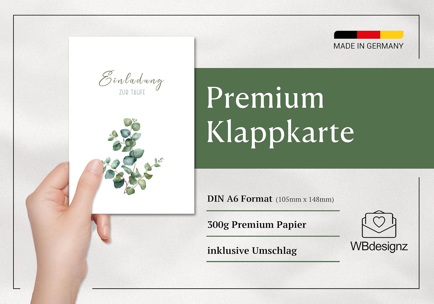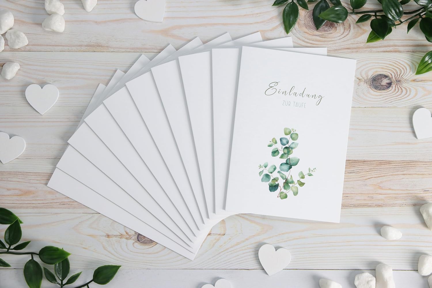Design unico: ogni biglietto d'invito è caratterizzato dall'affettuosa scritta "Invito al battesimo", incorniciato da delicate foglie di eucalipto con un delicato effetto acquerello che creano un'atmosfera calda e accogliente. Alta qualità: stampati su carta premium da 300 g/m², i biglietti offrono non solo un'eccellente qualità dell'immagine, ma anche una sensazione piacevole al tatto che sottolinea l'importanza della tua occasione. Set completo: con il set da 10 pezzi riceverete non solo i biglietti d'invito, ma anche buste di carta kraft abbinate, che completano perfettamente il design naturale ed elegante e completano il vostro invito. Versatilità: questi biglietti d'invito sono ideali per qualsiasi tipo di evento di torta, dai tradizionali battesimi in chiesa alle cerimonie personali in un piccolo cerchio, e invitano i tuoi ospiti a questo evento speciale con stile. Made in Germany – produzione regionale con attenzione ai dettagli e attenzione alla qualità