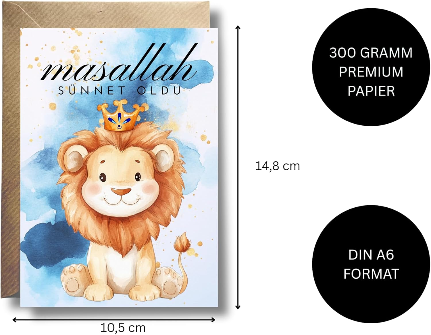 Biglietto per la circoncisione con busta "Mashallah Sünnet oldu": biglietto dal design accattivante con un leone acquarellato e una tradizionale frase di benedizione, ideale per congratularsi con la cerimonia del peccato. Perfetto per la festa della circoncisione: un modo meraviglioso per esprimere la tua gioia e trasmettere i tuoi calorosi saluti su questa importante pietra miliare nella vita di un ragazzo. Formato A6 di alta qualità su carta di alta qualità da 300 g/m²: stabile ed elegante – La carta di alta qualità sottolinea la qualità del biglietto e garantisce un aspetto attraente. Viene fornito con una busta kraft abbinata: la busta di colore naturale completa il design e lo protegge fino al momento in cui il biglietto viene regalato.