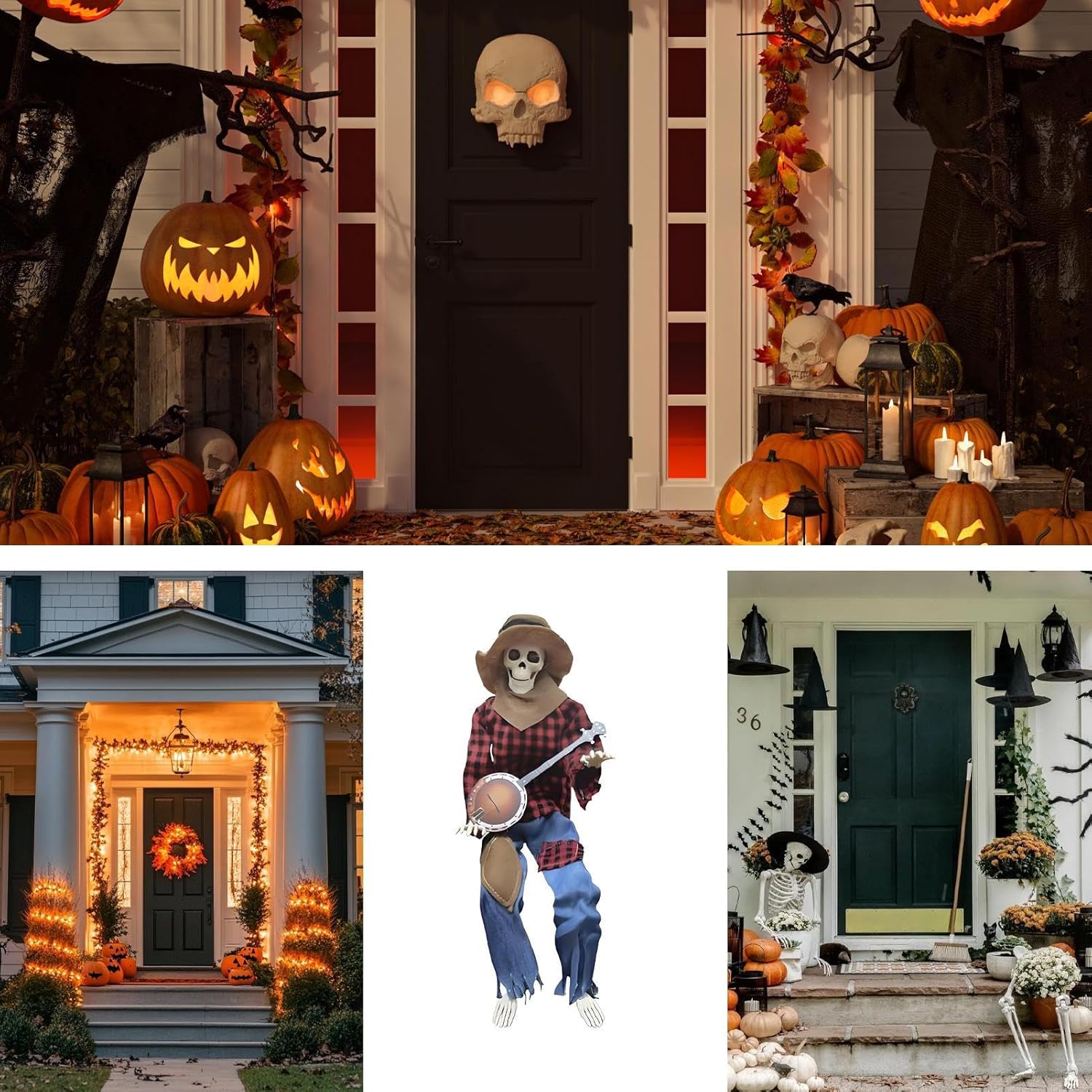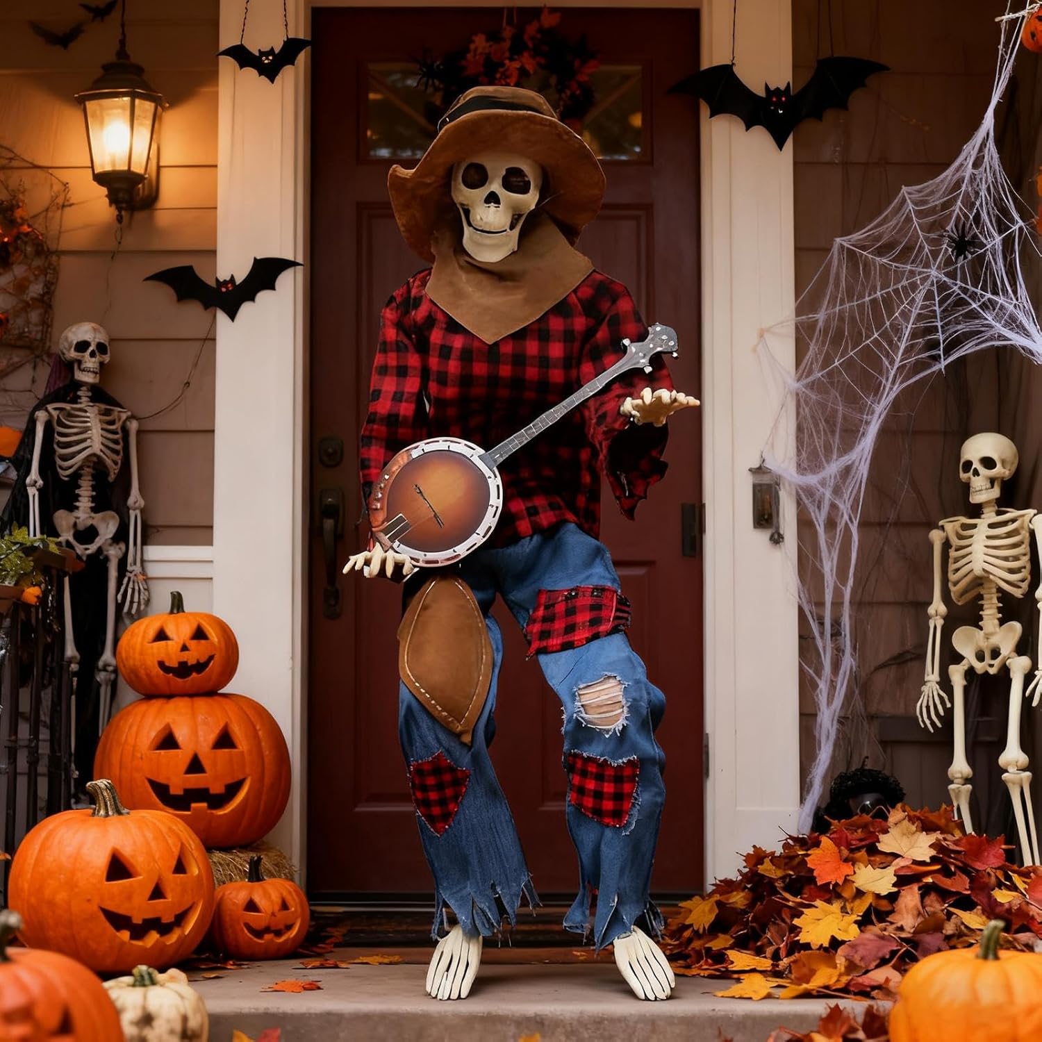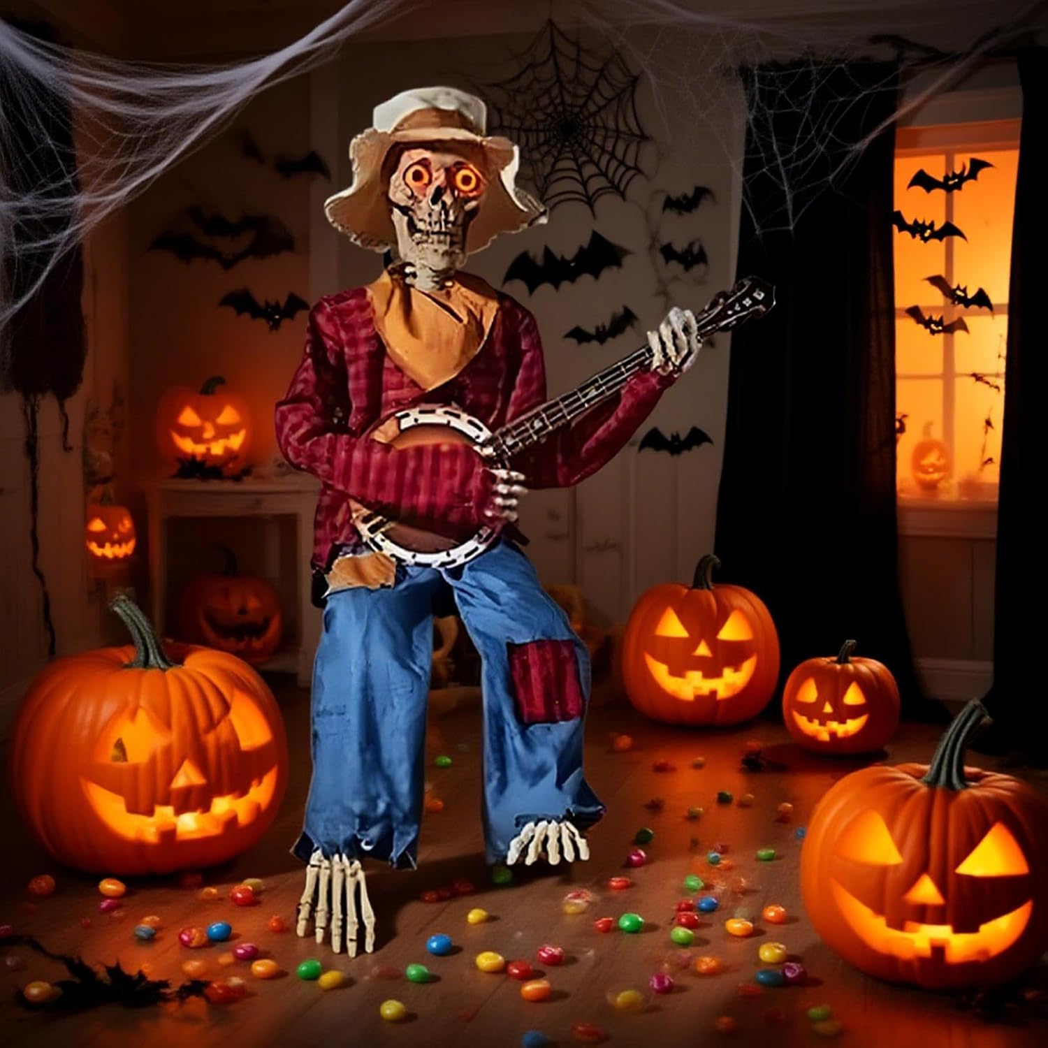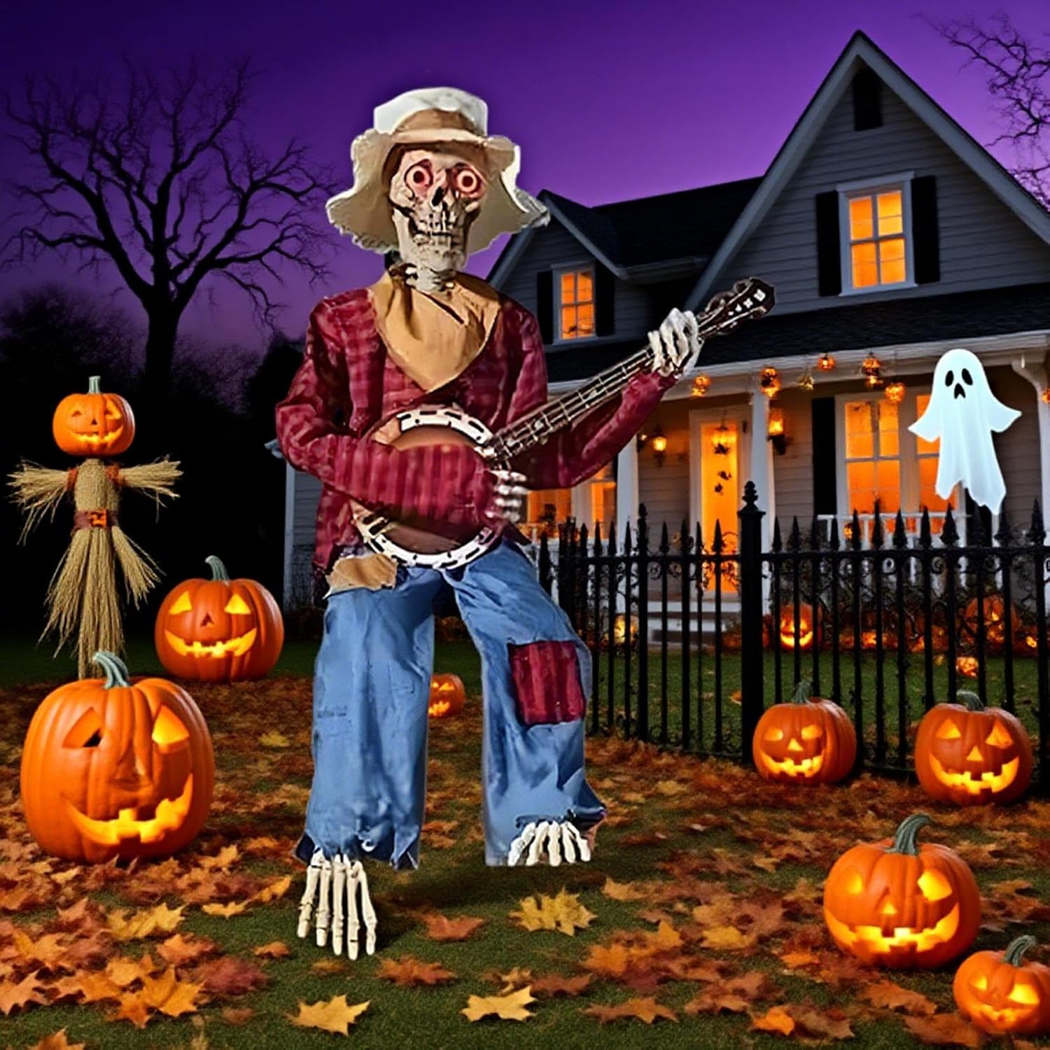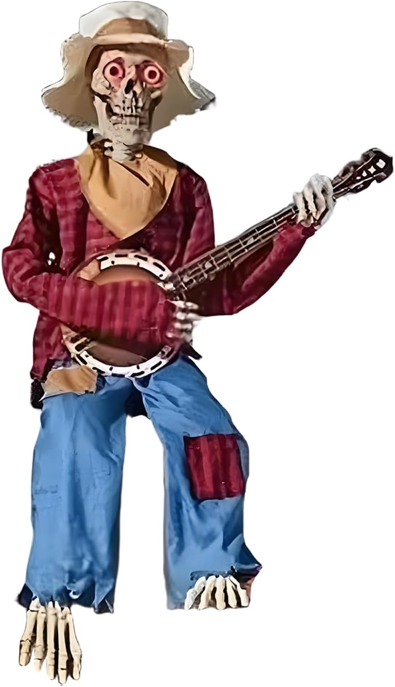 Posa flessibile: le articolazioni modellabili dell'elemento decorativo scheletro consentono posture dinamiche da scene spettrali a scene umoristiche e offrono la massima personalizzazione per le singole decorazioni di Halloween. Design sorprendente: ravviva la tua stanza con uno scheletro a grandezza naturale con movimenti naturali delle mani e della testa, ideale per spettacoli animati di duelli di banjo che delizieranno gli ospiti e creeranno un'atmosfera unica. Autunno: cattura lo spirito del fascino rustico di Halloween con un design a scheletro che valorizza visivamente il fienile. Si integra perfettamente in qualsiasi decorazione del festival autunnale e crea un'atmosfera mistica. Migliora l'atmosfera: questo eccezionale elemento decorativo con occhi scheletrici luminosi, movimenti animati e musica allegra migliora le tue decorazioni autunnali e aggiunge fascino stagionale a qualsiasi stanza per un'atmosfera festosa. Possibilità decorative: ravviva gli ingressi anteriori e le decorazioni del cortile con dettagli dettagliati e spettrali della casa, funge da accattivante momento clou della festa di Halloween e preziosi ricordi stagionali in occasione di eventi a tema