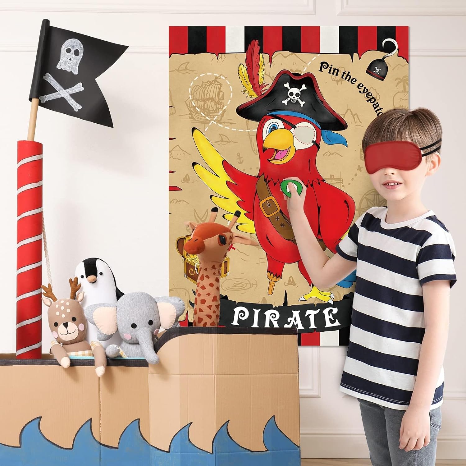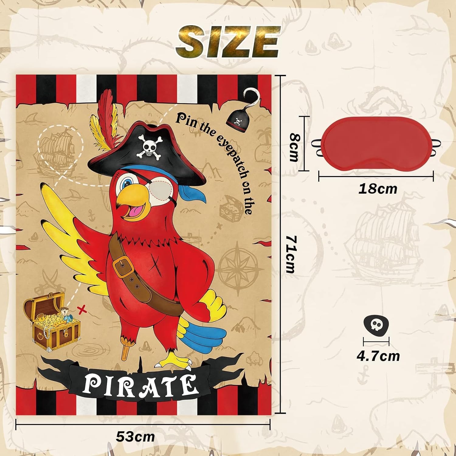 This Pirate Pin game is a good size and I bought it for my grandson's coming birthday party. He and his friends will enjoy playing it I'm sure. Item is a good size and very brightly coloured. Plastic is good thickness so should withstand 24 kids playing with it. My only nitpick would be that there is only one blindfold. Swapping it constantly from one child to the next could put a strain on the elastic which holds onto their heads. Otherwise it looks fun and is a different kind of game so hopefully it will be a success. Good price and fast delivery.