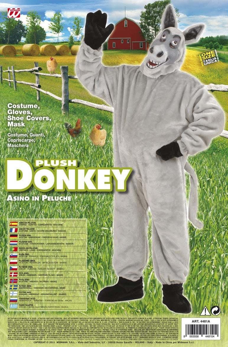 Costume da asino grigio peluche (taglia unica). Articolo composto da costume, guanti, copriscarpe e maschera. Prodotto disponibile in formato da altri animali. Occasioni: Carnevale, merenda per bambini e spettacoli.