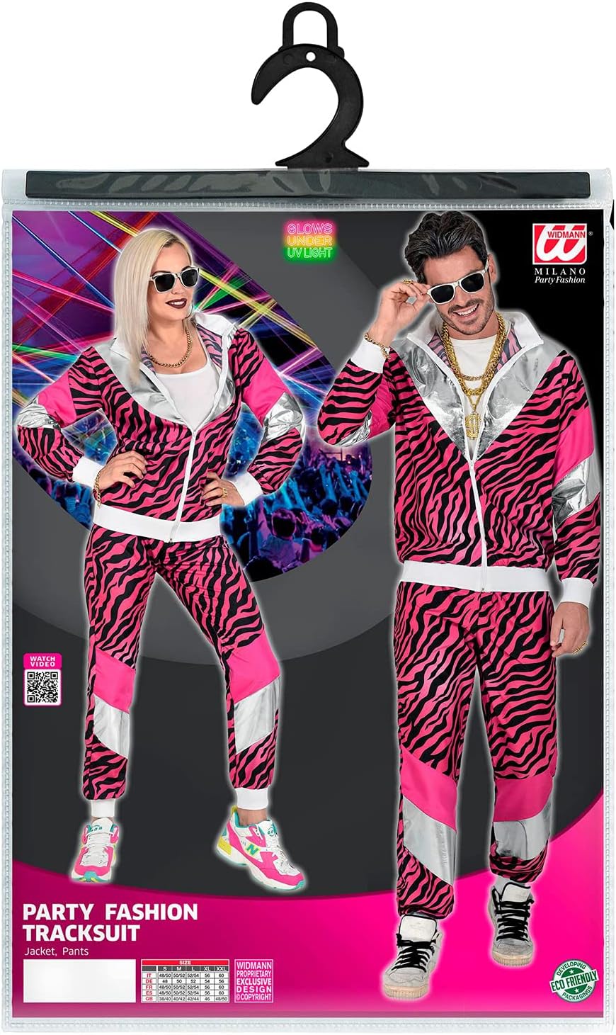Widmann - Costume anni '80 Tigre Tuta Glow Under UV Light Rosa Giacca e Pantaloni Stampa Animalier Tuta da Jogging Stile retrò Cattivo Gusto Festa Carnevale