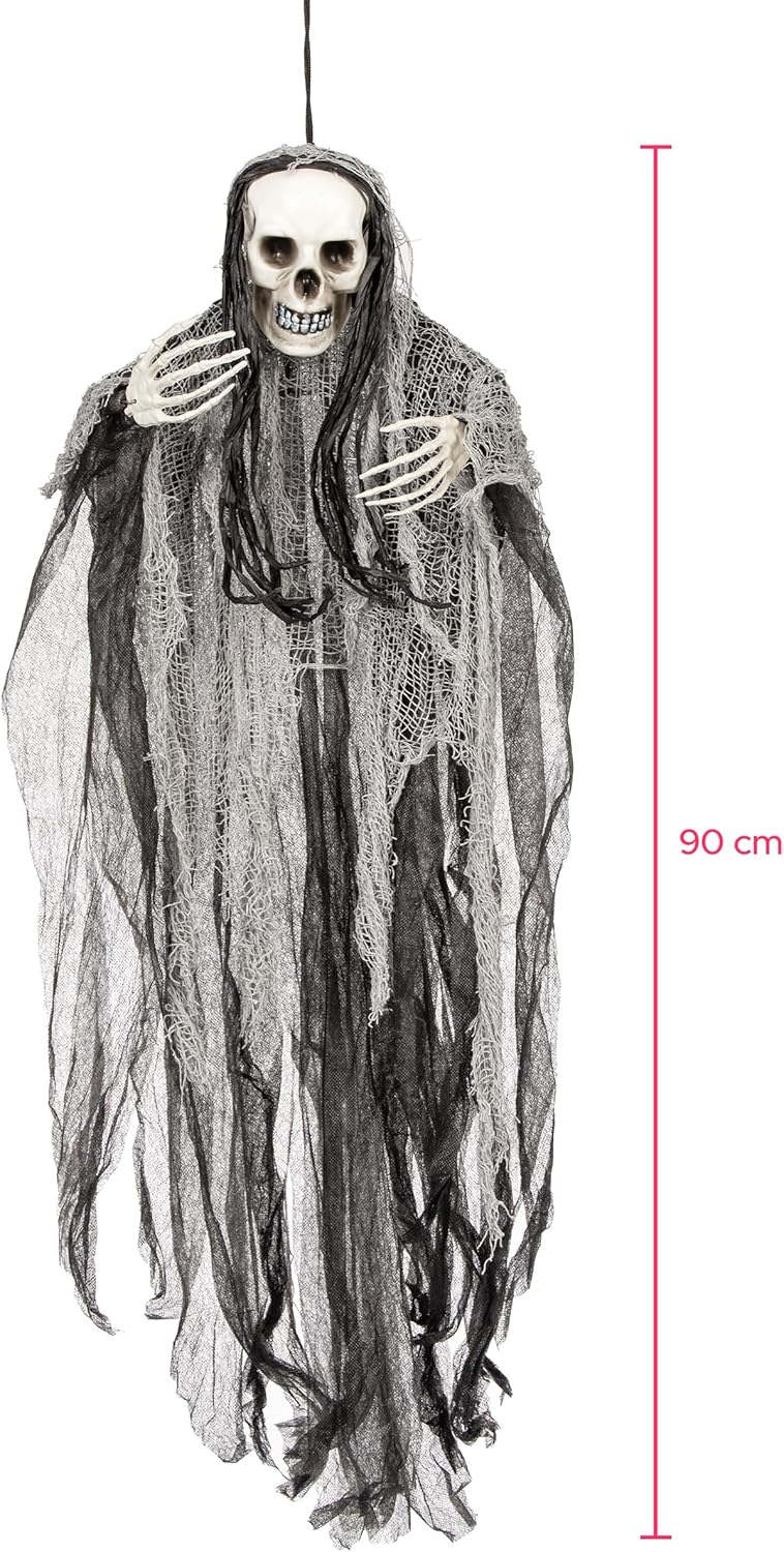 Hatte zwar die Bewertungen gelesen ... und er ist ohne Aufhängung auch nur 74 cm groß ..., wollte ihn aber trotzdem für Halloween. Habe zwar in einem Billigladen für 1€ einen ähnlichen bekommen, aber mir war das Geld für den hier es auch wert. (Er hat ja nun jedes Jahr seinen Auftritt! ;-)