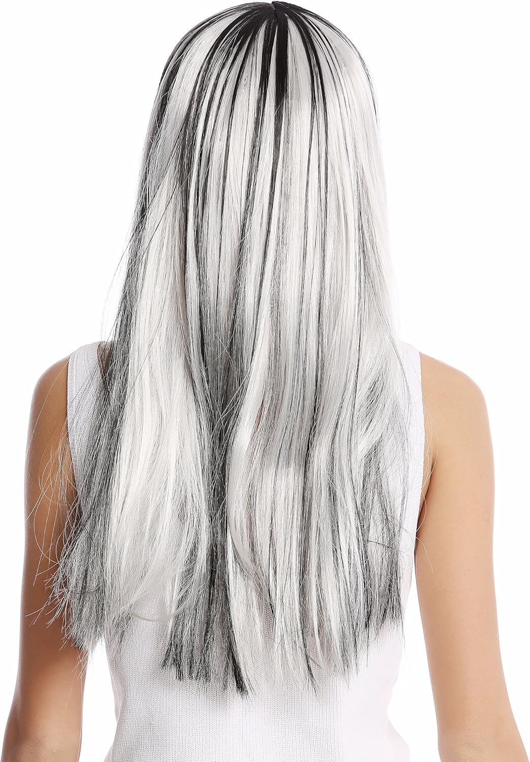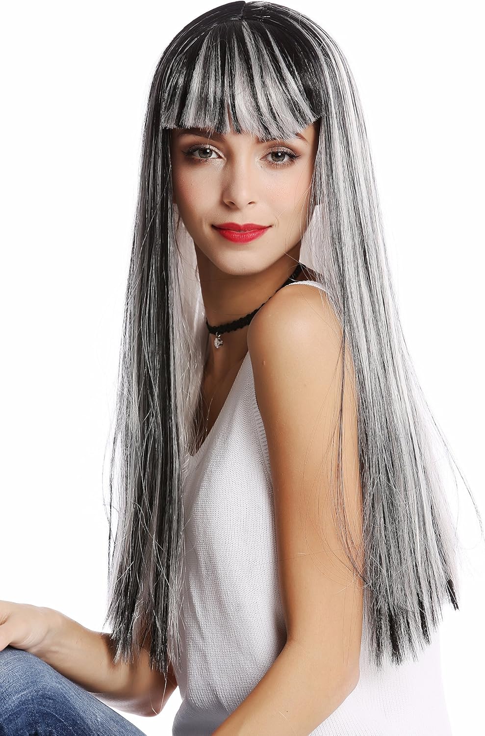 Meravigliosa e sexy parrucca da donna- i lunghi capelli lisci sono in un mix stravagante di bianco e nero con un riflesso grigio argento e una frangetta carina. Stile: Alieno proveniente da una discoteca glam interplanetaria. Nuova e con imballo originale. Marca: WIG ME UP