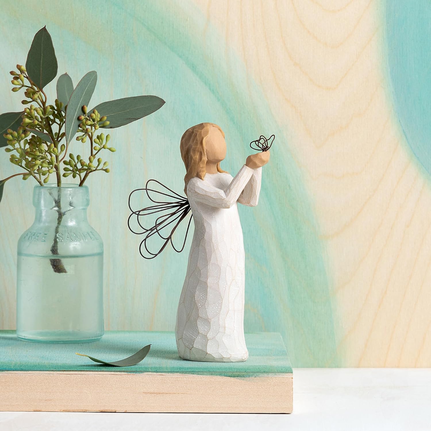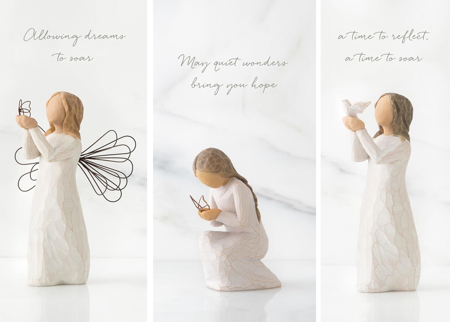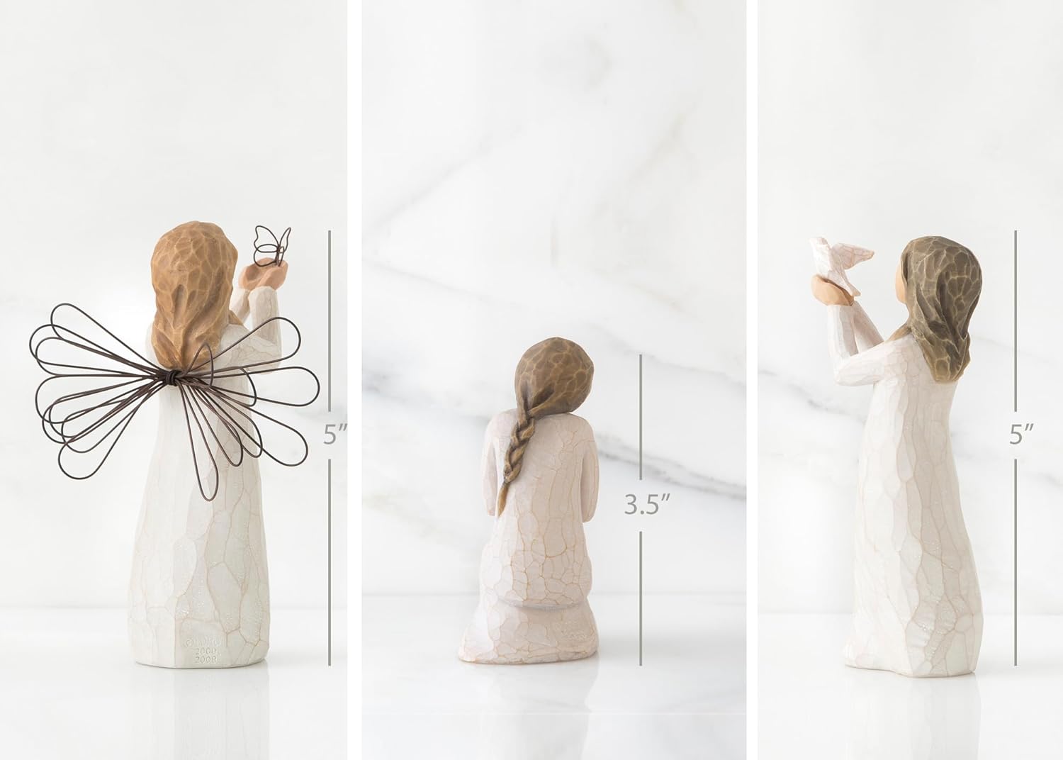 Include: Quiet Wonder figura femminile, inginocchiata con farfalla filo foglia d'oro alighted sulla sua mano estesa; Angelo della Libertà figura di un angelo femminile in piedi in abito crema con ali di filo, tenendo farfalla filo in mani estese; Soar figura di una donna in piedi in abito crema che tiene una colomba bianca su braccia estese. Figura (Quiet Wonder) misura 3,5 pollici di altezza; Figura (Angelo della Libertà) misura 5 pollici di altezza; Figura (Soar) misura 5 pollici di altezza. Un regalo per qualcuno vicino a te, come promemoria delle scoperte trovate in momenti tranquilli quando siamo fermi e presenti; un regalo di auguri per un laureato, celebrare una pietra miliare o realizzazioni; per incoraggiare, sostenere e riconoscere la forza individuale; fermarsi e ammirare il miracolo delle farfalle in natura. L'artista Susan Lordi scolpisce a mano l'originale di ogni pezzo Willow Tree dal suo studio a Kansas City, MO. Questi pezzi sono fusi da sculture originali di Susan e dipinti a mano. Le figure possono essere visualizzate sul caminetto, sul davanzale o sul tavolino in qualsiasi spazio decorativo. Confezionato in scatole montate pronte per essere regalate.