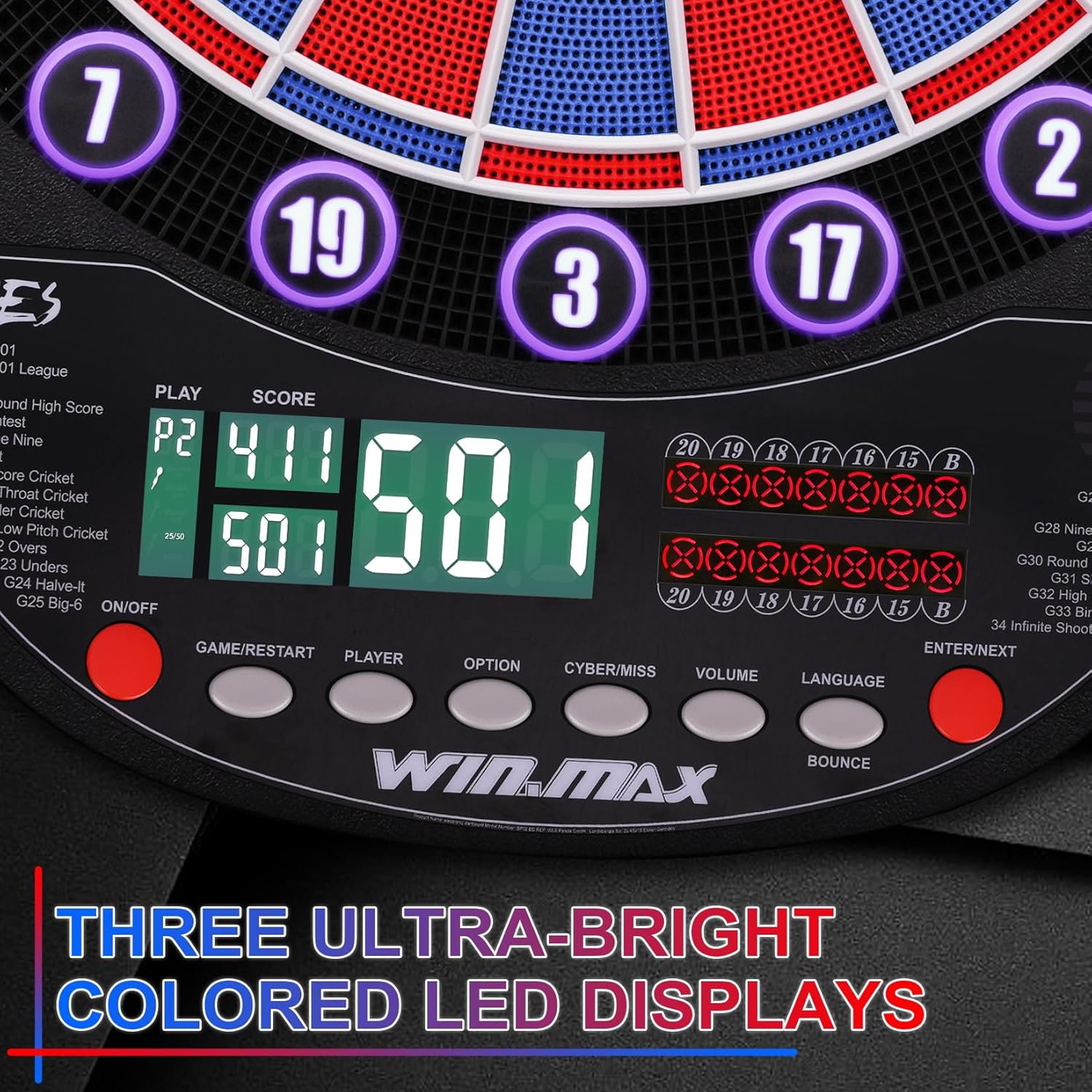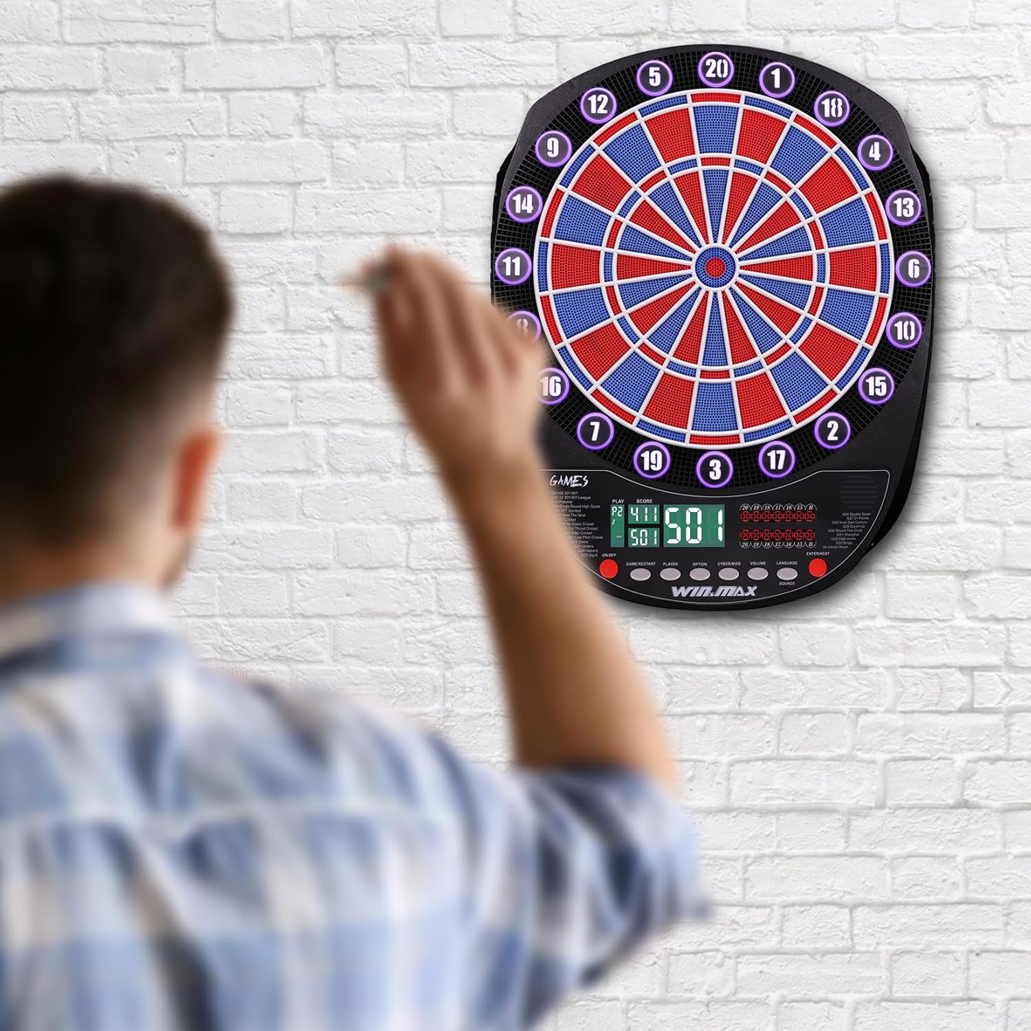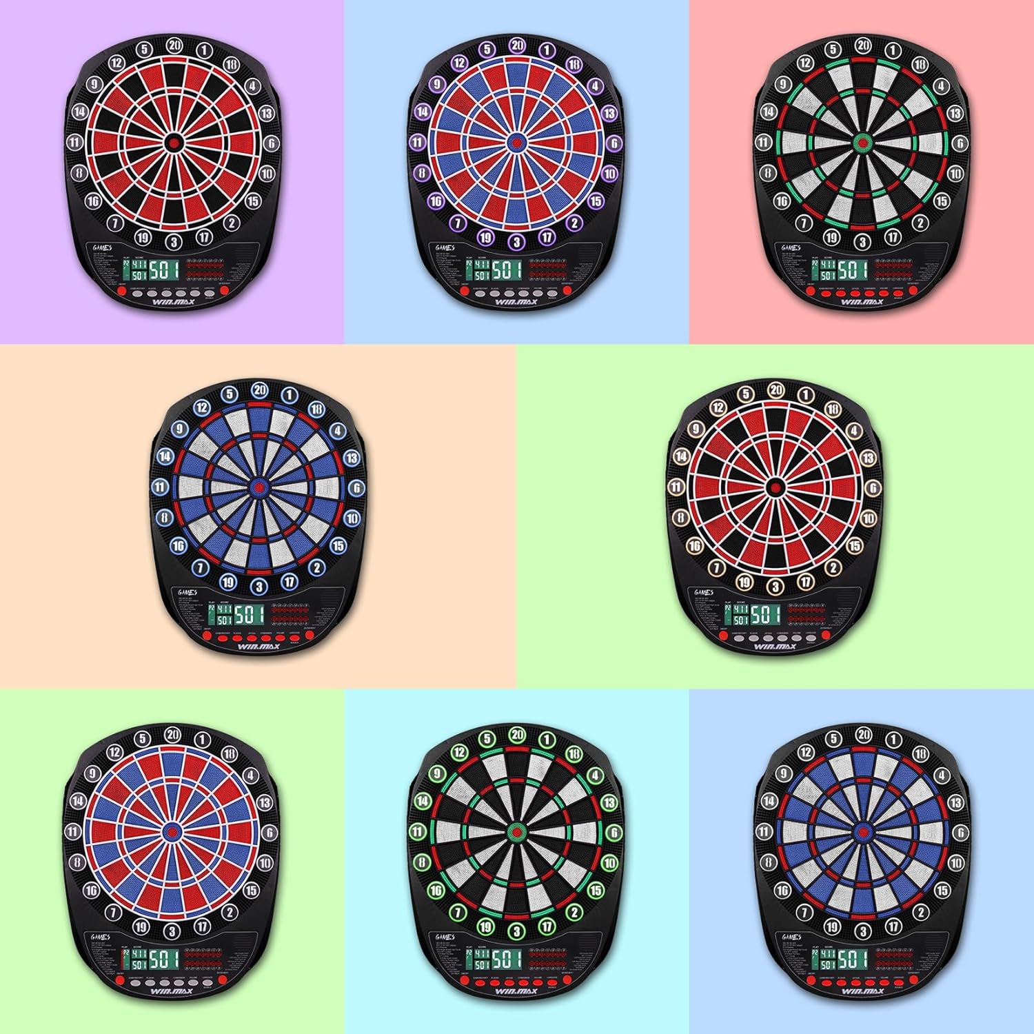 34 giochi emozionanti con 354 varianti: goditi una gamma di giochi classici e unici, tra cui 301-901, cricket, cricket senza punteggio, punteggio alto singolo round, concorso 3pt, 21 punti, overs, doppio giù, punteggio alto, Shanghai, tiro infinito e Halve-It. Tre opzioni di lingua: scegli tra inglese, tedesco o francese. Livelli sonori regolabili: seleziona tra 8 livelli sonori, inclusa l'opzione muto. Divertimento multigiocatore --- Gioca con un massimo di 8 giocatori o sfida il computer con 5 livelli di difficoltà. 3 display a LED: display chiari e grandi per migliorare la tua esperienza di gioco. Comodo contenitore per freccette: lo spazio integrato mantiene le freccette organizzate. A differenza di altri set di freccette, il nostro set è dotato di fusti splendidamente realizzati con una trama a presa completa che consente qualsiasi posizionamento delle dita piuttosto che forzare una presa anteriore o posteriore, 12 alberi in alluminio tagliati con precisione per la massima presa delle alette + 20 O-ring in gomma per evitare l'allentamento, 24 alette Polypro (standard) per una traiettoria di volo stabile.