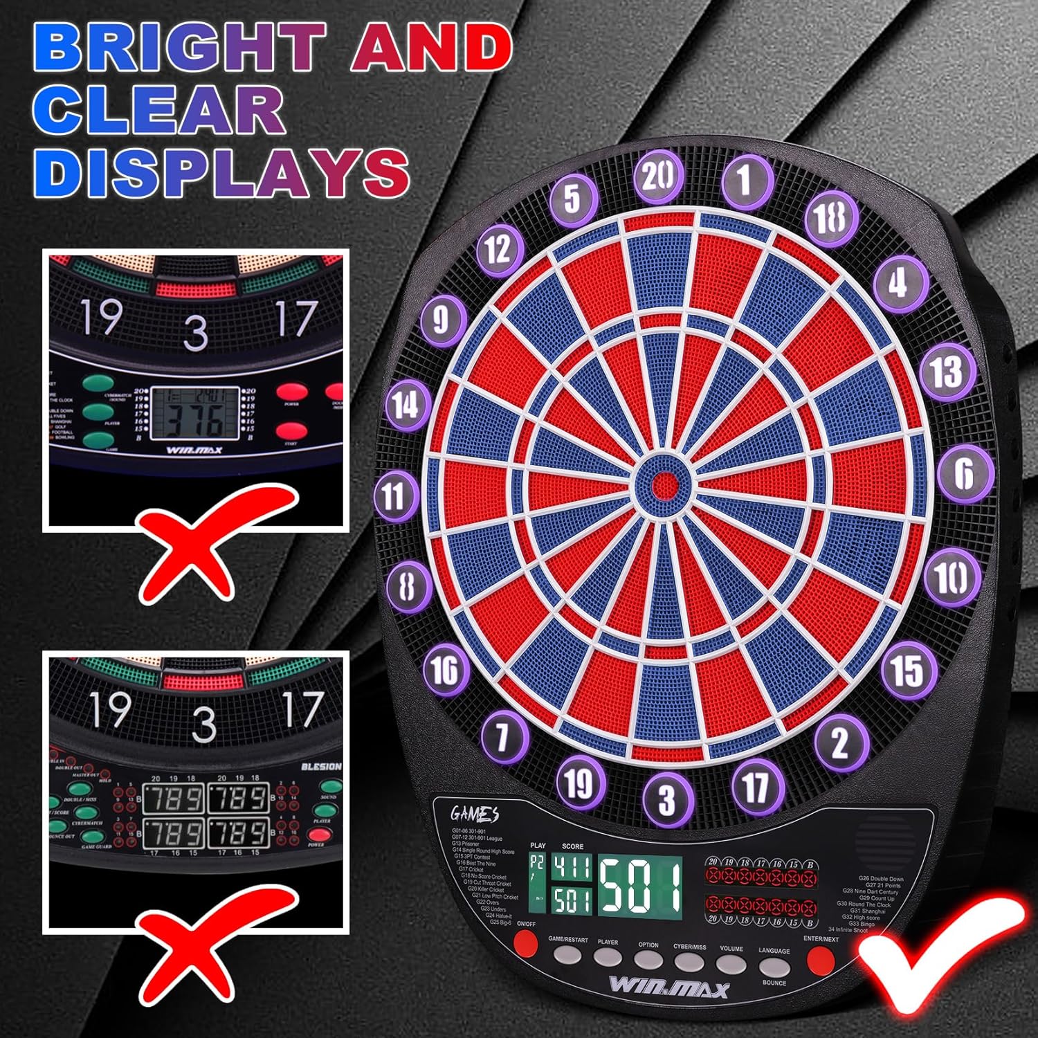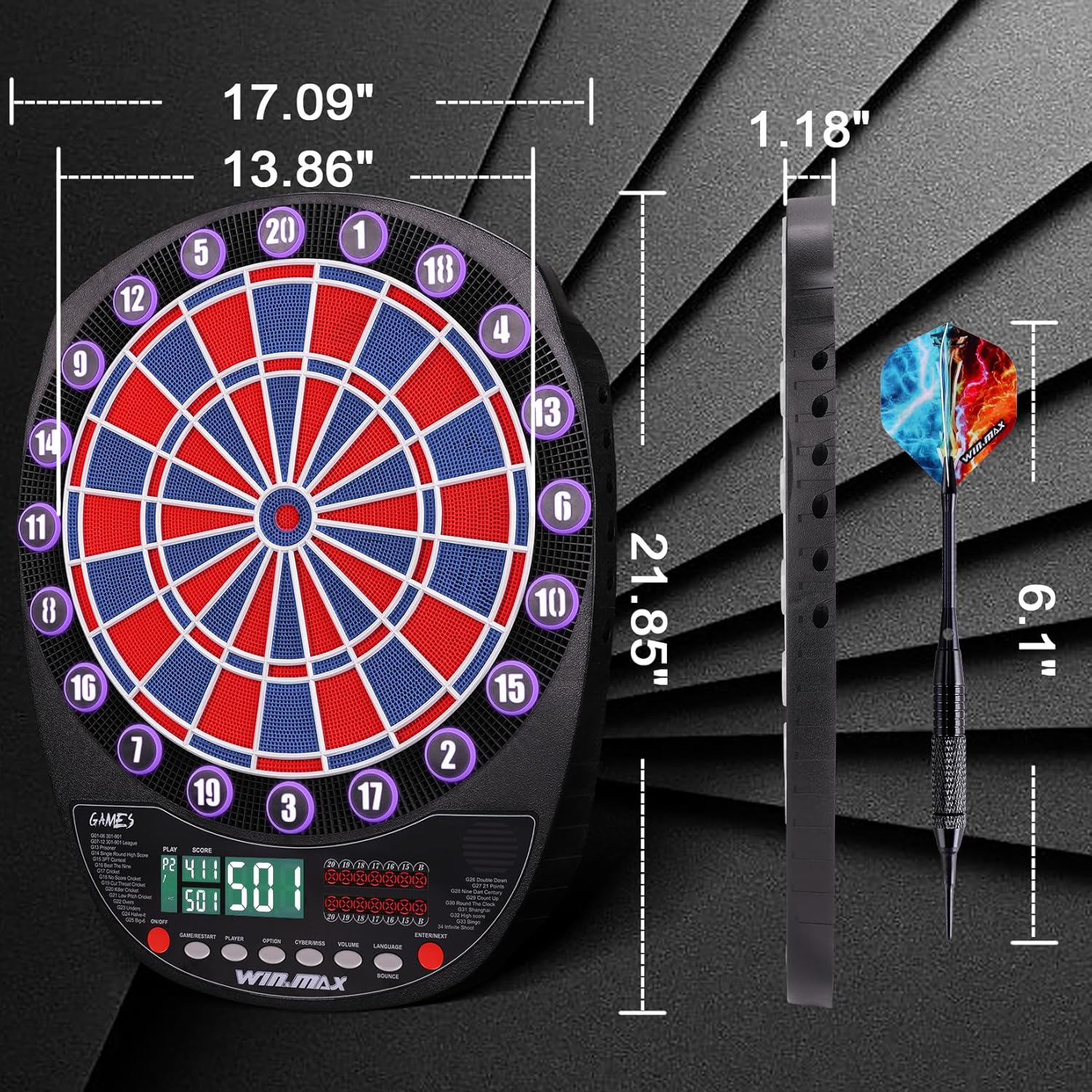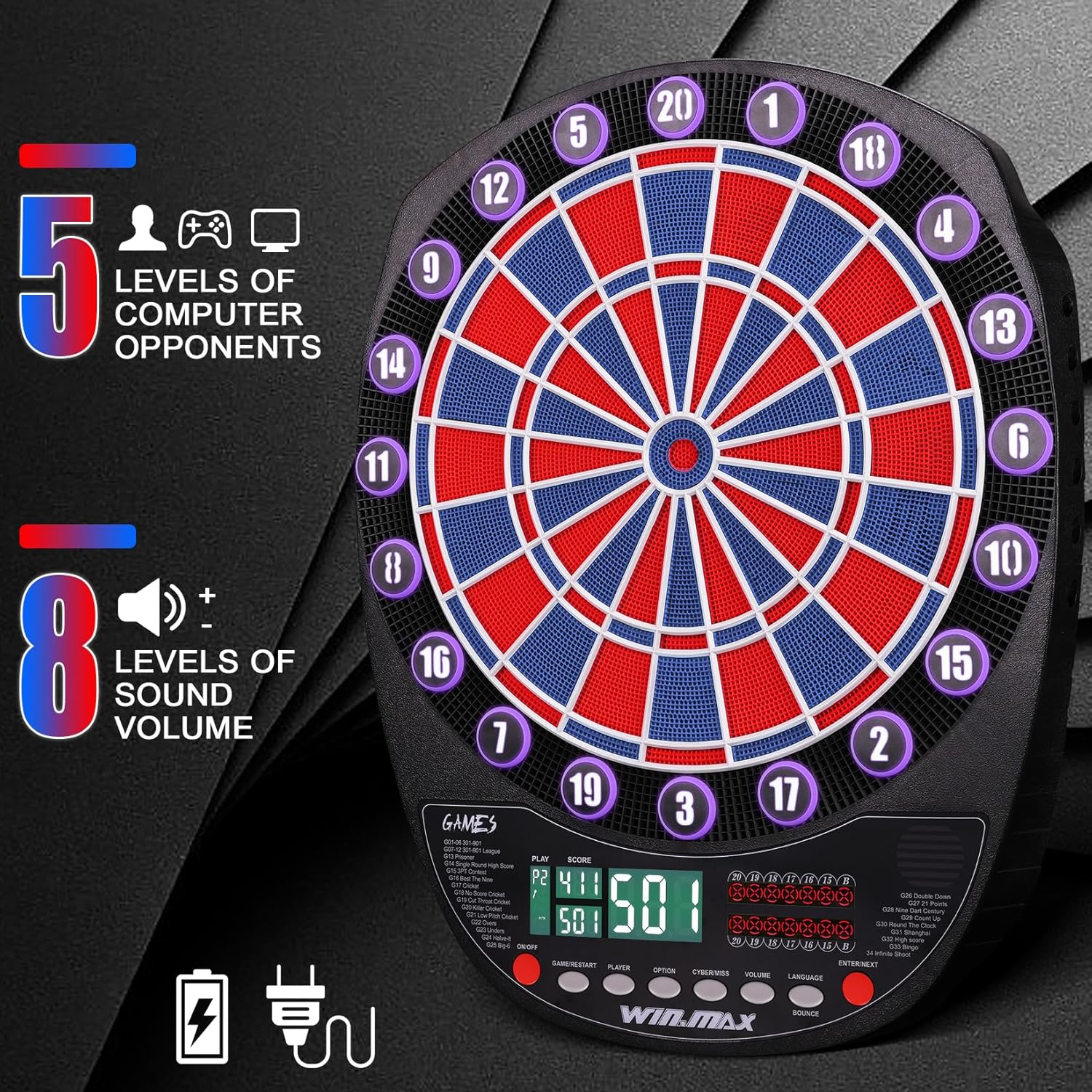 34 giochi emozionanti con 354 varianti: goditi una gamma di giochi classici e unici, tra cui 301-901, cricket, cricket senza punteggio, punteggio alto singolo round, concorso 3pt, 21 punti, overs, doppio giù, punteggio alto, Shanghai, tiro infinito e Halve-It. Tre opzioni di lingua: scegli tra inglese, tedesco o francese. Livelli sonori regolabili: seleziona tra 8 livelli sonori, inclusa l'opzione muto. Divertimento multigiocatore --- Gioca con un massimo di 8 giocatori o sfida il computer con 5 livelli di difficoltà. 3 display a LED: display chiari e grandi per migliorare la tua esperienza di gioco. Comodo contenitore per freccette: lo spazio integrato mantiene le freccette organizzate. A differenza di altri set di freccette, il nostro set è dotato di fusti splendidamente realizzati con una trama a presa completa che consente qualsiasi posizionamento delle dita piuttosto che forzare una presa anteriore o posteriore, 12 alberi in alluminio tagliati con precisione per la massima presa delle alette + 20 O-ring in gomma per evitare l'allentamento, 24 alette Polypro (standard) per una traiettoria di volo stabile.