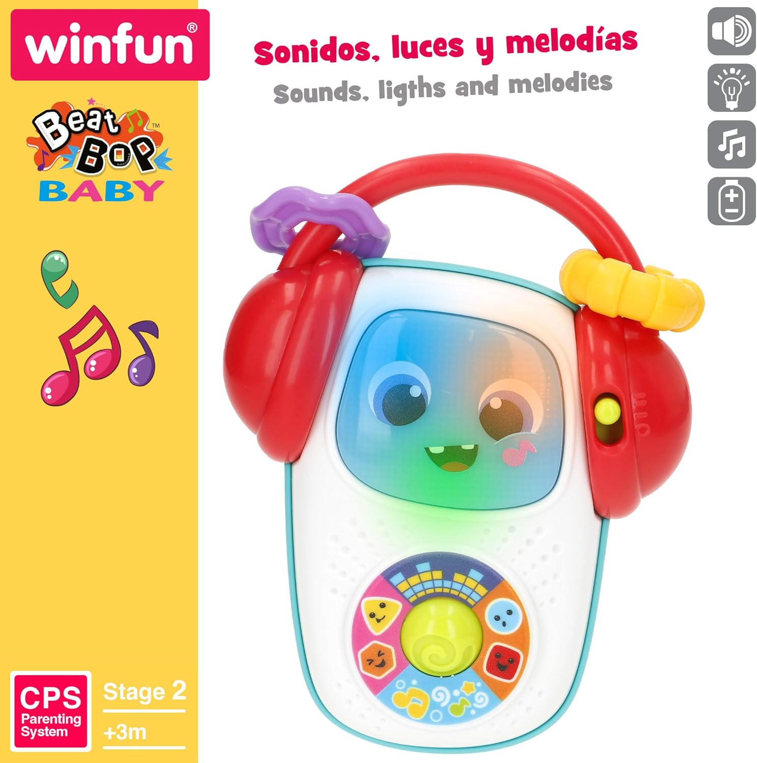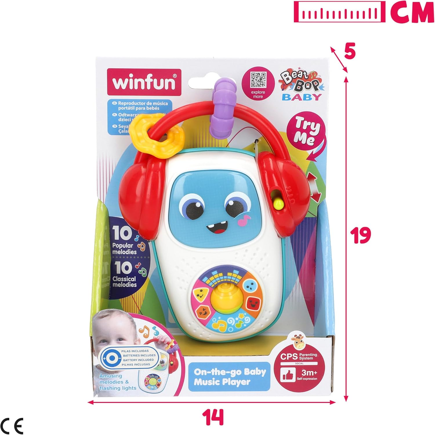 Età: consigliato 0-6 mesi, classificato in fase 1 sotto il concetto CPS Parenting System di Winfun Design interattivo: lettore musicale portatile in colori vivaci e accattivanti, con diverse trame, dimensioni compatte e manico ergonomico, appositamente progettato per una presa facile in mani piccole Luce: pulsante centrale a forma di faccina sorridente che si illumina premendo per cambiare melodie Suoni: 10 melodie popolari, 10 classiche e rotola manuale con suono clic-clac (funziona con 2 batterie AAA) Valori: giocattolo che favorisce la stimolazione sensoriale, l'espressione di sé e sviluppa l'abilità manuale