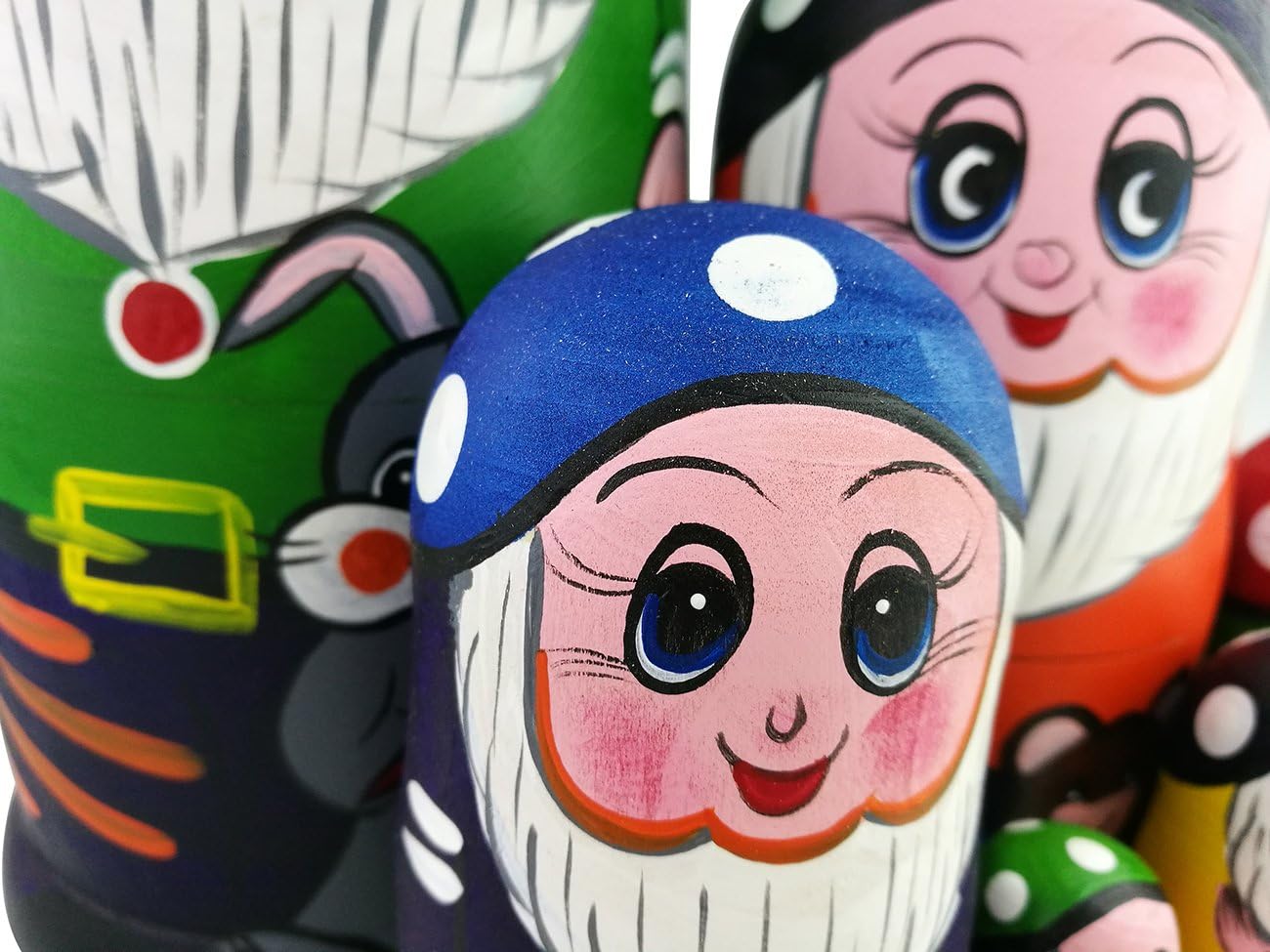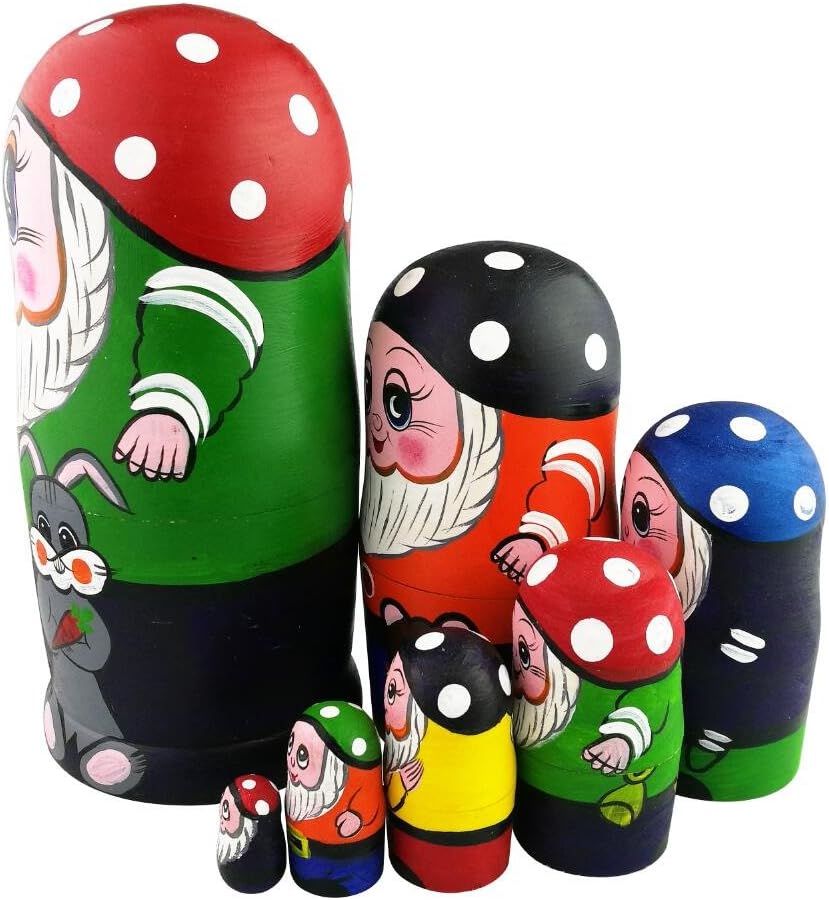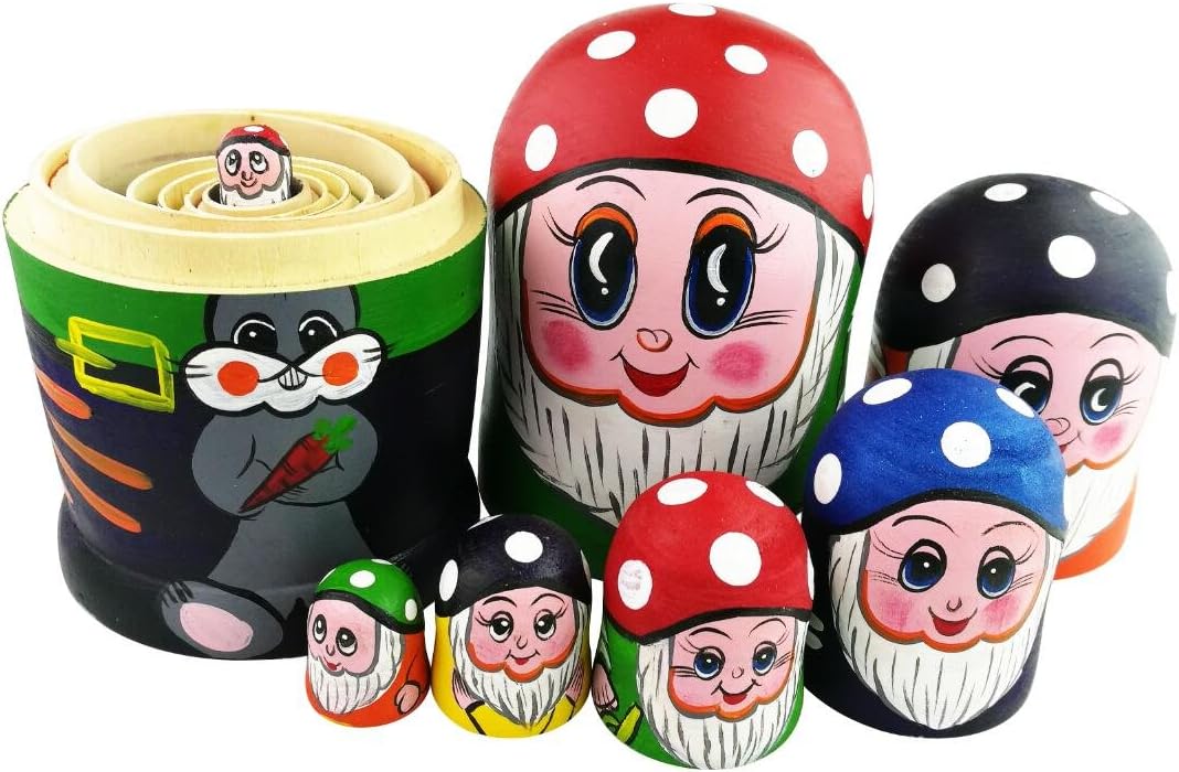 Bambole nidificanti a tema Sette Nani. Ogni gnomo è in una posa diversa o tiene in mano cose diverse 3 colori tra cui scegliere: blu, viola e rosso (distinti dal colore del cappuccio) Contiene 7 bambole di dimensioni decrescenti posizionate una dentro l'altra per apparire come un delizioso regalo per compiacere i tuoi amici/familiari. Decorazione carina per rendere speciale il tuo posto Puoi usarlo per giocare con i tuoi bambini, come gioco di ruolo quando racconti una storia, goditi il tempo genitore-figlio