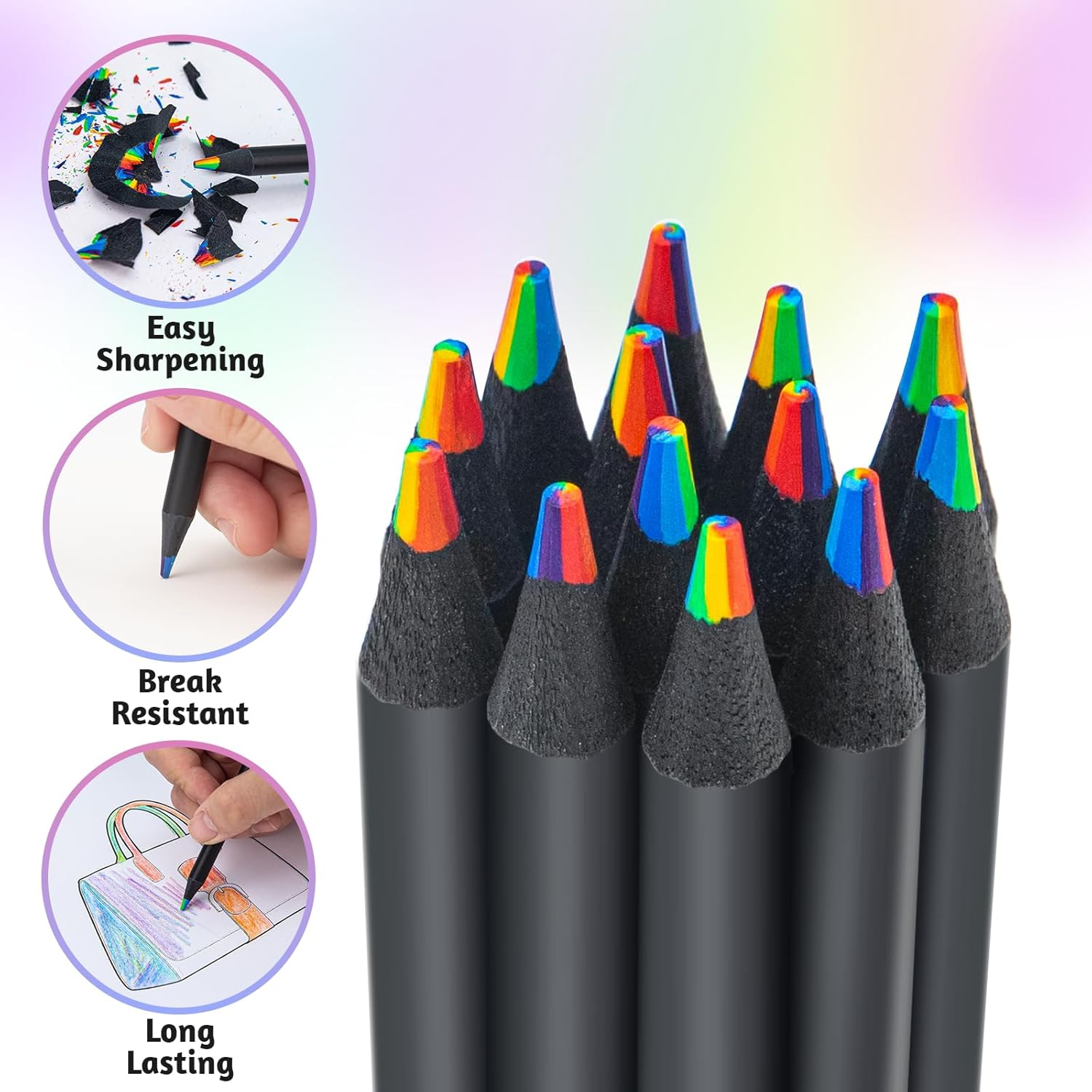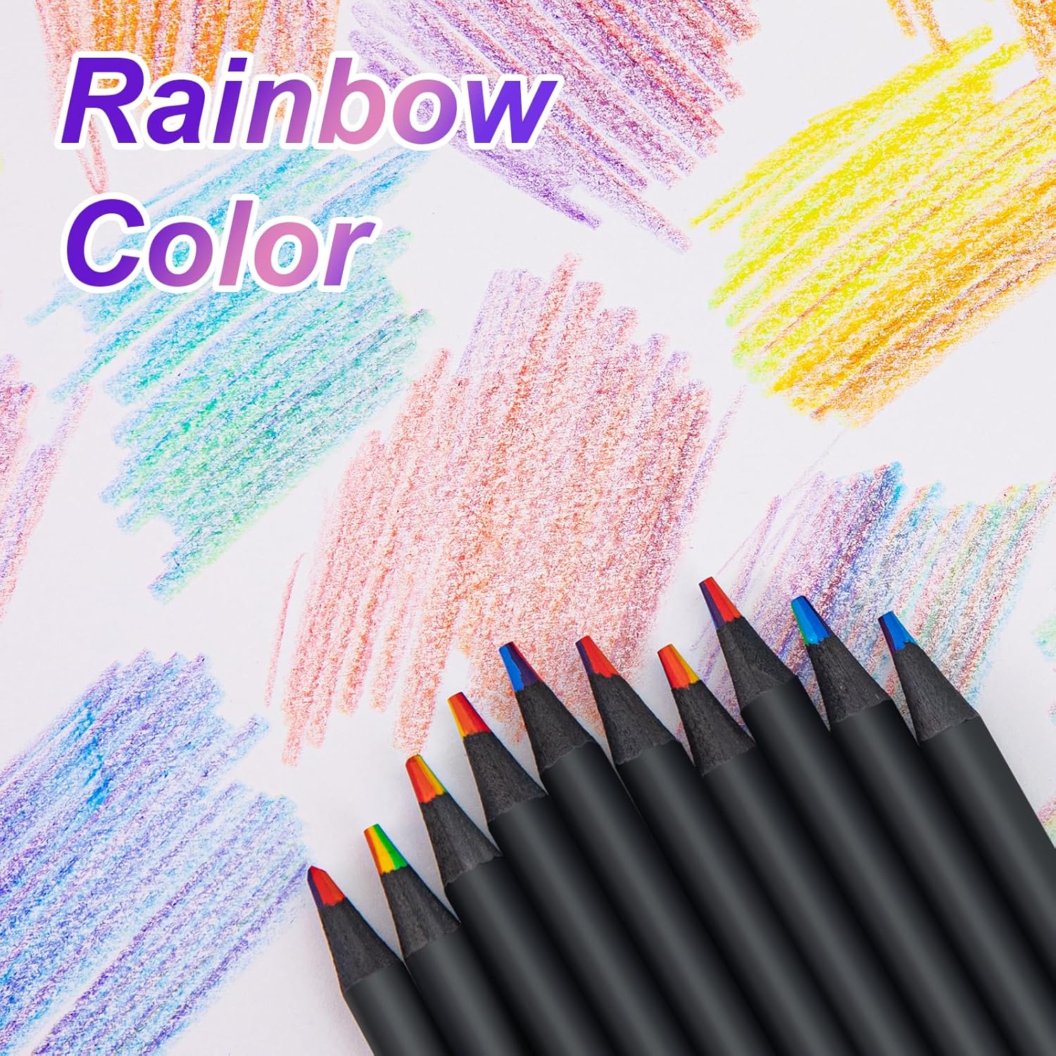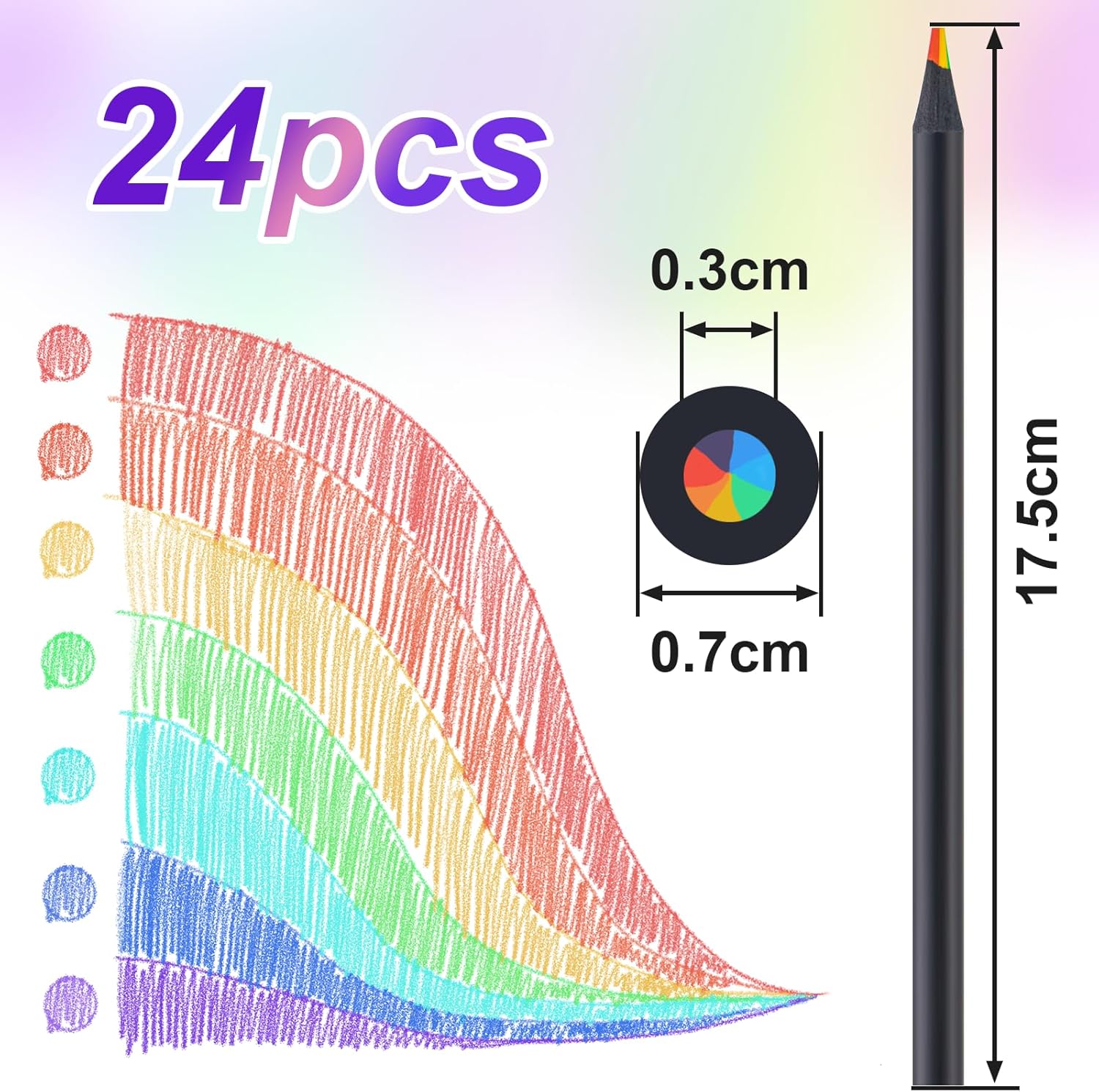 【Colore Arcobaleno 7 in 1】 Ogni set contiene 24 penne arcobaleno, ogni penna arcobaleno è composta da una miscela di sette colori. Ruota o inclina la punta della penna per creare sfumature o effetti di fusione diversi in modo casuale. 【Alta Qualità】 Le mine della penna arcobaleno sono realizzate con pigmenti di alta qualità, che sono dai colori vivaci, facili da colorare, hanno tratti morbidi e non sono facili da sbiadire e rompersi, rendendoli durevoli. 【Design Ergonomico】 Il fusto della penna arcobaleno presenta un design rotondo morbido e antiscivolo, ergonomico, comodo da tenere e facile da controllare, adatto per scrivere e disegnare a lungo termine. 【Facile da Affilare】 Il portamatite arcobaleno è realizzato in legno nero ad alta densità, che non è facile da rompere durante l'affilatura e può facilmente controllare la nitidezza della matita. La penna arcobaleno pre-affilata ti offre un'esperienza di disegno più confortevole. 【Applicazioni per Scene Multiple】 La penna arcobaleno è adatta per pittura creativa, schizzi a colori, colorazione, graffiti, marcatura, ecc. Scelta regalo ideale per Pasqua, Festa dei bambini, Natale, compleanni dei bambini e altre festività.