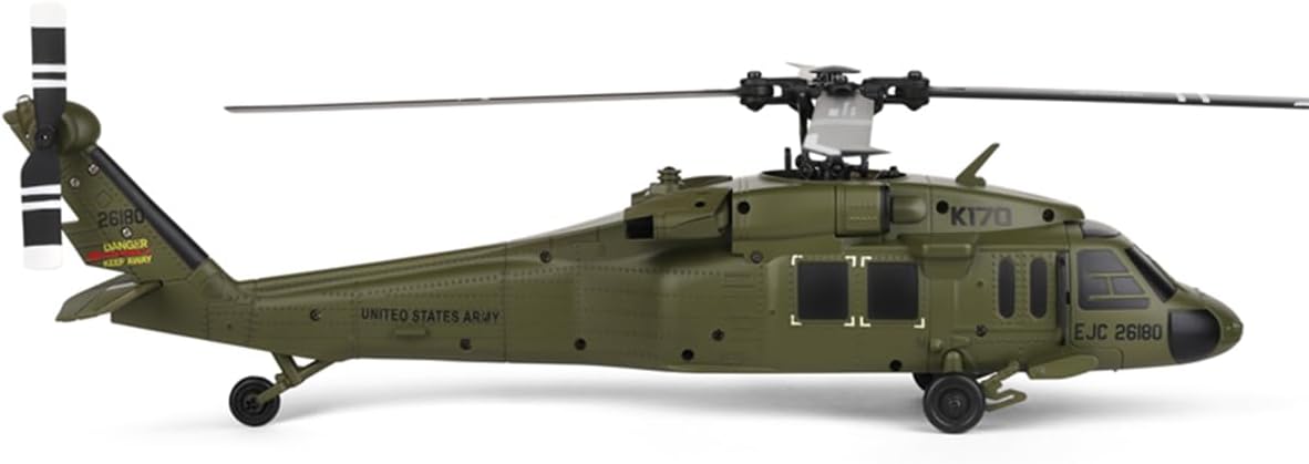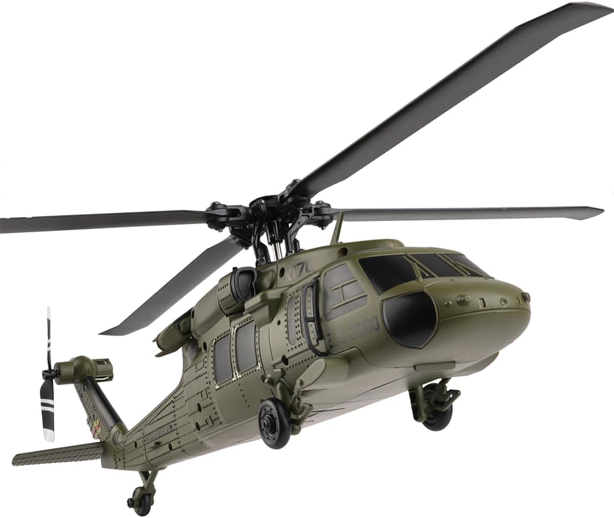 Telecomando a 4 canali con pedale acceleratore regolabile e avvisi di batteria scarica: basta passare dall'acceleratore sinistro a quello destro per un controllo confortevole. Sia il telecomando che l'elicottero hanno avvisi di bassa tensione della batteria per garantire un'esperienza di volo sicura. Modello altamente realistico UH-60L Black Hawk: una replica in scala del Black Hawk UH-60L, questo elicottero Flybarless presenta un esterno finemente dettagliato e un sistema di rotore a quattro pale per un'elevata precisione di simulazione. Prestazioni di volo stabili e potenti: le pale del rotore ottimizzate aerodinamicamente garantiscono prestazioni elevate e un'eccellente auto-stabilizzazione. L'avanzato giroscopio a 6 assi in modalità 6G garantisce un volo silenzioso e fluido, rendendolo ideale per i principianti. CARATTERISTICHE USER FRIENDLY E SICUREZZA Il design a 4CH include mantenimento dell'altitudine, presa con un pulsante e controlli intuitivi di volo (salita, avanti/indietro, svolta sinistra/destra, volo laterale sinistra/destra). Uno speciale caricabatterie USB impedisce il sovraccarico della batteria e garantisce una lunga durata. Potente motore e caratteristiche di sicurezza avanzate Dotato di un potente motore 1106 brushless outdoor runner e una potente batteria LiPo da 3,8 V 800 mAh 20C che fornisce fino a 8 minuti di volo. La protezione contro la perdita di segnale a prova di guasto previene gli incidenti: se il segnale viene perso, l'elicottero si libra per 2 secondi prima di affondare gradualmente.