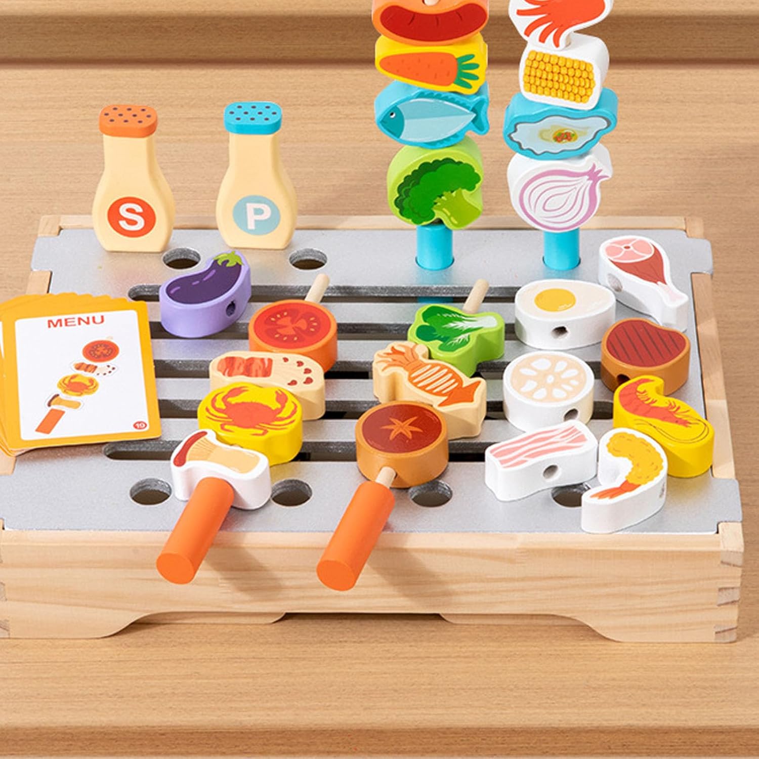 Design della cucina realistica: questo Playset per barbecue in legno imita una vera griglia da cucina, ispirando l'immaginazione dei bambini e permettendo loro di godersi il divertimento del barbecue attraverso il gioco di ruolo. Materiale in legno sicuro: a base di legno di gomma, il giocattolo barbecue presenta una superficie lucida senza schegge. La vernice a base d'acqua è inodore e soddisfa gli standard di sicurezza per i giocattoli per bambini, garantendo la tranquillità. Gioco interattivo multifunzionale: dotato di spiedini realistici e accessori a griglia, i bambini possono capovolgere e cucinare cibo, migliorare le loro mani e la comprensione dei processi di cottura. INTERAZIONE DEL MATORE BAMBINO: questo gioco da gioco per la cucina del barbecue è l'ideale per i genitori e i bambini a partecipare al ruolo di ruolo insieme, promuovendo la comunicazione linguistica e il legame emotivo durante il gioco. Giocattoli educativi: simulando una scena di cucina, questo giocattolo aiuta i bambini a conoscere cibo, colori e numeri mentre sviluppano abilità cognitive essenziali come smistamento, abbinamento e coordinazione per gli occhi per la mano.