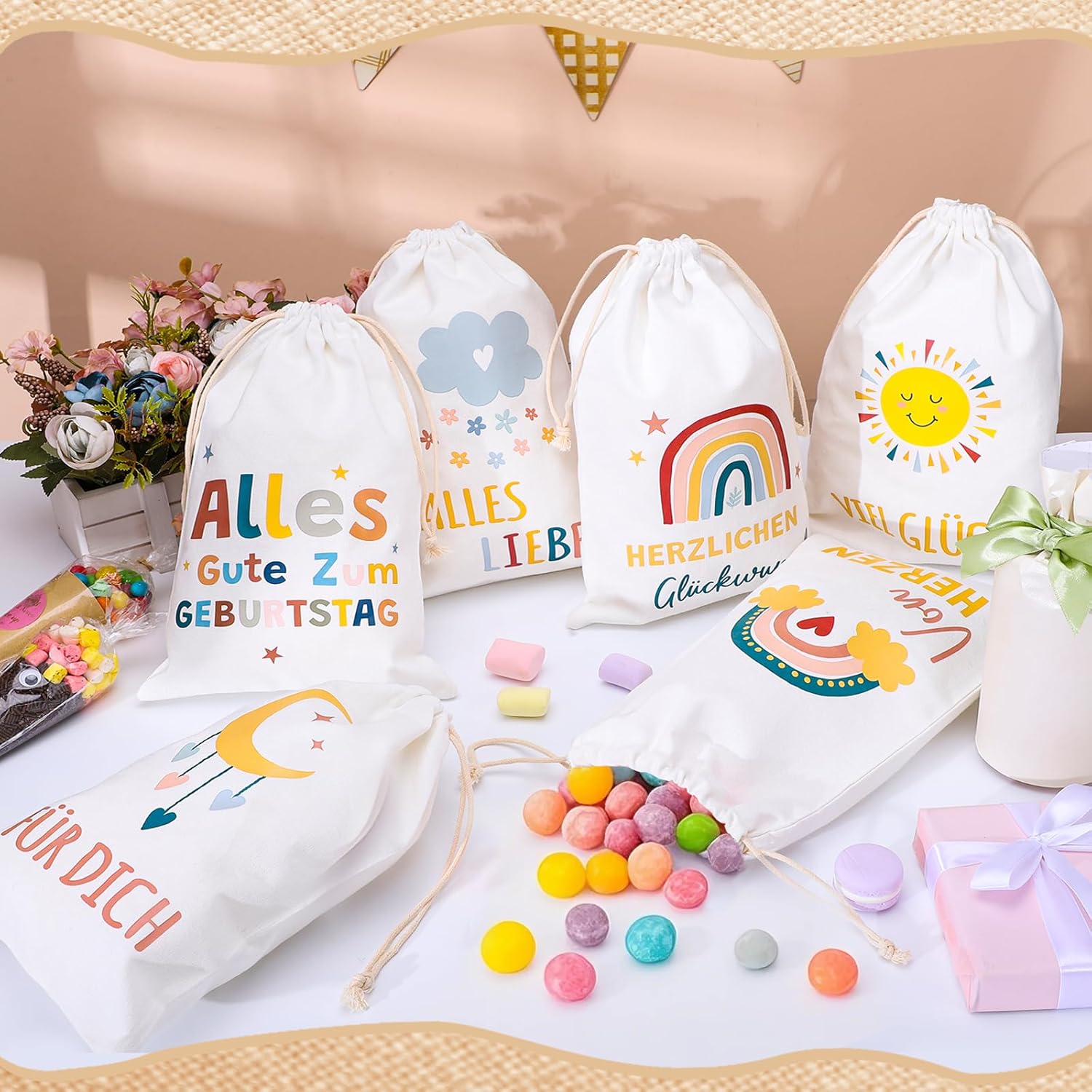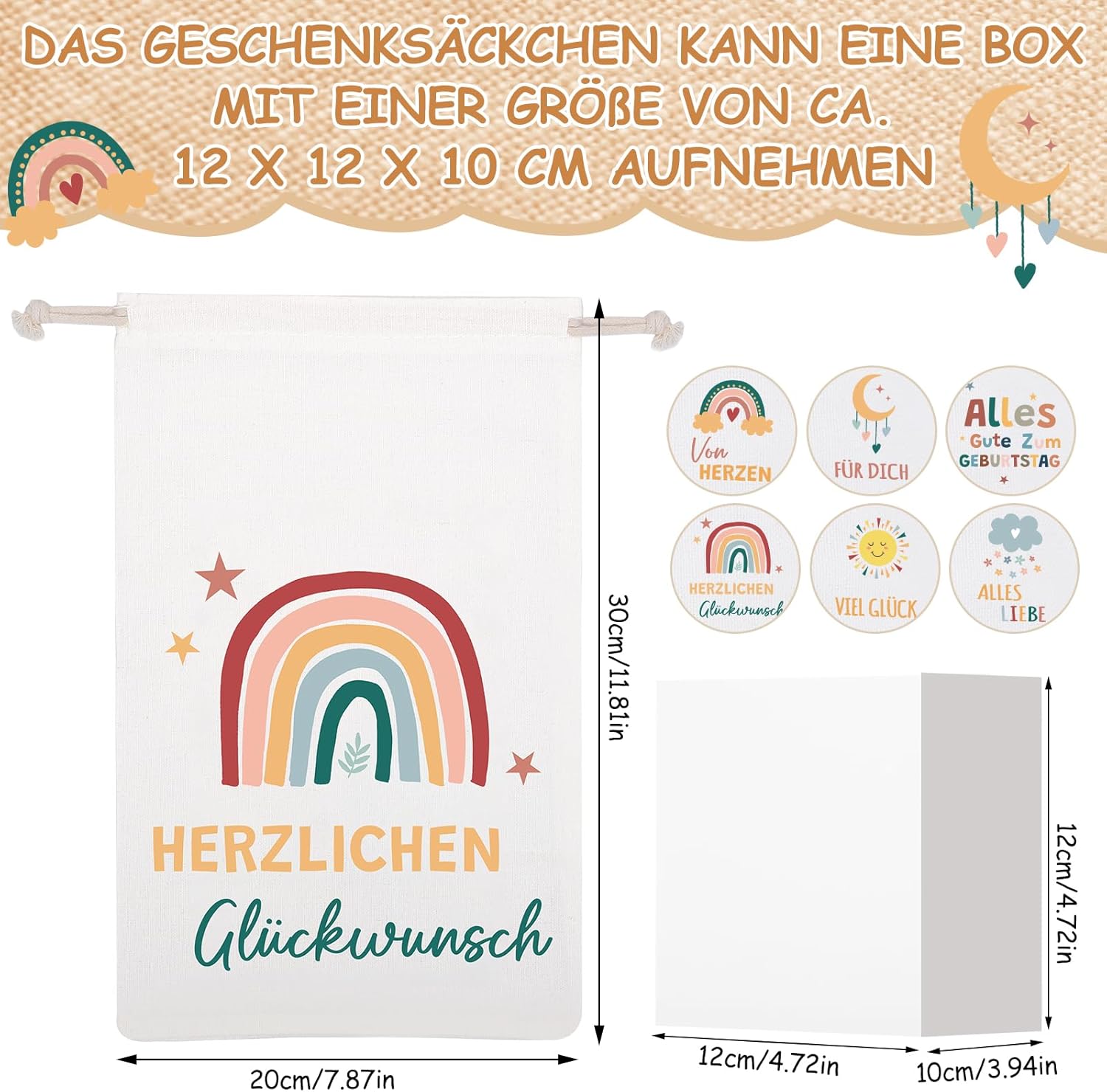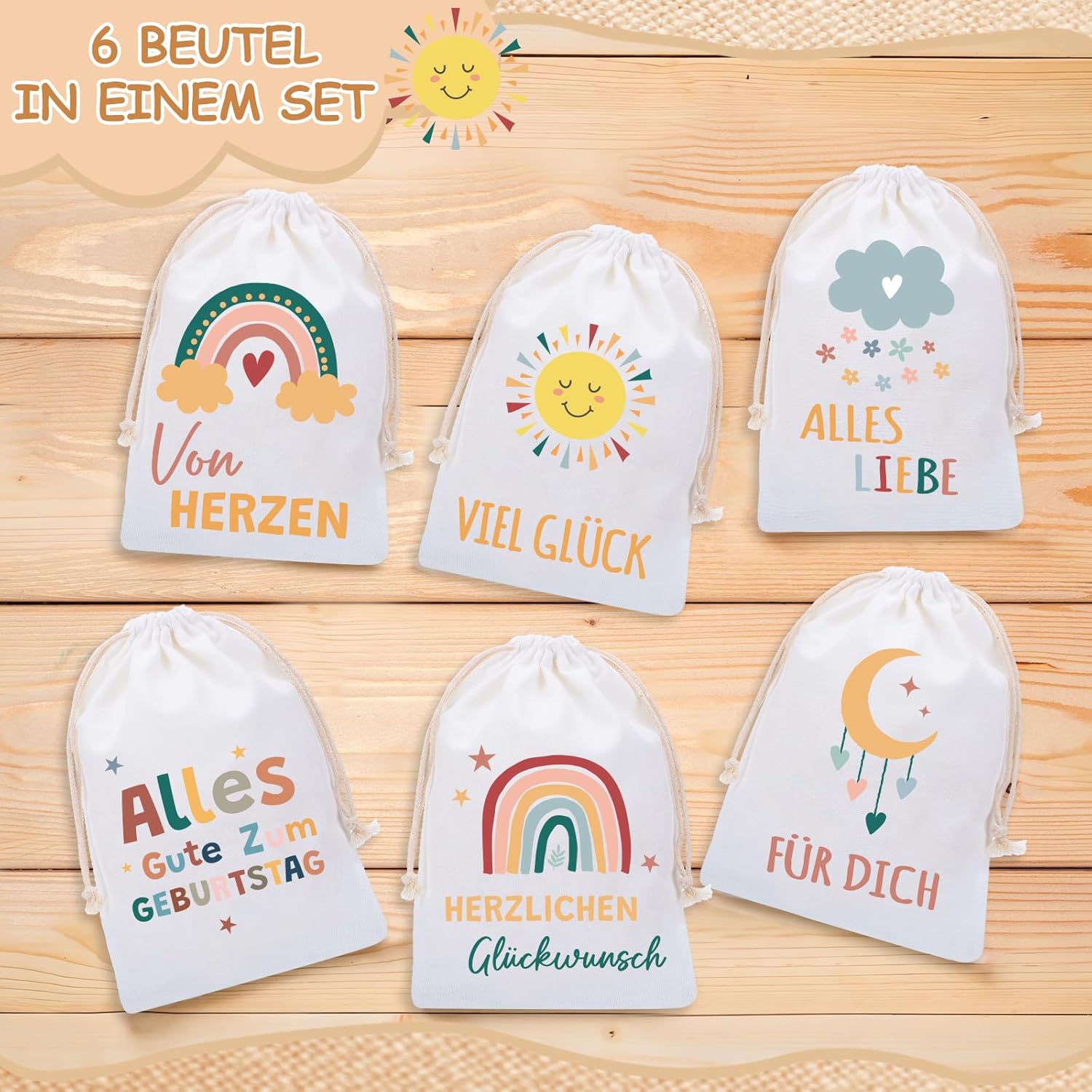 6 BELLISSIMI DISEGNI - 6 sacchetti regalo stampati con bellissimi motivi arcobaleno, sole, luna, nuvole e altri, dolci e adorabili, perfetti per confezionare regali. MATERIALE - Il sacchetto regalo è realizzato in cotone, stabile e robusto, morbido e confortevole al tatto, cotone naturale e riutilizzabile. Consigli per la cura: si consiglia il lavaggio a mano, non in lavatrice. DIMENSIONE - La dimensione del sacchetto regalo è 20 x 30 cm/7,87 x 11,81 pollici e può essere utilizzata per regali, giocattoli, accessori o souvenir più grandi. FACILE DA USARE - Il sacchetto regalo in cotone ha una doppia coulisse, è facile da aprire e chiudere e puoi riporre facilmente i tuoi oggetti all'interno. VERSATILI - I sacchetti regalo sono perfetti per confezionare regali e possono essere utilizzati per regali di Natale, regali di compleanno, regali di nascita, regali di nozze, ecc.