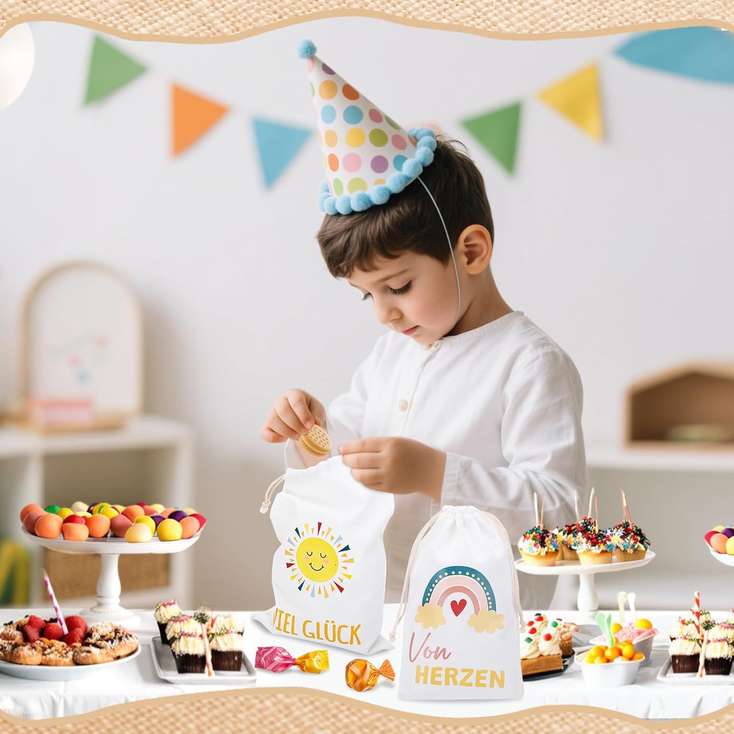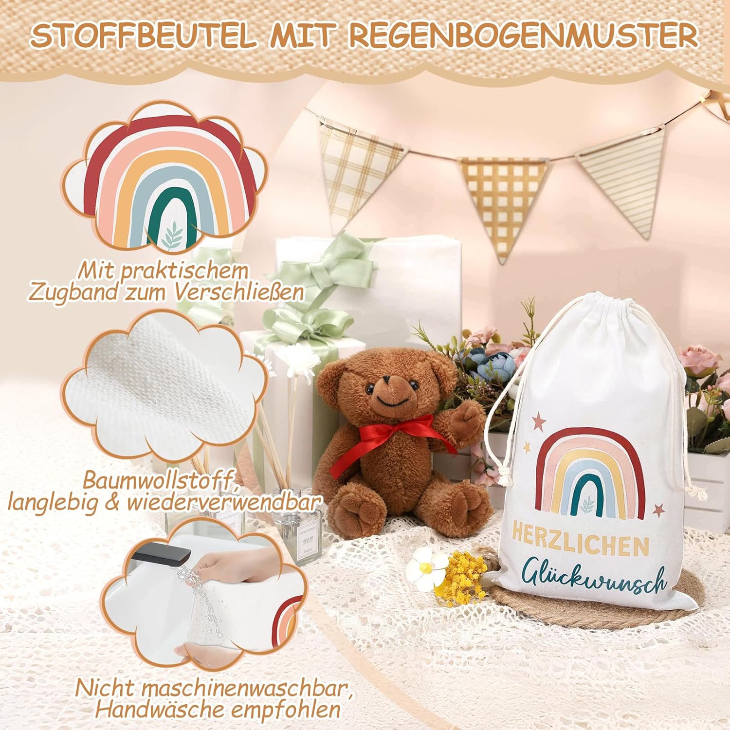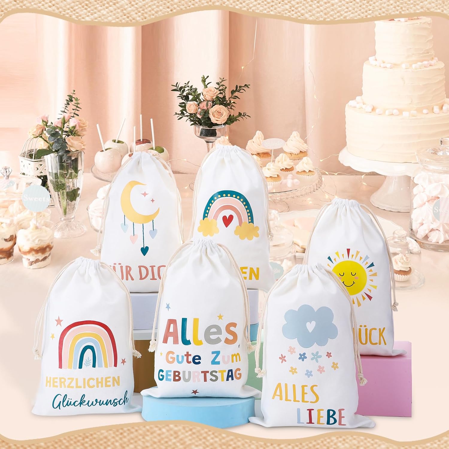 6 BELLISSIMI DISEGNI - 6 sacchetti regalo stampati con bellissimi motivi arcobaleno, sole, luna, nuvole e altri, dolci e adorabili, perfetti per confezionare regali. MATERIALE - Il sacchetto regalo è realizzato in cotone, stabile e robusto, morbido e confortevole al tatto, cotone naturale e riutilizzabile. Consigli per la cura: si consiglia il lavaggio a mano, non in lavatrice. DIMENSIONE - La dimensione del sacchetto regalo è 20 x 30 cm/7,87 x 11,81 pollici e può essere utilizzata per regali, giocattoli, accessori o souvenir più grandi. FACILE DA USARE - Il sacchetto regalo in cotone ha una doppia coulisse, è facile da aprire e chiudere e puoi riporre facilmente i tuoi oggetti all'interno. VERSATILI - I sacchetti regalo sono perfetti per confezionare regali e possono essere utilizzati per regali di Natale, regali di compleanno, regali di nascita, regali di nozze, ecc.