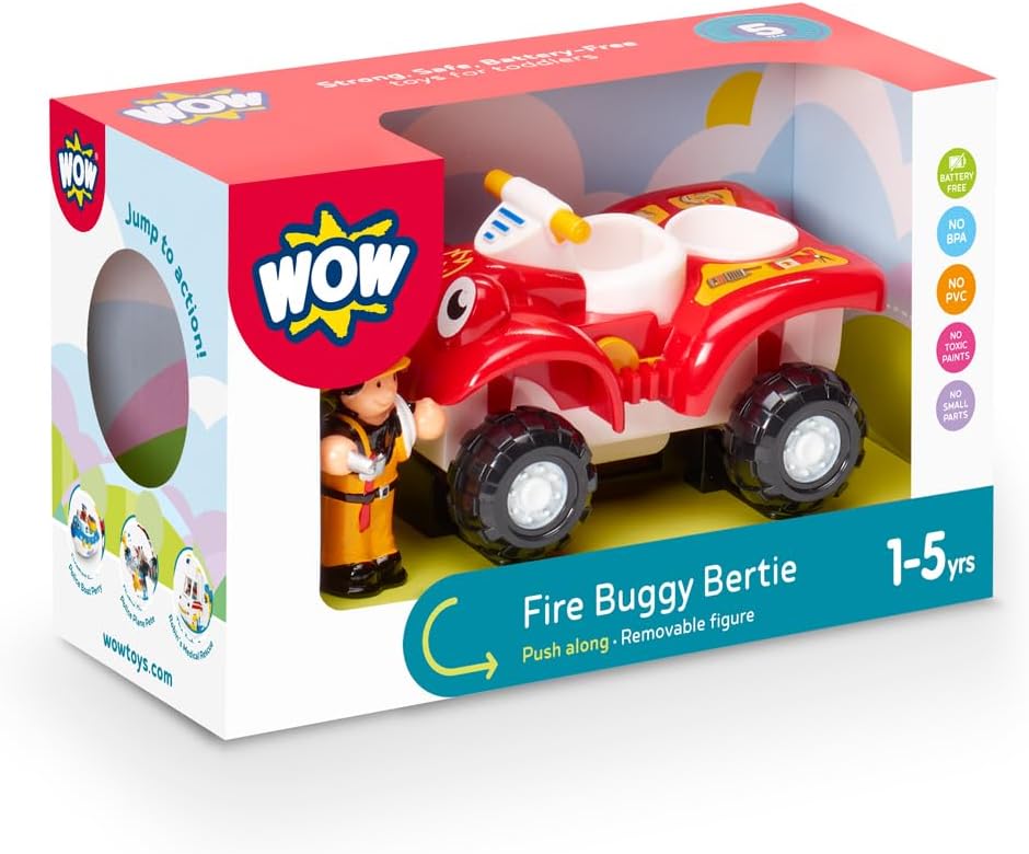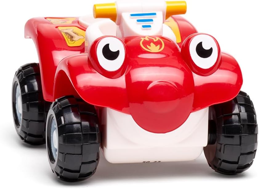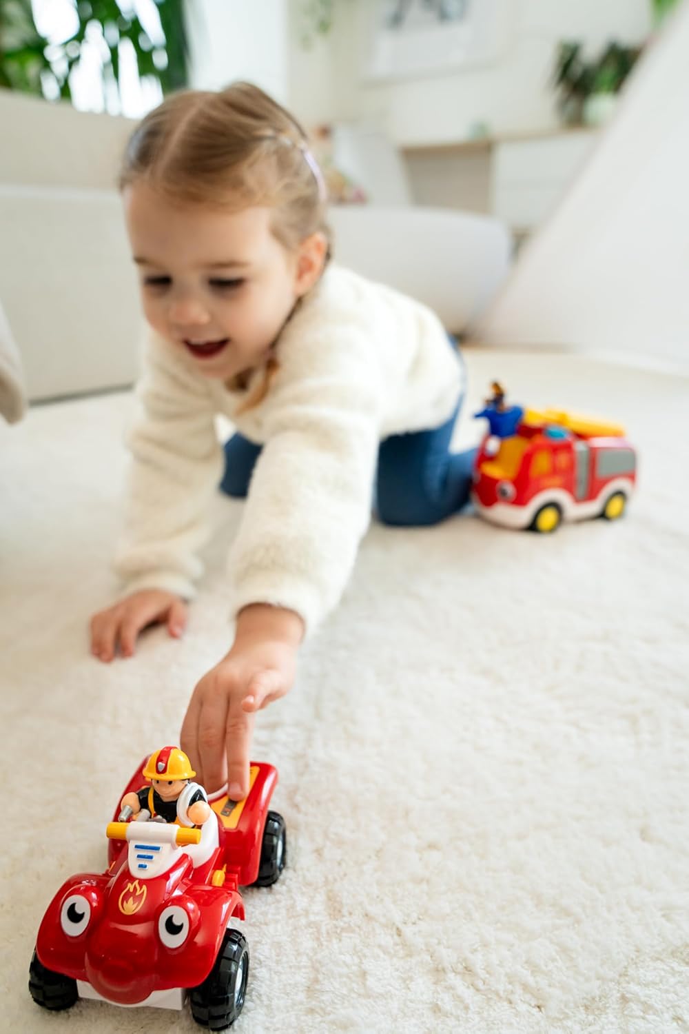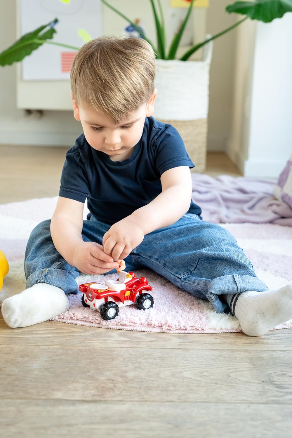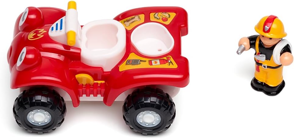 Carrozzina anti-incendio a spinta. Sospensioni oscillanti al movimento della carrozzina. Personaggi rimovibili di un pompiere e di un cane. Set da 3 pezzi.