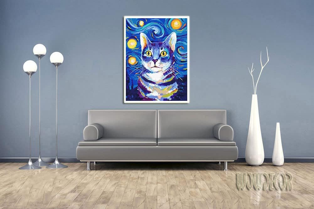 WOWDECOR Kit pittura con numeri per adulti e bambini, pittura ad olio fai da te, con gatto colorato cielo stellato, 40,6 x 50,8 cm (incorniciata)