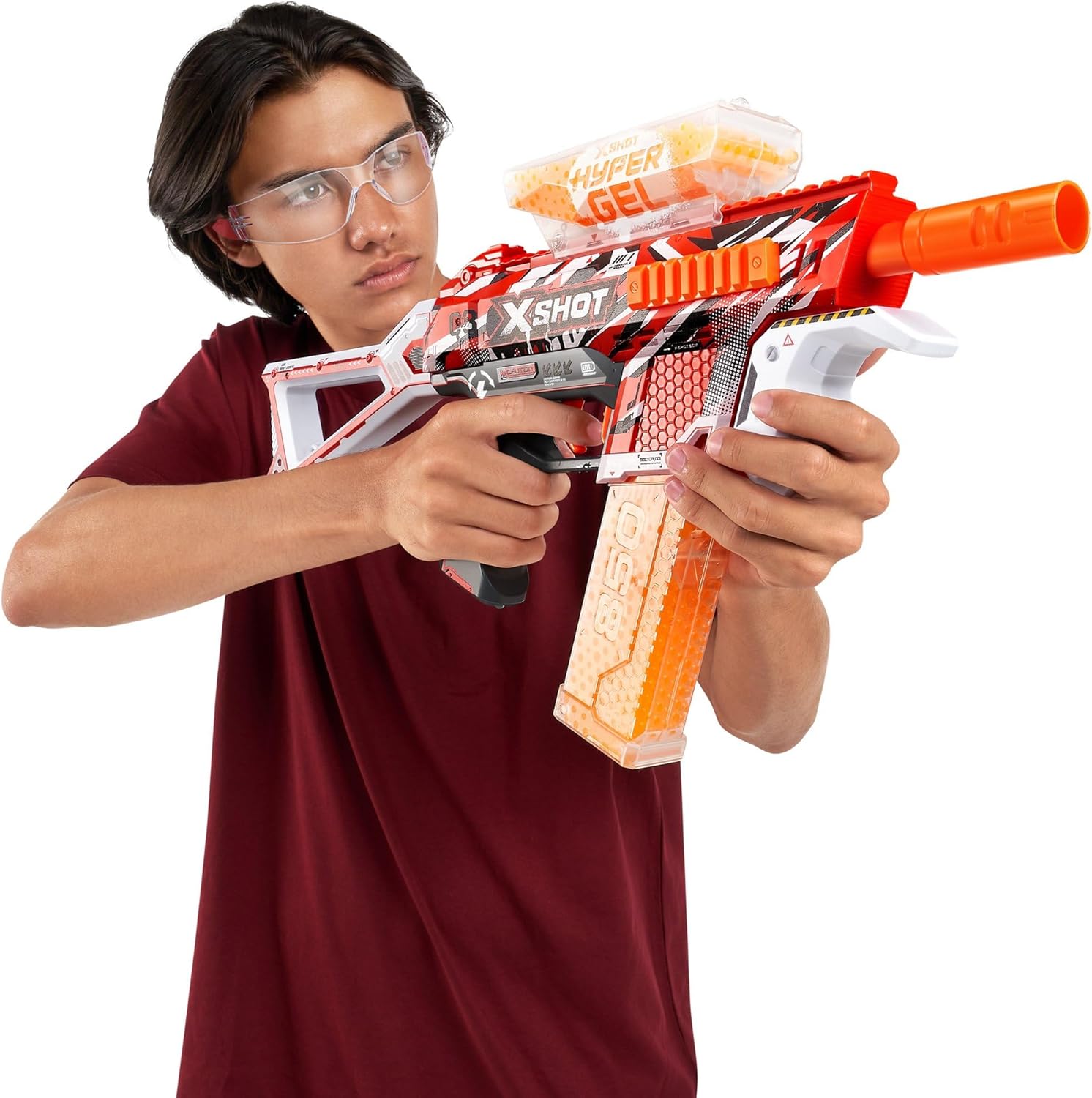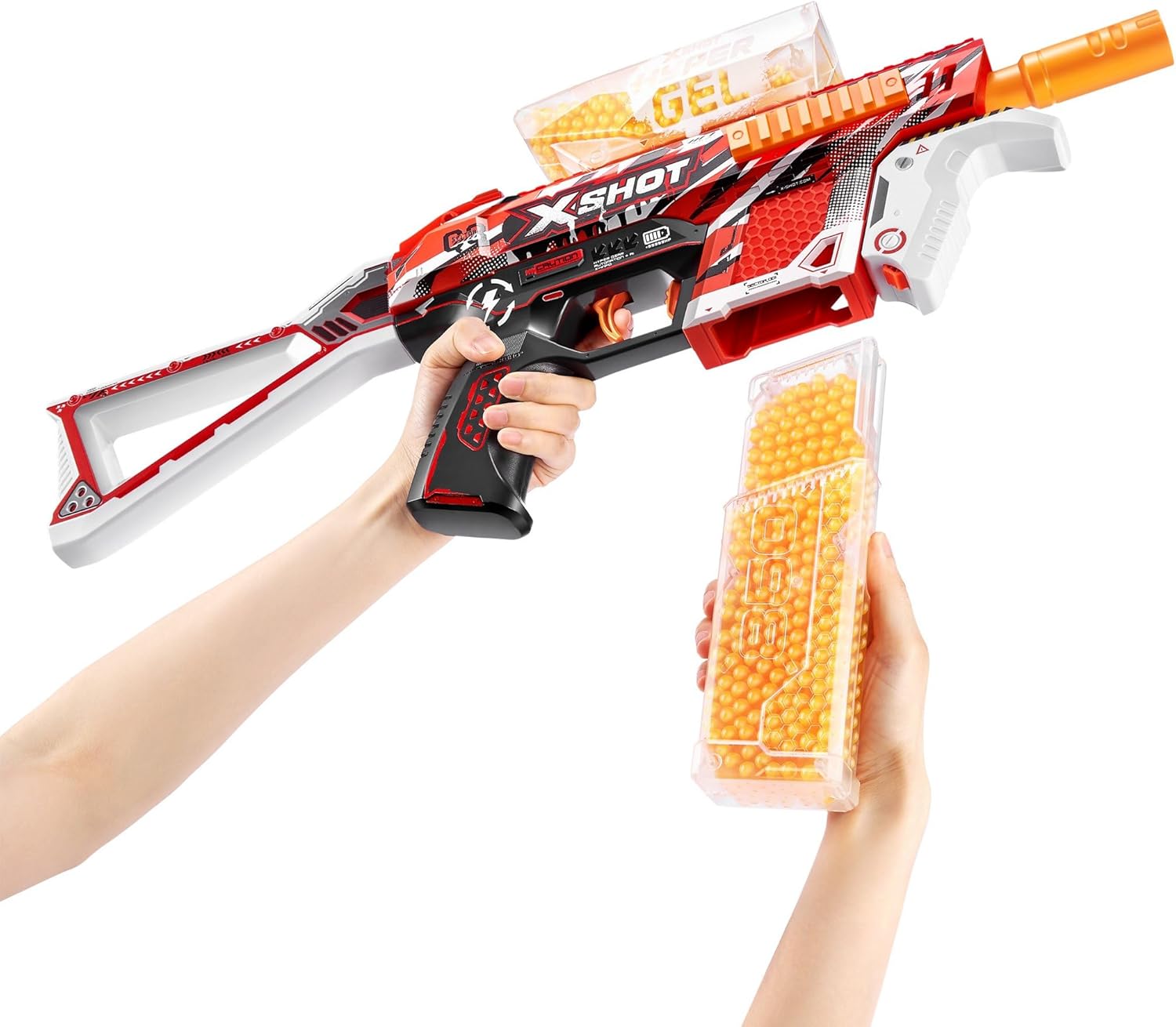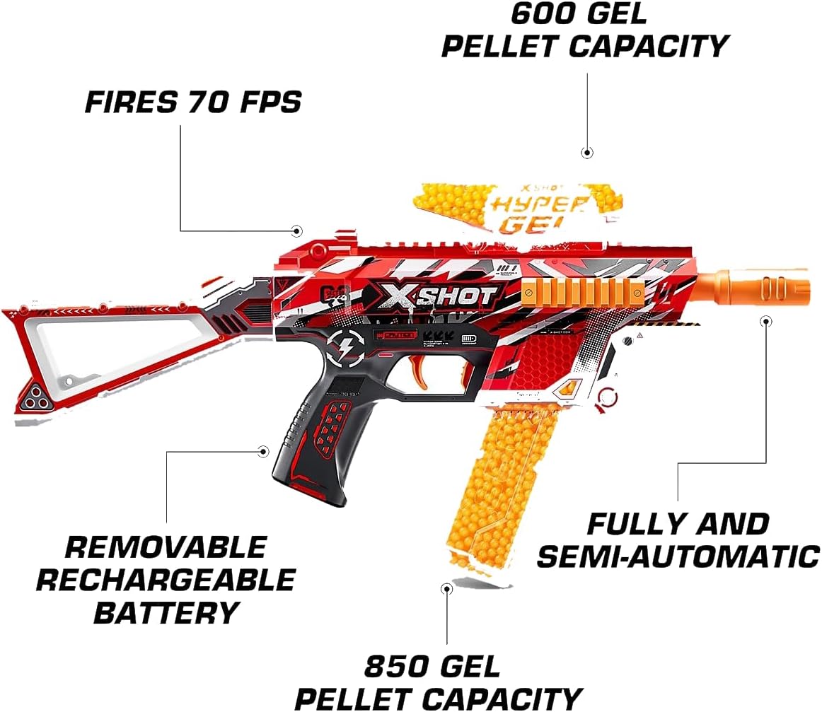A DESTRA: il blaster X-Shot Hyper Trace può sparare proiettili iper ad alta velocità: ottimo blaster per bambini e adolescenti dai 14 anni in su. MODALITÀ COMPLETAMENTE E SEMI-AUTOMATICA: Trace Fire Blaster ha una modalità motorizzata completamente e semi-automatica e una batteria ricaricabile. 2500 PELLET HYPER GEL INCLUSE: I pellet sono già idrogenati e quindi pronti per l'uso immediato, non è più necessario l'ammollo! Le palline sono atossiche, rispettose dell'ambiente e non lasciano macchie - adatte per uso interno! CAPACITÀ DI 1.600 HYPER BULLETS: Il Trace Fire Blaster ha una capacità del caricatore di 800 proiettili e un caricatore aggiuntivo con una capacità di altri 800 proiettili OCCHIALI PROTETTIVI PER GLI OCCHI: gli X-Shot Hyper Blasters sono dotati di occhiali di sicurezza